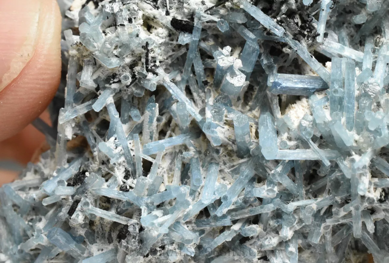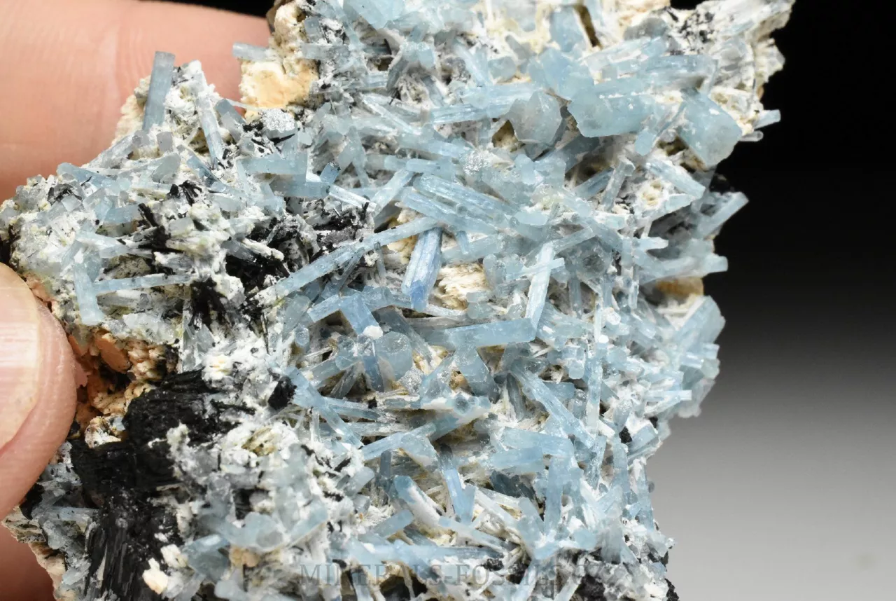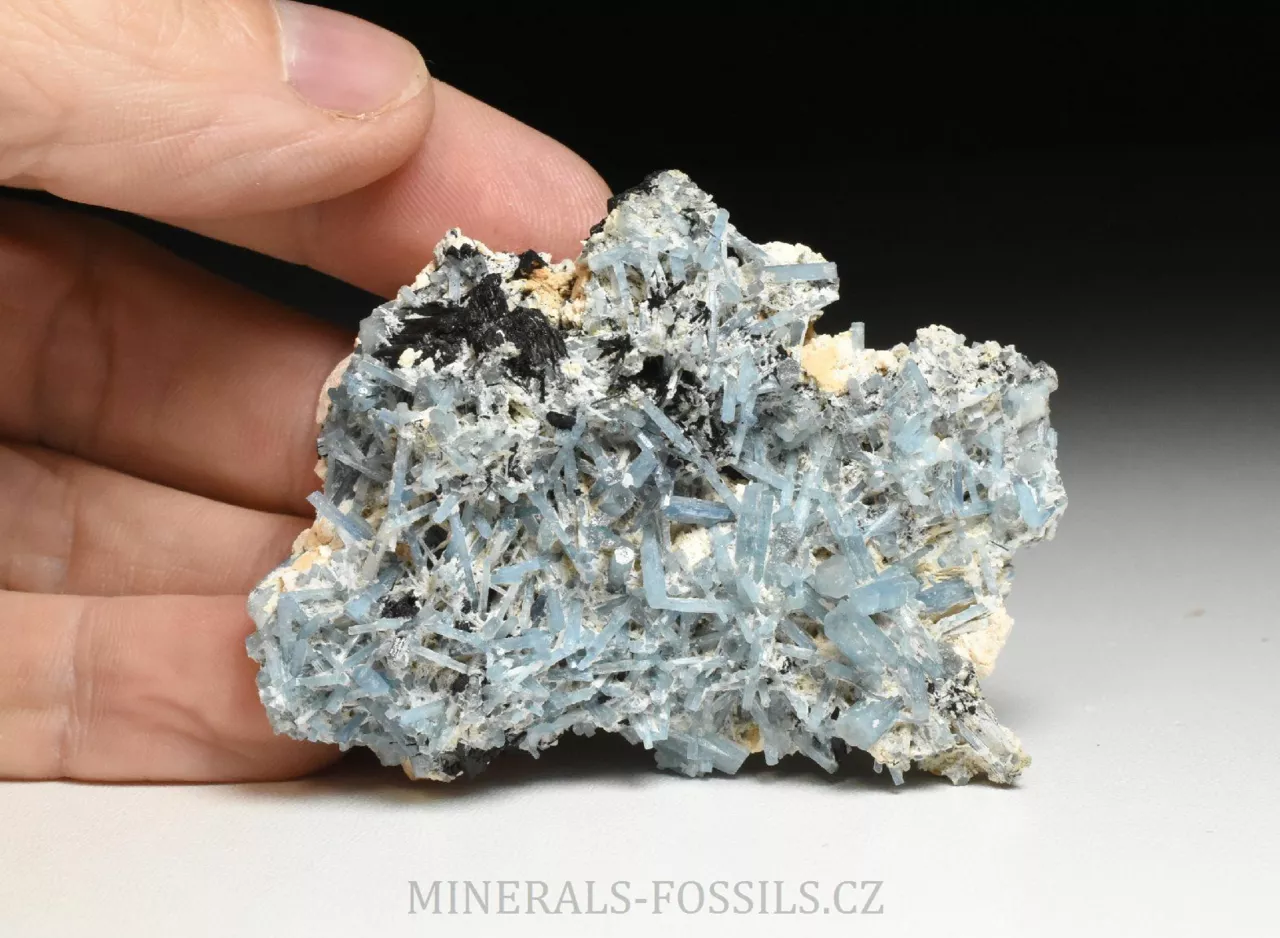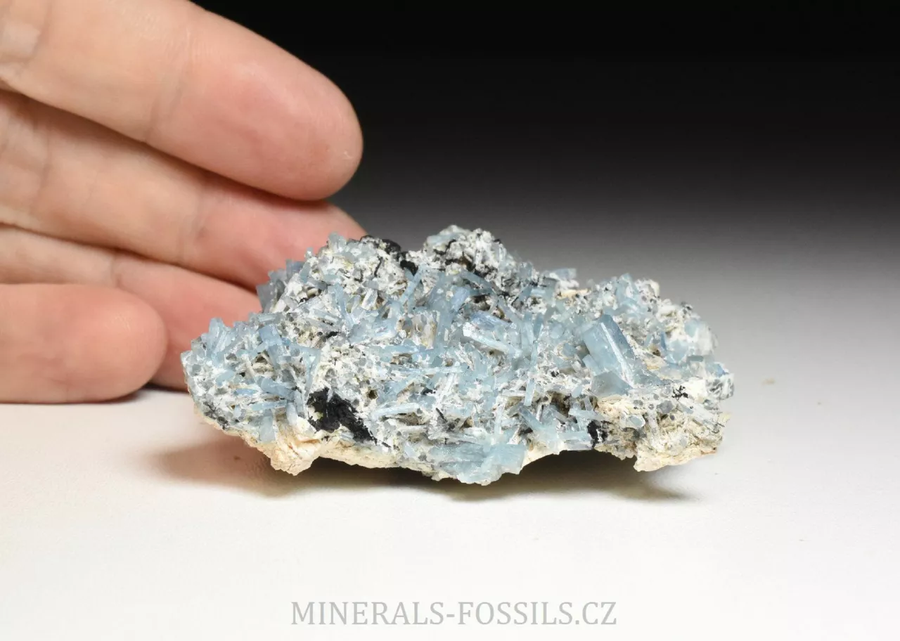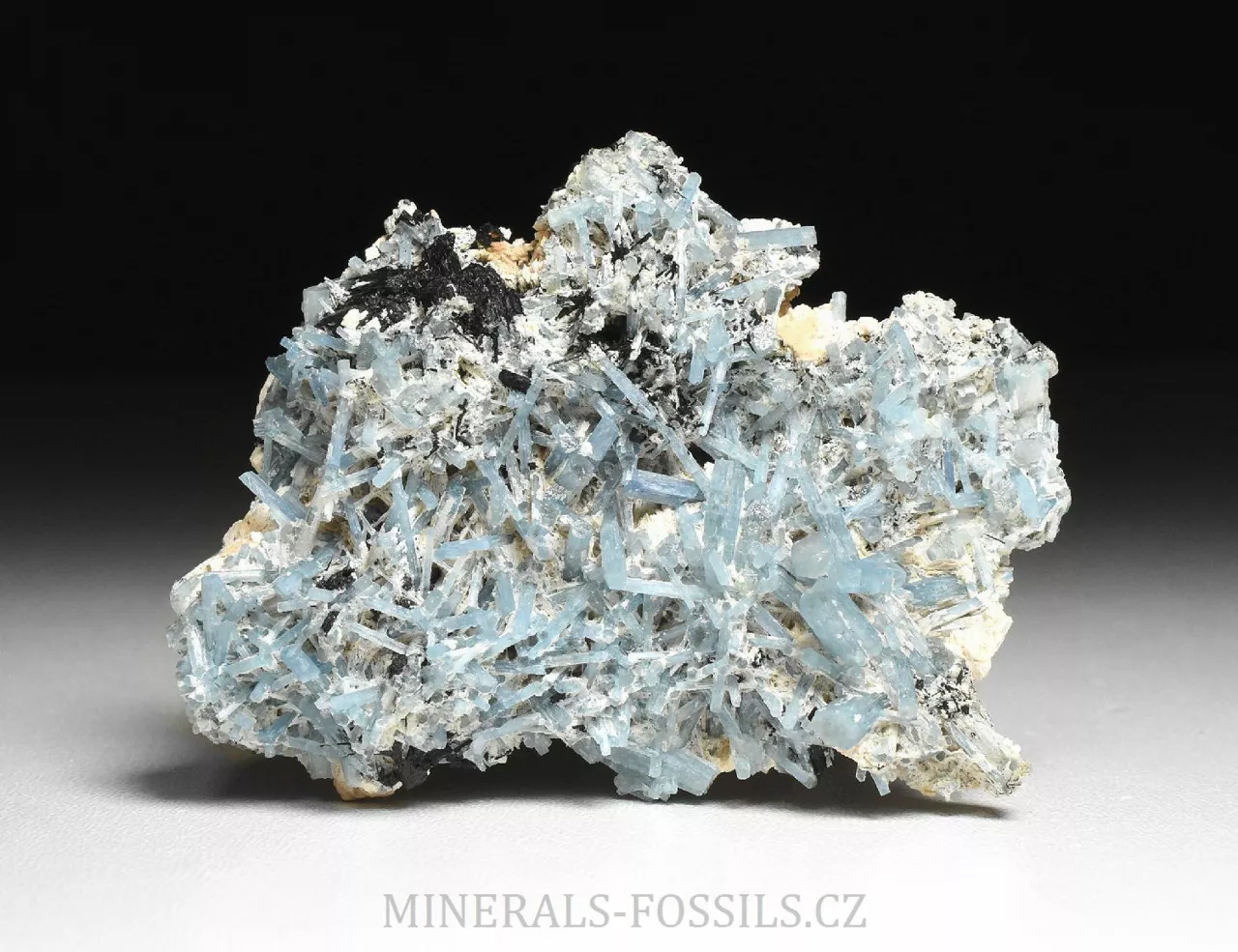 Mineralogická ukázka krystalů Akvamarínu z naleziště v okolí hory Erongo v Namíbii. Na tomto vzorku o rozměru 7 x 5 x 2,5 cm se vyskytují úzké, dlouze protažené akvamarínové krystaly v paragenezi s draselným živcem (ortoklasem) a černým turmalínem (skorylem). Krystaly skorylu a živce dohromady tvoří horninu, která je základem celého vzorku. Na skoryl a živec narůstají krystaly akvamarínu, které jsou jen 1-2 mm široké a zhruba do 1cm dlouhé, zakončené rovnou ploškou. Jsou nedokonale průhledné, spíše jen průsvitné, krystalové plošky jsou slabě lesklé. Barva je ovšem velice pěkná, světle modrá až safírově modrá. Jedná se o nový nález této formy akvamarínu z počátku roku 2026. Ačkoliv je akvamarín v této podobě "modrého koberce" znám již z minlosti, v poslední letech se v okolí hory Erongo takový akvamarín dlouho neobjevil.