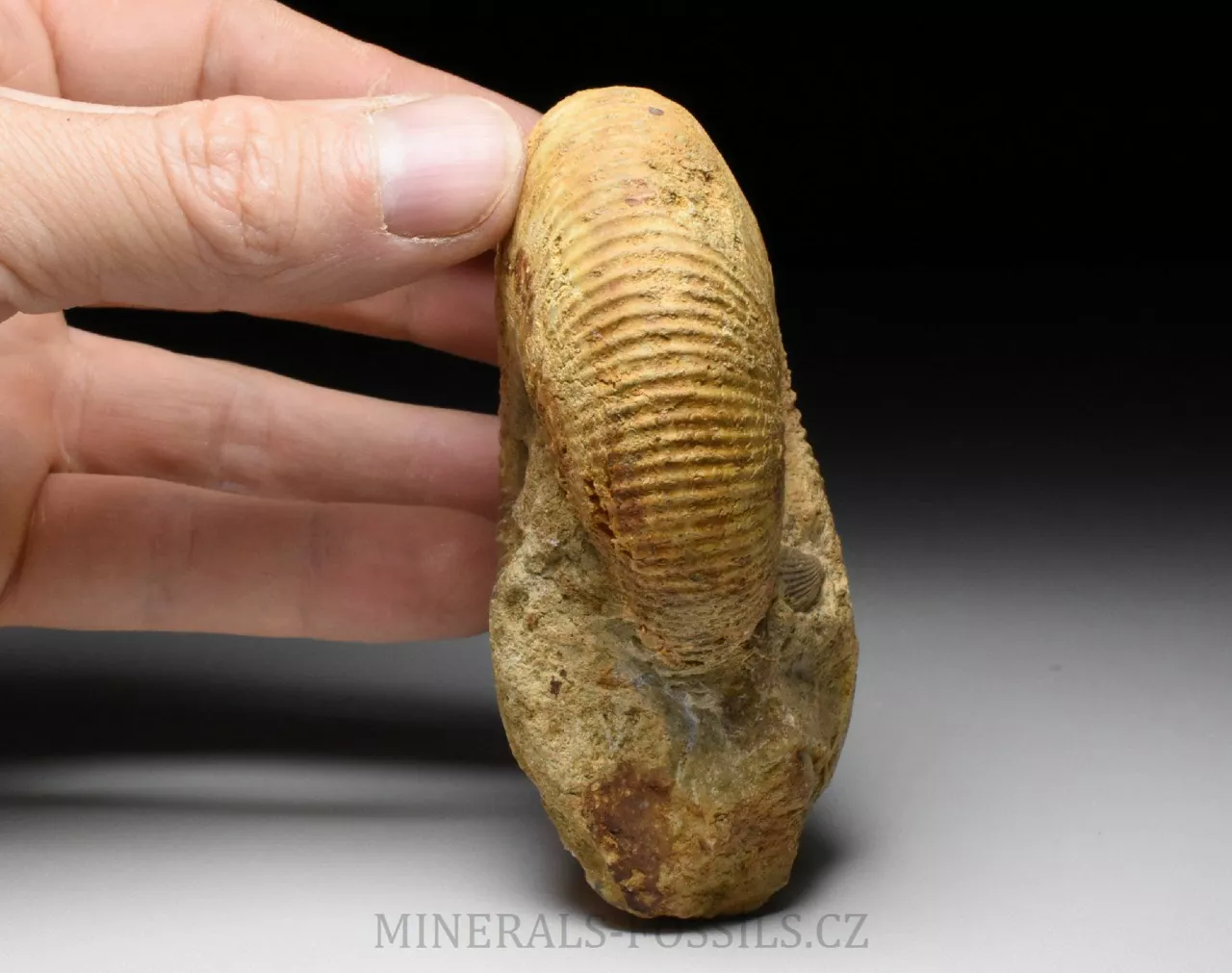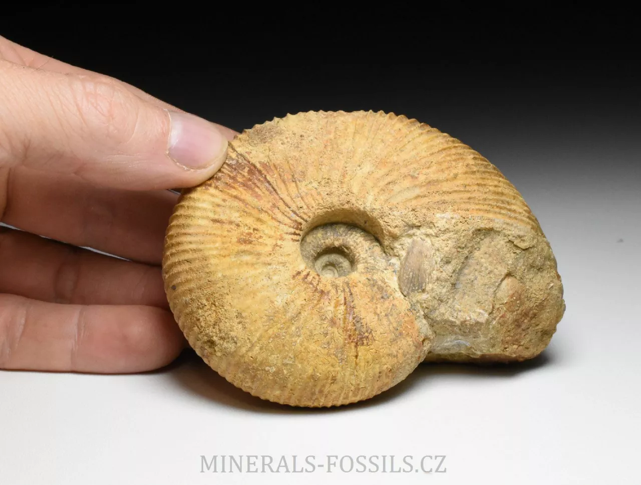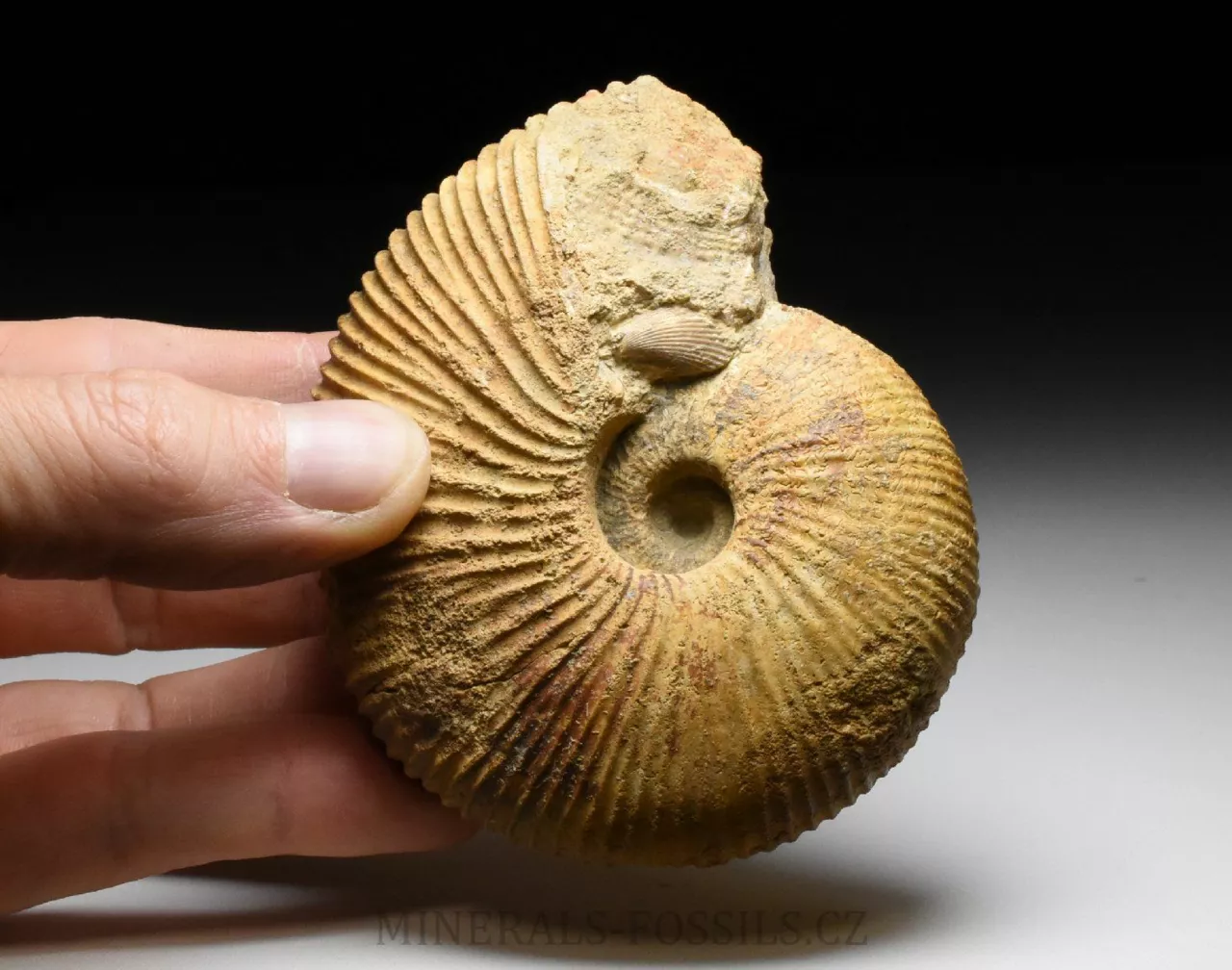 Zkamenělina amonita rodu Macrocephalites madagascariensis ze Švýcarské lokality Anwil. Tento amonit s robustní jemně žebrovanou schránkou je zachovalý v tvrdém písčitém vápenci okrové barvy. Schránka amonita je trojrozměrně zachovalá, bez diagenetické deformace (zkamenělina tak má původní tvar jako v životní podobě). Amonit má z jedné strany velmi dobře zachovalý a viditelný střed (ten často bývá trošku problém při preparaci), na kousku horniny najdeme i zbytky fosliních mlžů (zřejmě Lima sp. a částečný otisk Trigonia sp.). Vzhledem k lokalitě nálezu se jedná o sběratelsky cenný kus. Jakékoliv fosílie ze Švýcarska jsou vzhledem ke stavu lokalit a legislativě ochrany přírody velmi ceněné a nedostupné. Vzorek pochází ze staré sbírky sbírané cca od roku 1950.