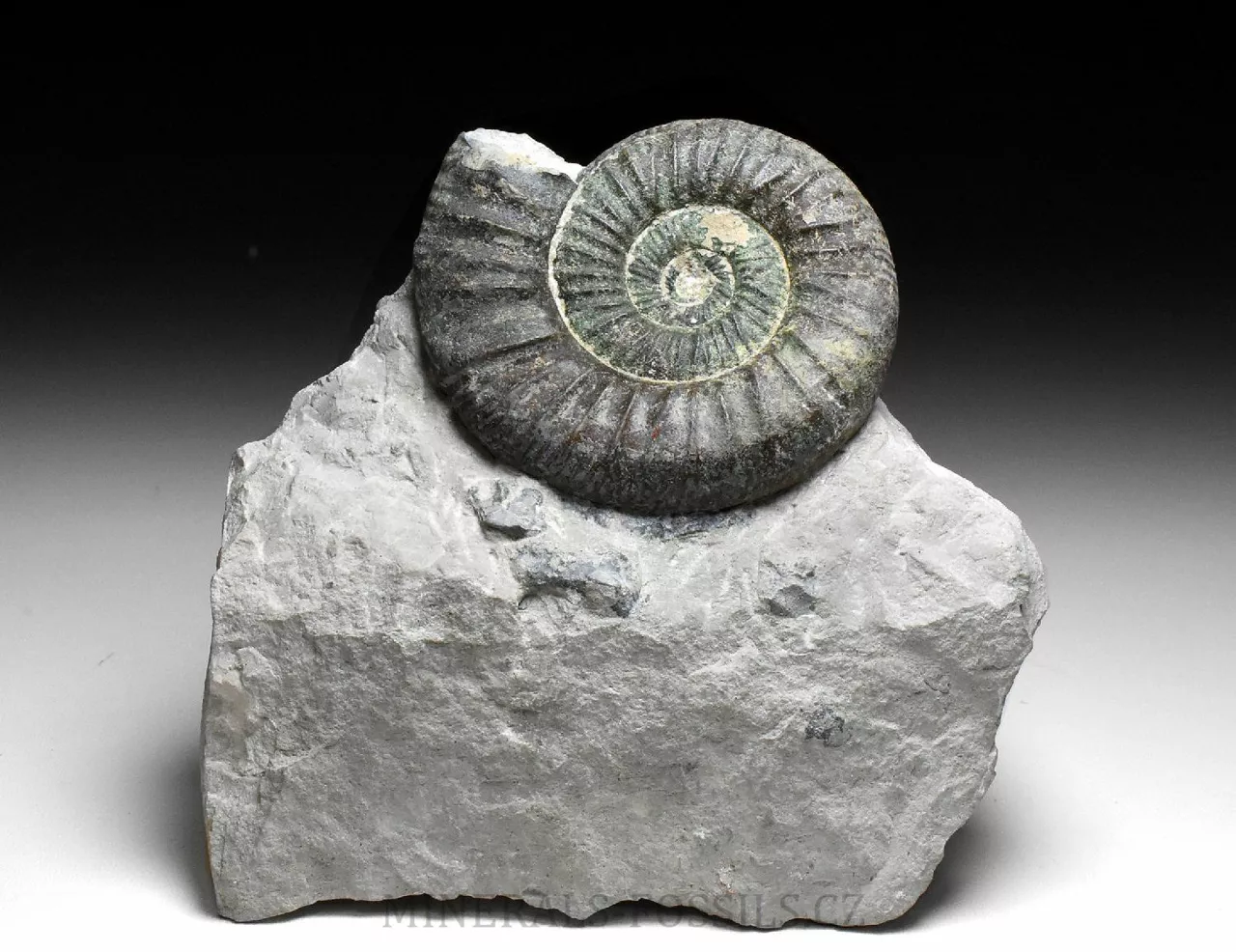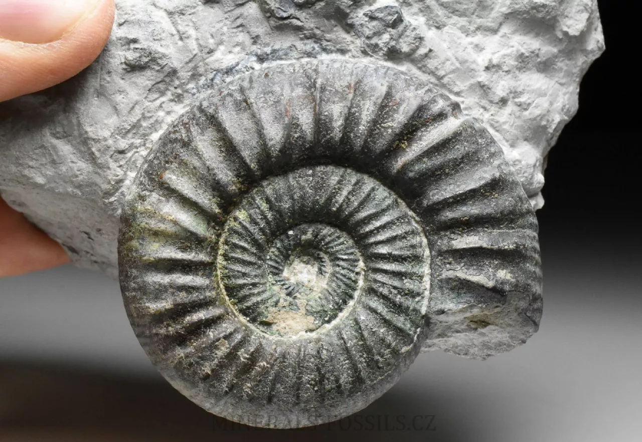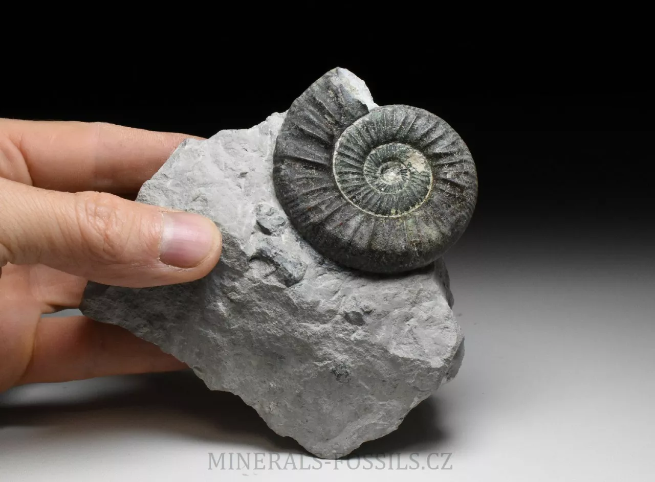 Zkamenělina amonita rodu Ortosphinctes tiziani z německé Lokality Grafenberg v Bavorsku. Amonit o své celkové velikosti 6 cm má přirozeně vzniklé tmě zelené zbarvení. To je způsobené minerálem Glaukonitem, který vznikal v druhohorních mořích srážením železaz z mořské vody (místo žlutého limonitu, který známe zejména z prvhorních sedimentů, mívají druhohorní fosílie zelené zbarvení). Amonit je vyprapraovaný z horniny, krásně trojrozměrně zachovalý až do samotného středu. Samotná kámen, který má rozměry 11 x 10 x 6 cm je ze spodu zbroušený tak, aby stál bez použití stojánku.