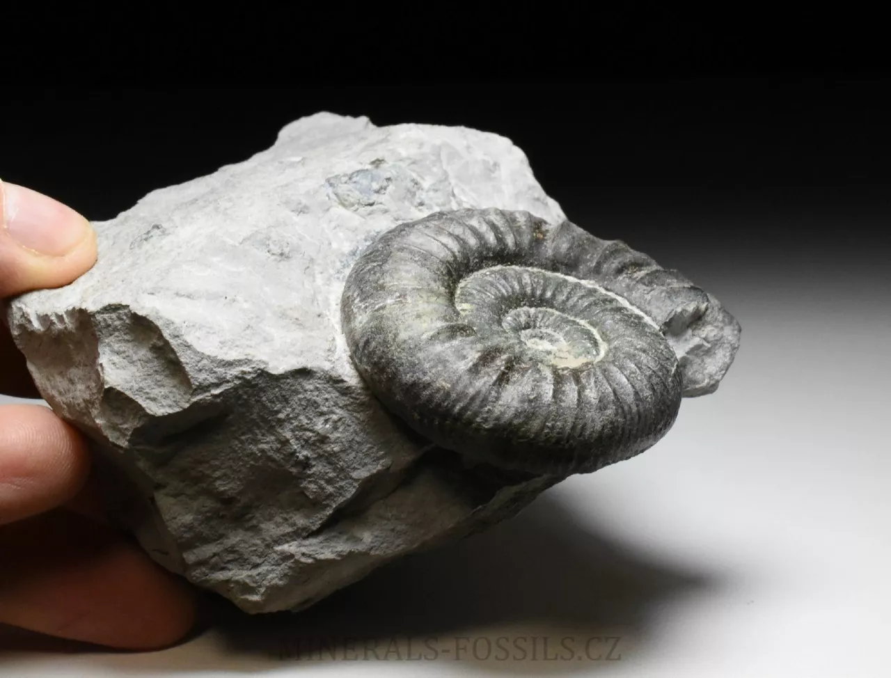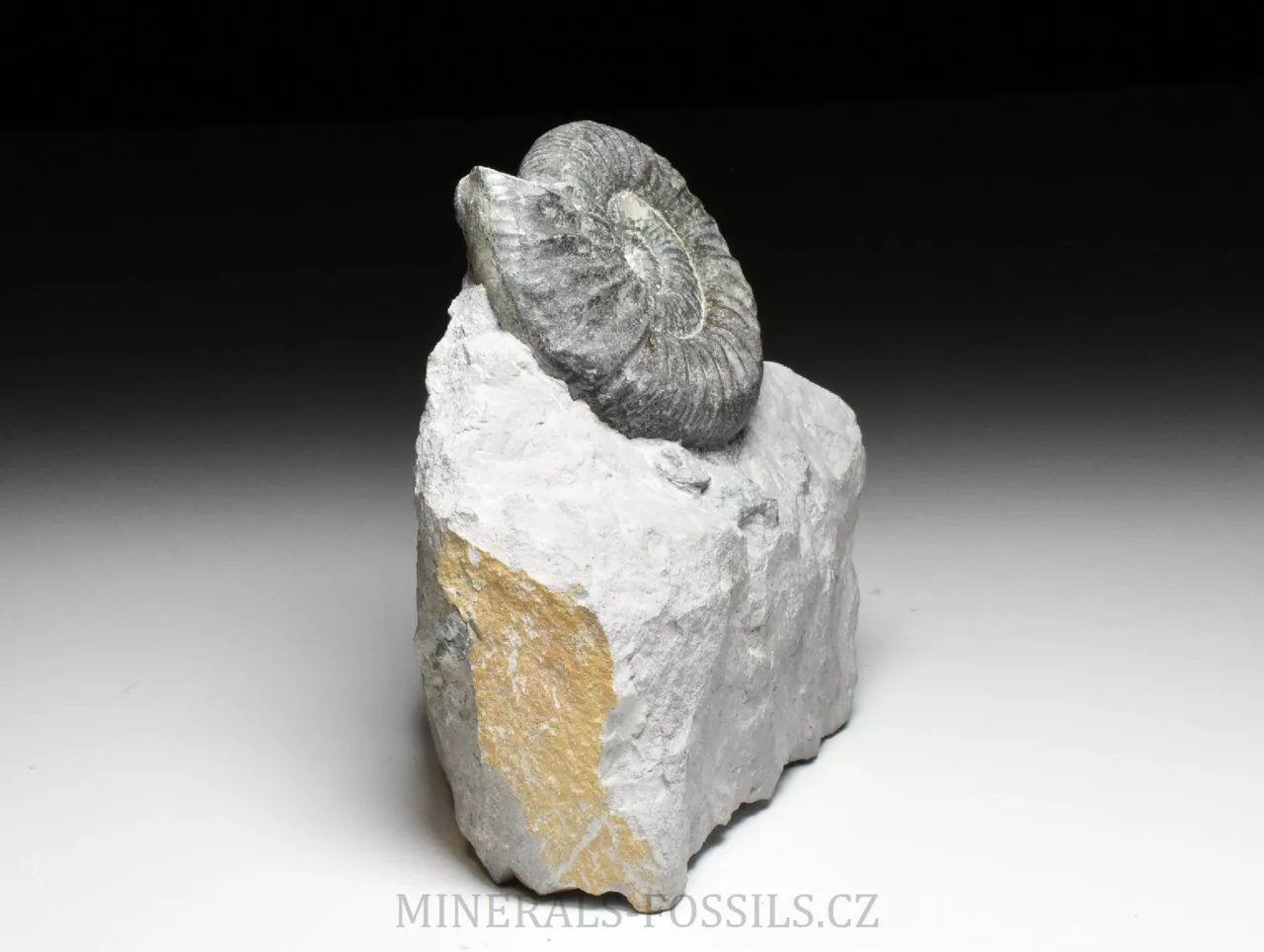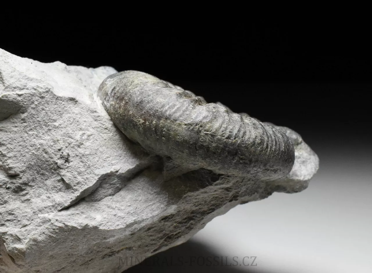 Zkamenělina amonita rodu Ortosphinctes tiziani z německé Lokality Grafenberg v Bavorsku. Amonit o své celkové velikosti 6 cm má přirozeně vzniklé tmě zelené zbarvení. To je způsobené minerálem Glaukonitem, který vznikal v druhohorních mořích srážením železaz z mořské vody (místo žlutého limonitu, který známe zejména z prvhorních sedimentů, mívají druhohorní fosílie zelené zbarvení). Amonit je vyprapraovaný z horniny, krásně trojrozměrně zachovalý až do samotného středu. Samotná kámen, který má rozměry 11 x 10 x 6 cm je ze spodu zbroušený tak, aby stál bez použití stojánku.