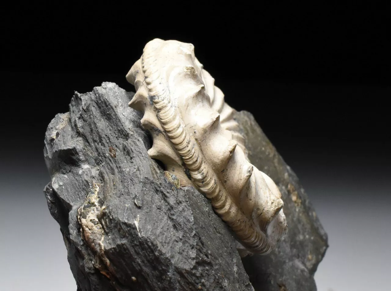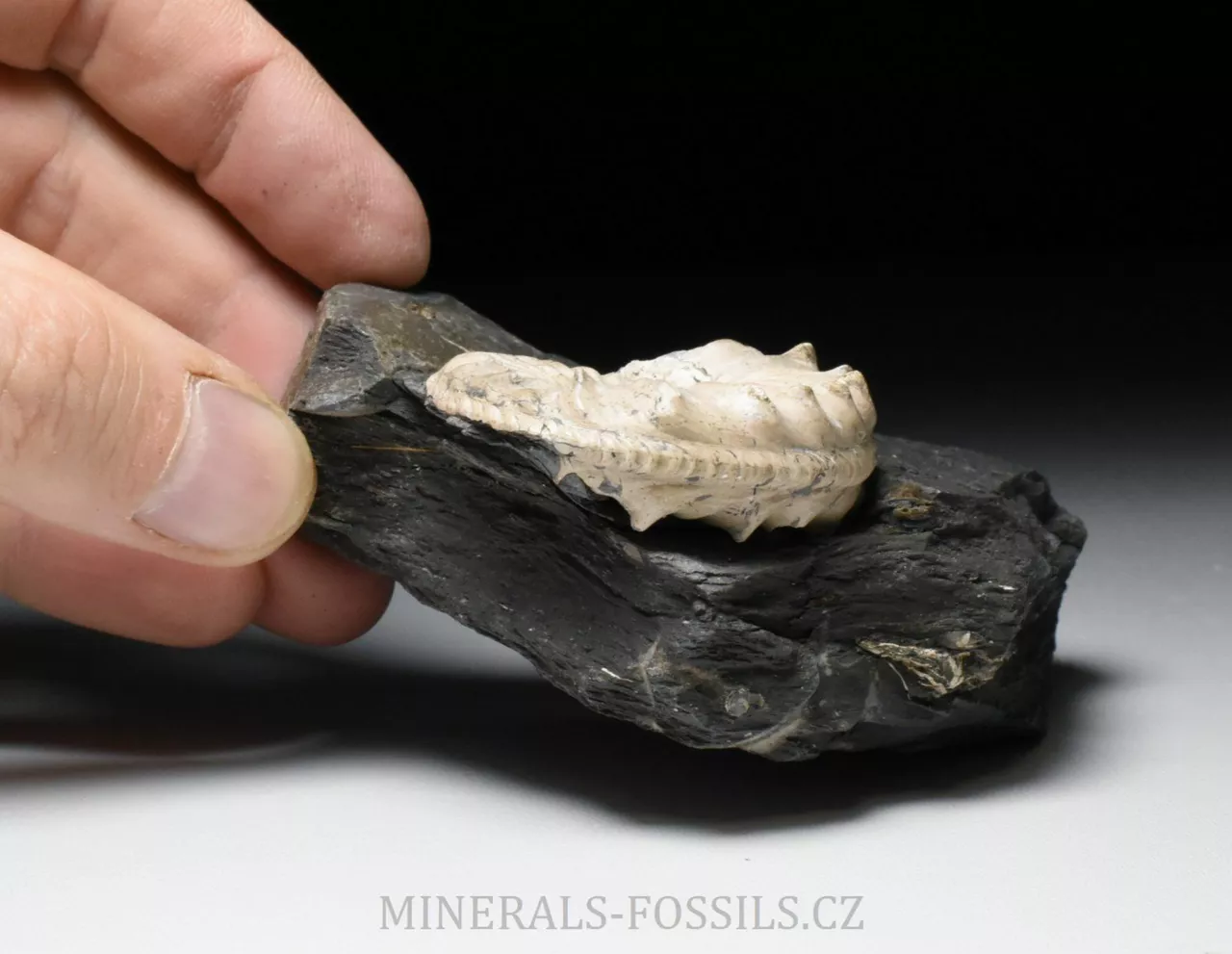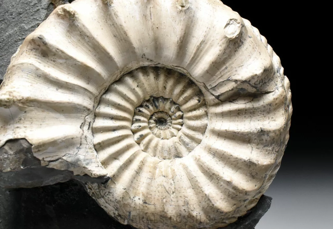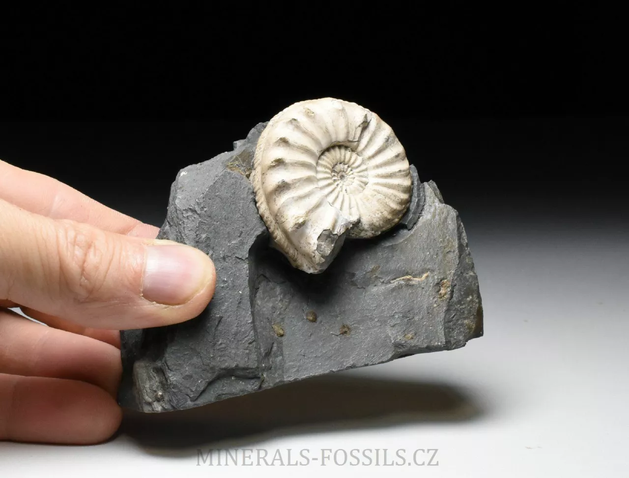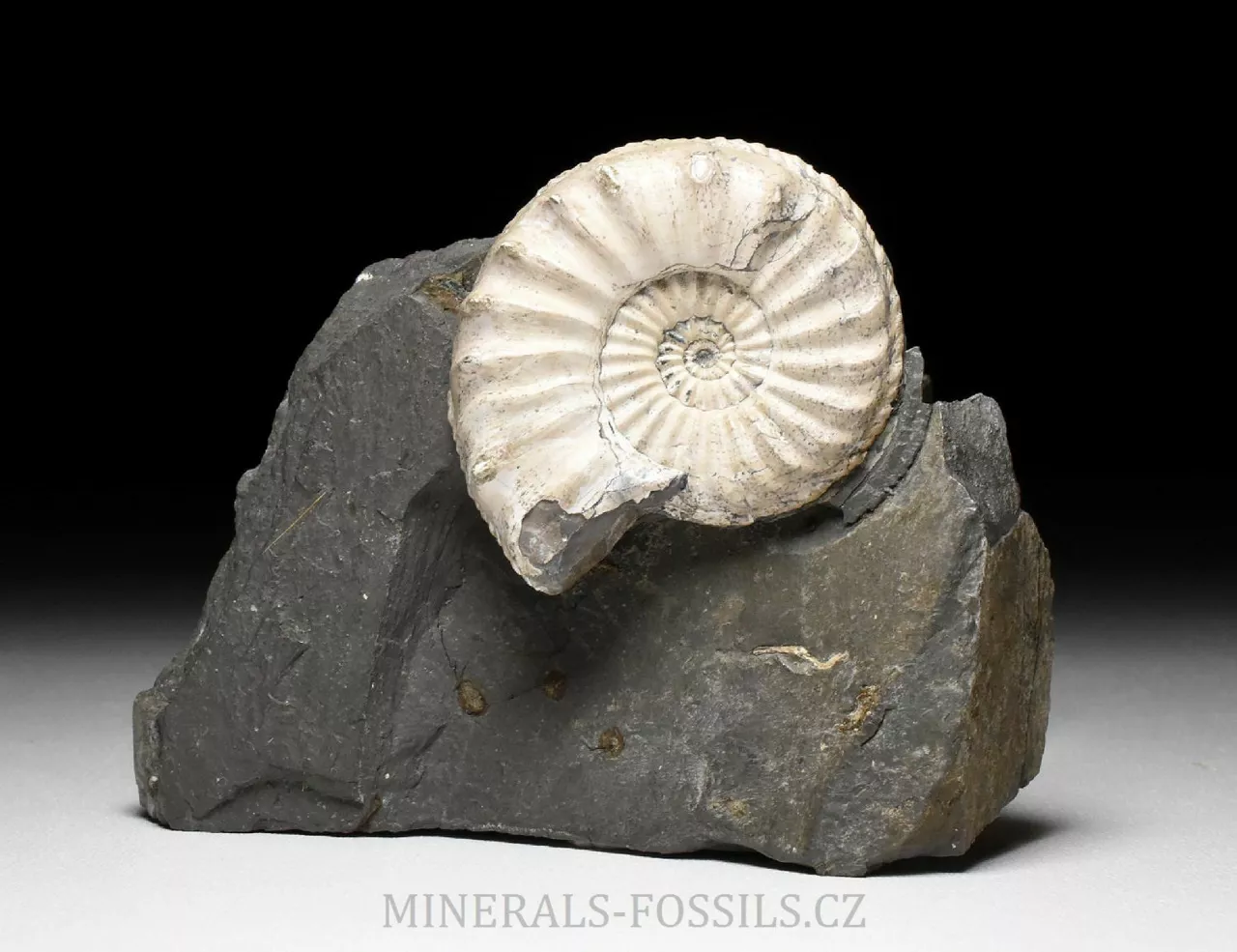 Zkamenělina amonita rodu Pleuroceras spinatum z lokality Buttenheim v Německu. Tento amonit s ostnatými výrustky umístěnými po vnějšímm obvodu schránky je zachovalý v tmavě šedém slínovci. Barva zkameněliny je oproti hornině velmi kontrastní, téměř bílá a slabě lesklá. Tento exemplář, který dosahuje velikosti schránky lehce přes 5 cm již patří k nadprůměrně velkým kusům. Má výborně zachovalý střed a je v podstatě kompletní. Při detailním pozorování zjistíme, že schránka má částečně zachovalé původní zbarvení v podobě tenkých paralelně uspořádaných tmavých linií. Celý kámen má rozměry 10 x 8 x 3 cm a ze spodu je zbroušený tak, aby mohl stát bez stojánku.
