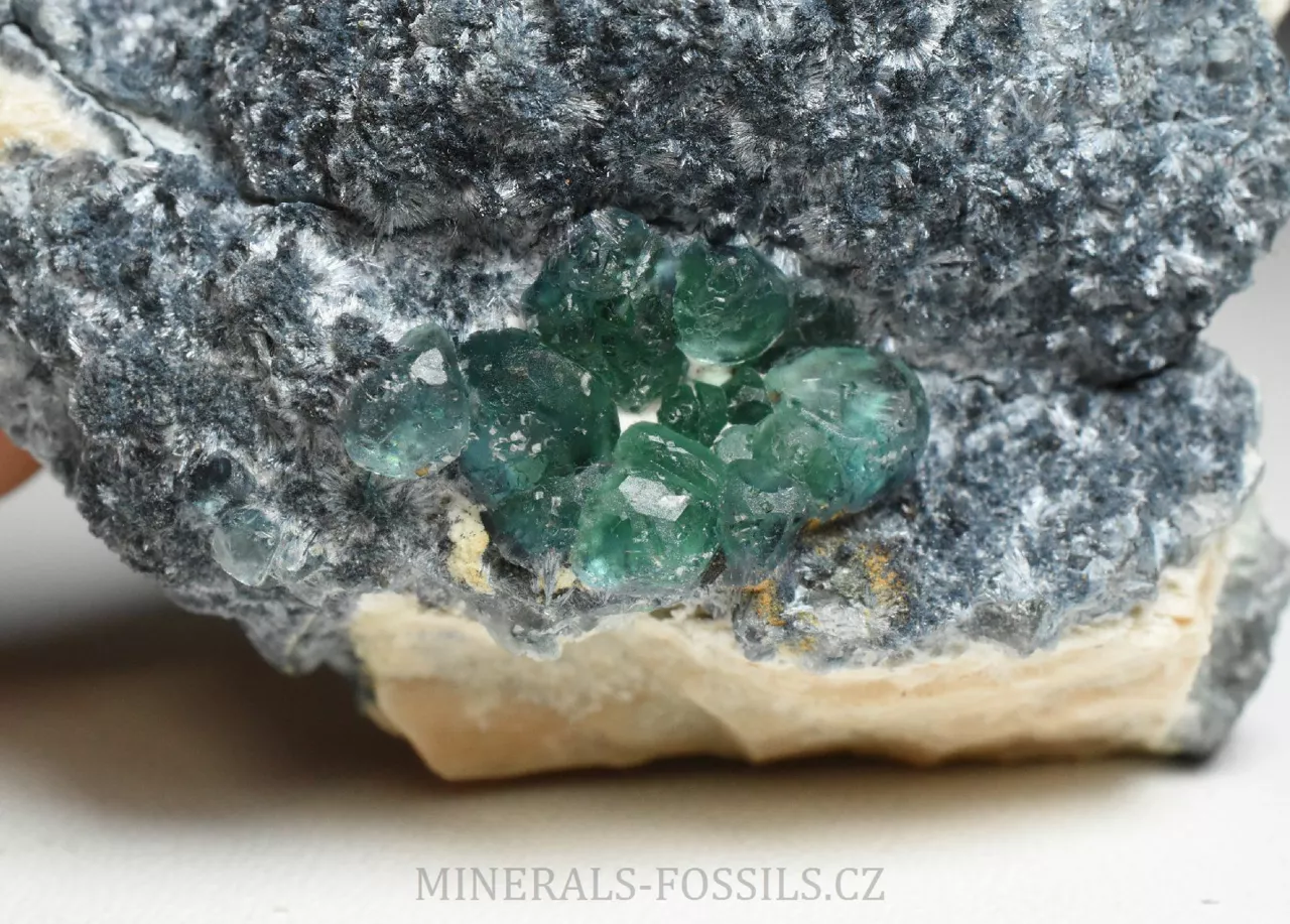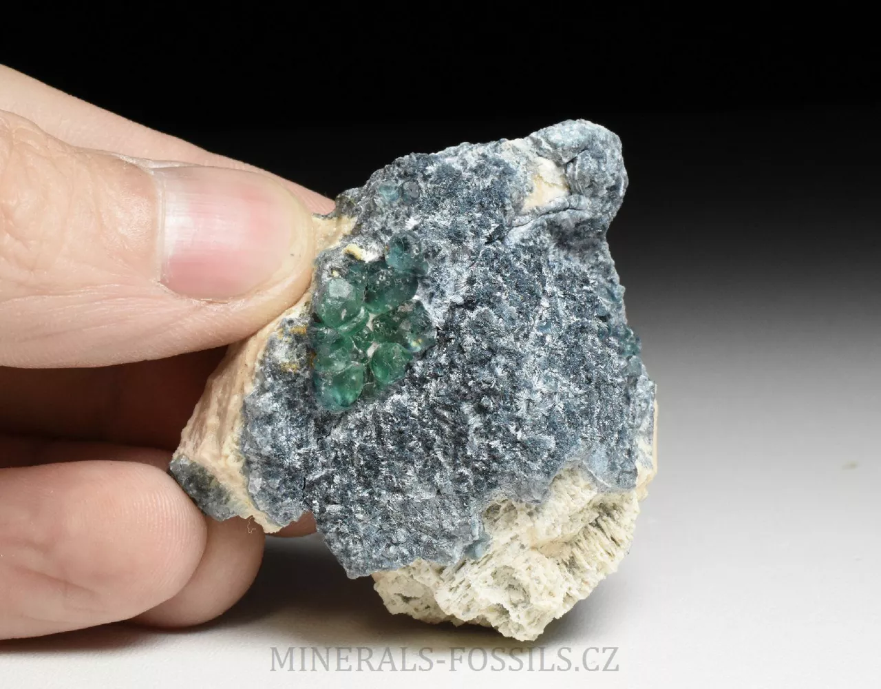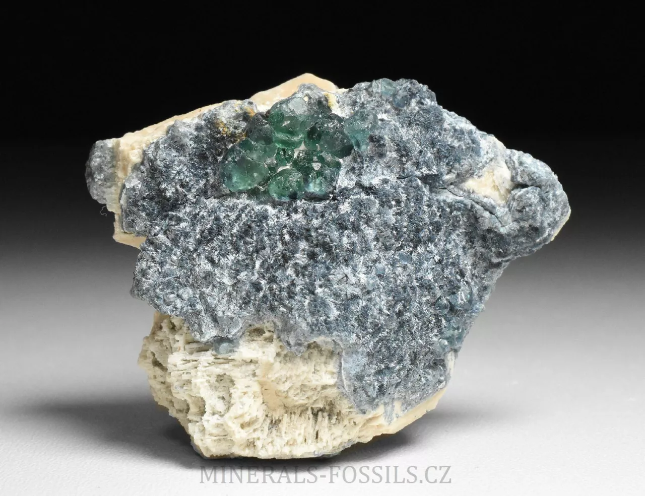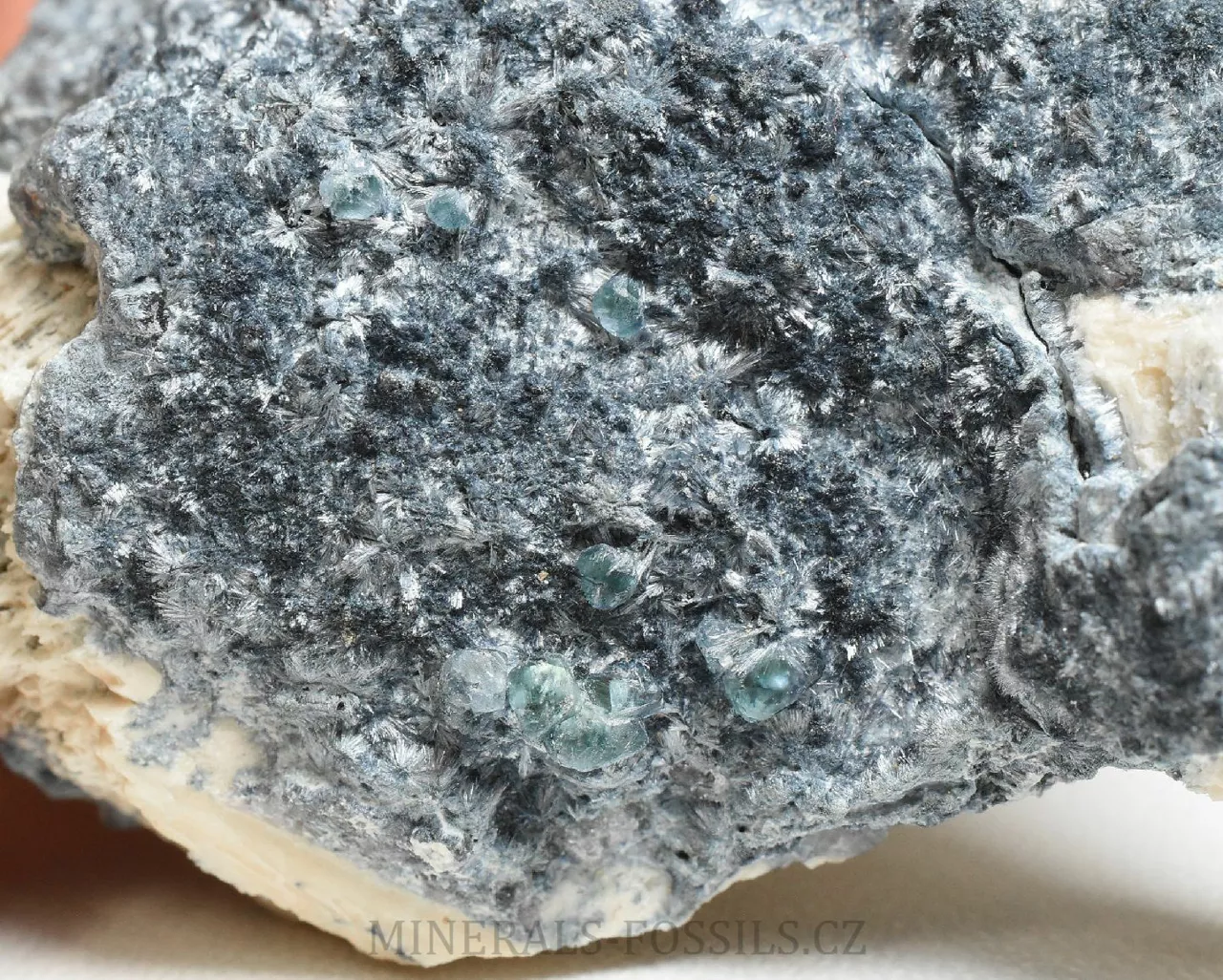 Mineralogická ukázka minerálu foititu v kombinaci s živcem (ortoklasem) a fluoritem. Foitit je vzácný minerál skupiny turmalínu, vytváří mikroskopické jehlicovité krystaly modro-šedé barvy. Jedná se o nový nález z oblasti Erongo v Namibii počátkem roku 2026. Tento vzorek o rozměru 5,5 x 4,5 x 2 cm představuje fragment krystalu ortoklasu, který je porostlý modro-šedým foititem. Kromě foititu na vzorku najdeme i ozdobu v podobě několika asi 5mm velkých krystalů zeleného fluoritu. Foitit je svým složením velmi podobný skorylu, který je v místních pegmatitech jedním z hlavních minerálů, narozdíl od něj však neobsahuje sodíkový kationt, který je nahrazen hliníkem. Vytváří pouze mikroskopické krystaly. Foitit může vznikat přeměnou původního skorylu, nebo může skoryl fázově přecházet do foititu v rámci jednoho krystalu.