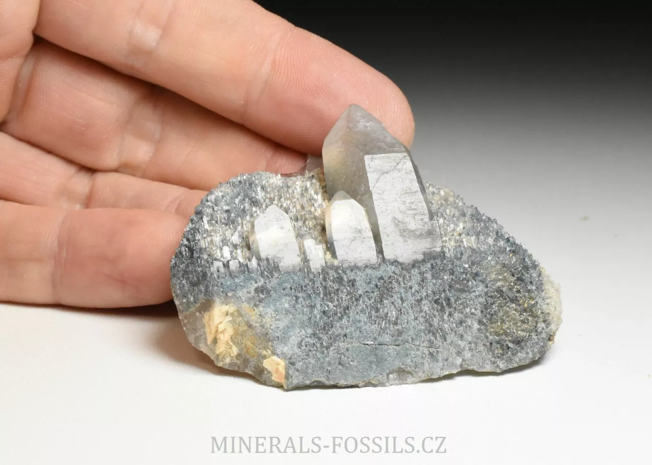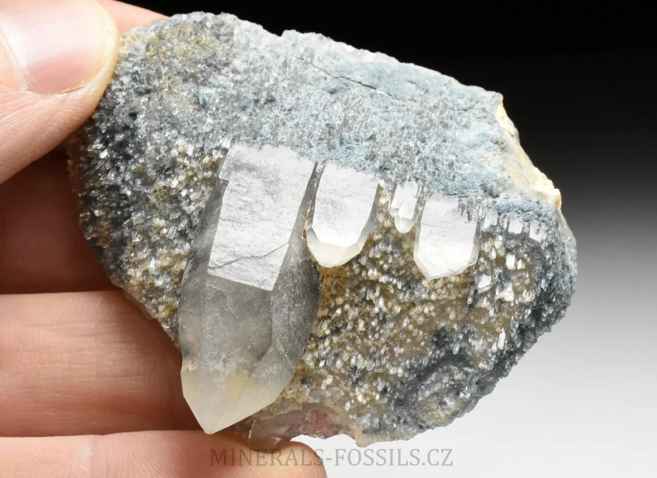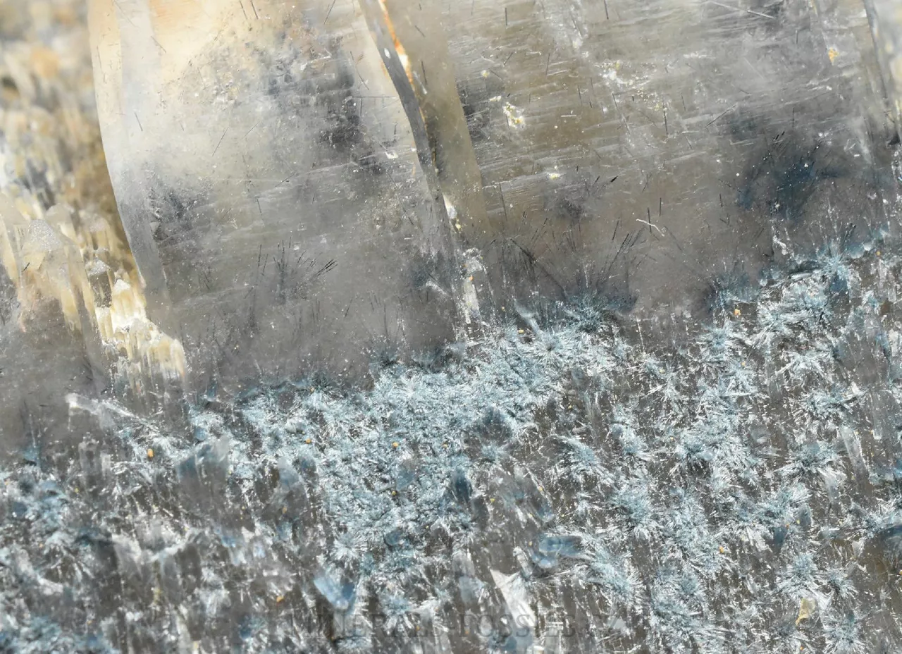Mineralogická ukázka minerálu foititu v kombinaci s krystaly křemene. Foitit je vzácný minerál skupiny turmalínu, vytváří mikroskopické jehlicovité krystaly modro-šedé barvy. Jedná se o nový nález z oblasti Erongo v Namibii počátkem roku 2026. Tento vzorek o rozměru 6 x 5 x 2 cm představuje původní krystal křemene, který je následně porostlý modro-šedým foititem. Na foitit pak později narostla další generace krystalů křemene (všechny jsou paralaleně uspořádané v jednom směru), původní foitit je do těchto krystalů částečně zarostlý a probarvje tyto krystaly křemene do tmavě modré barvy. Foitit je svým složením velmi podobný skorylu, který je v místních pegmatitech jedním z hlavních minerálů, narozdíl od něj však neobsahuje sodíkový kationt, který je nahrazen hliníkem. Vytváří pouze mikroskopické krystaly. Foitit může vznikat přeměnou původního skorylu, nebo může skoryl fázově přecházet do foititu v rámci jednoho krystalu.