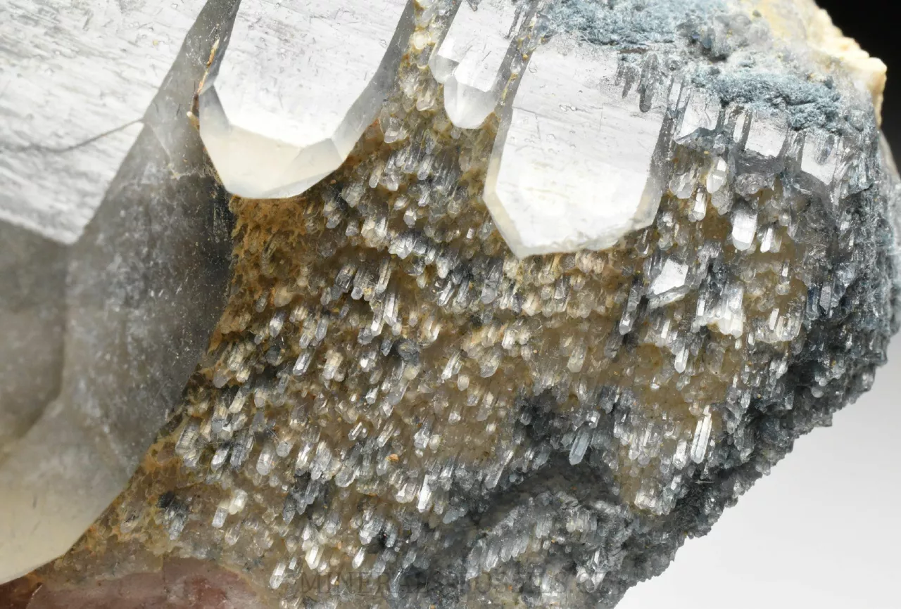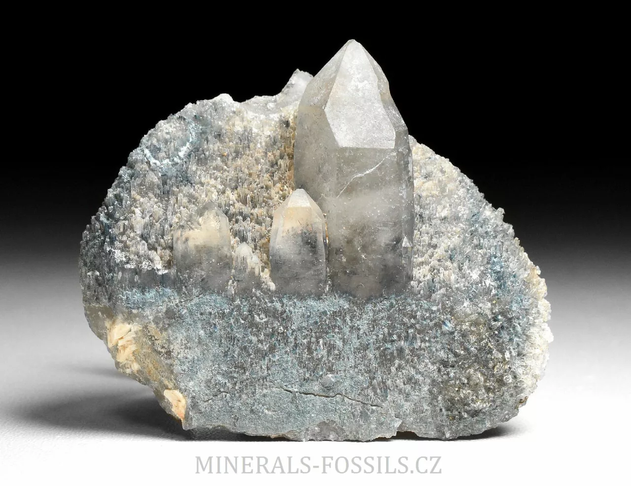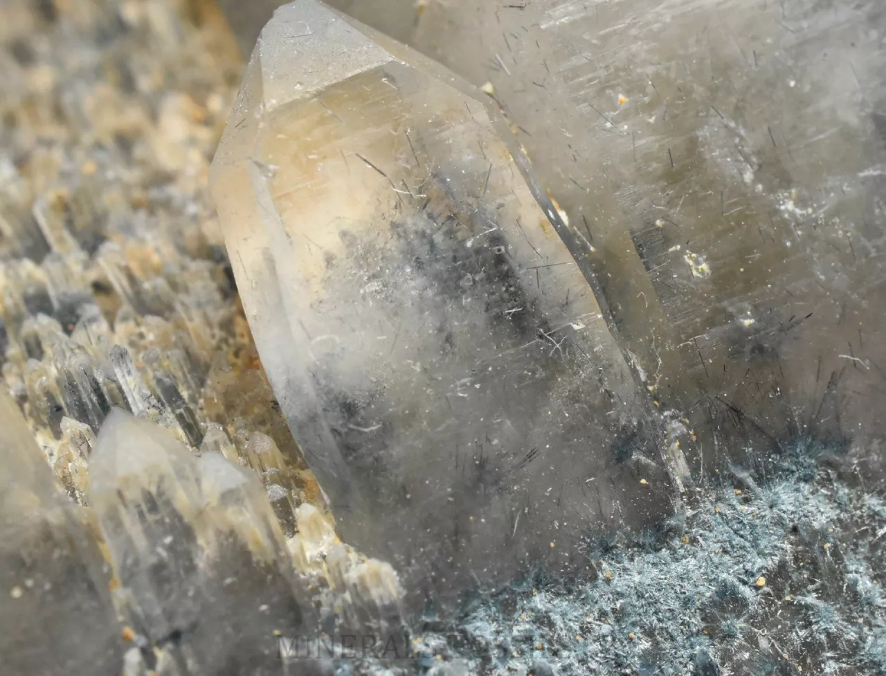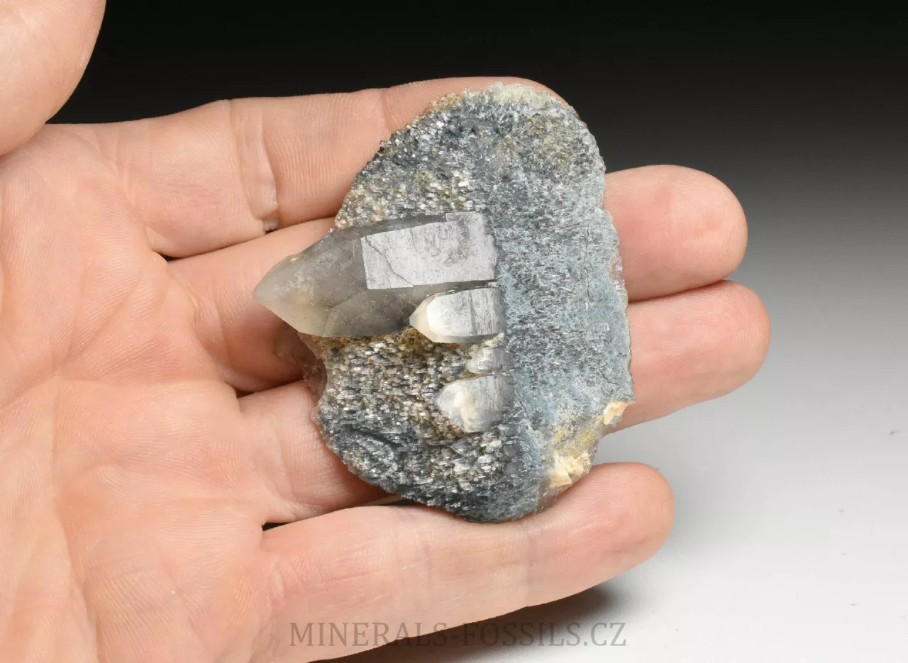 Mineralogická ukázka minerálu foititu v kombinaci s krystaly křemene. Foitit je vzácný minerál skupiny turmalínu, vytváří mikroskopické jehlicovité krystaly modro-šedé barvy. Jedná se o nový nález z oblasti Erongo v Namibii počátkem roku 2026. Tento vzorek o rozměru 6 x 5 x 2 cm představuje původní krystal křemene, který je následně porostlý modro-šedým foititem. Na foitit pak později narostla další generace krystalů křemene (všechny jsou paralaleně uspořádané v jednom směru), původní foitit je do těchto krystalů částečně zarostlý a probarvje tyto krystaly křemene do tmavě modré barvy. Foitit je svým složením velmi podobný skorylu, který je v místních pegmatitech jedním z hlavních minerálů, narozdíl od něj však neobsahuje sodíkový kationt, který je nahrazen hliníkem. Vytváří pouze mikroskopické krystaly. Foitit může vznikat přeměnou původního skorylu, nebo může skoryl fázově přecházet do foititu v rámci jednoho krystalu.