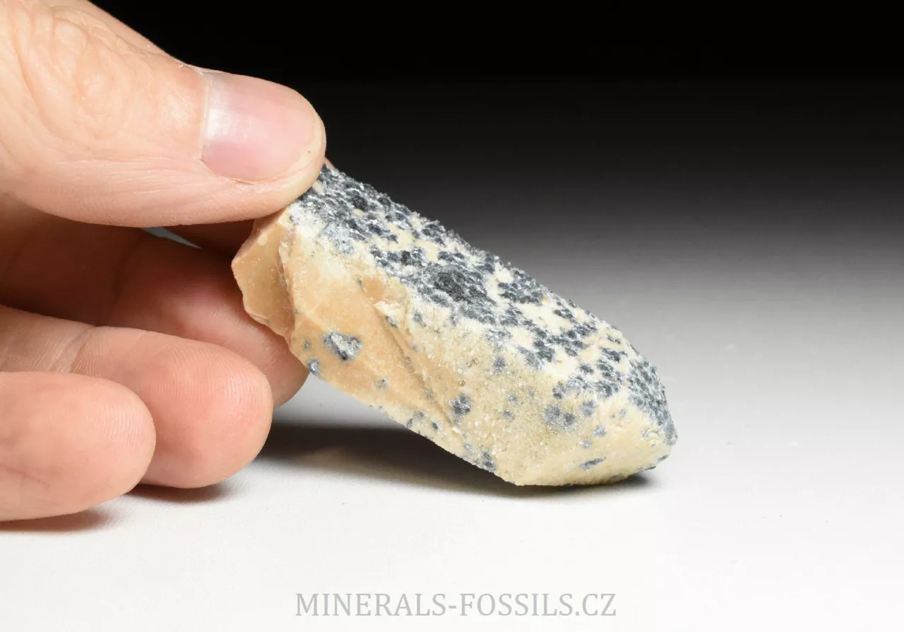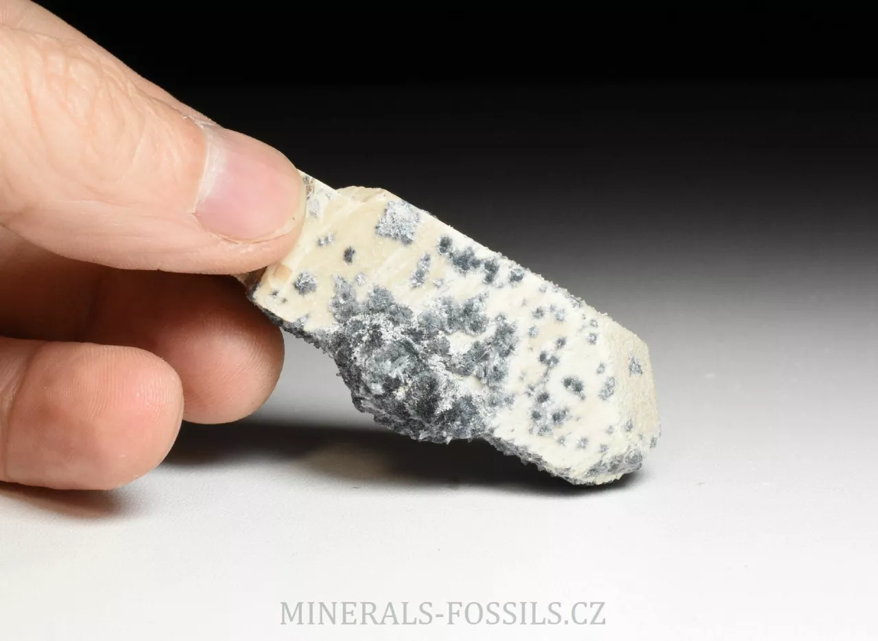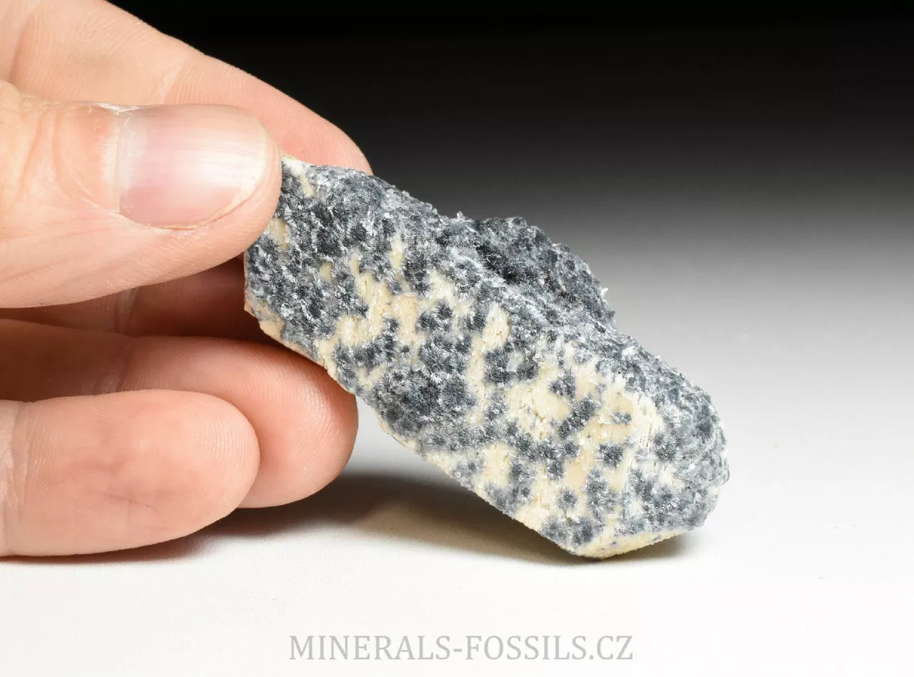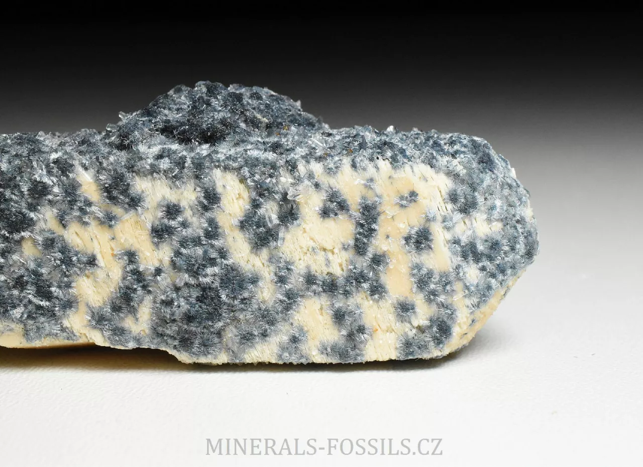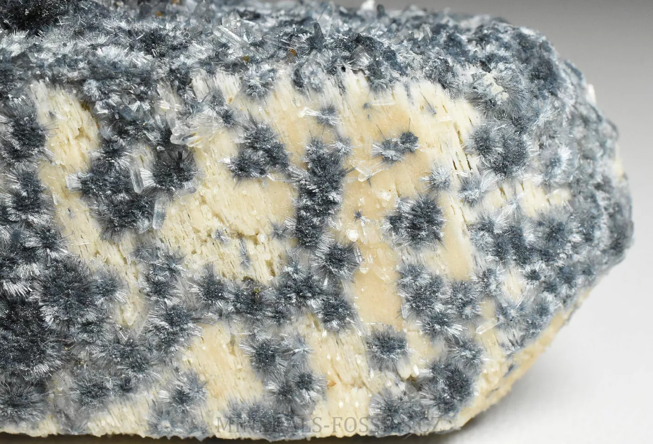 Mineralogická ukázka minerálu foititu v kombinaci s živcem (ortoklasem). Foitit je vzácný minerál skupiny turmalínu, vytváří mikroskopické jehlicovité krystaly modro-šedé barvy. Jedná se o nový nález z oblasti Erongo v Namibii počátkem roku 2026. Tento vzorek o rozměru 6 x 2 x 1,5 cm představuje pěkný a ukončený krystal ortoklasu, jehož povrch je porostlý modro-šedým foititem. Ten zde vytváří maličké (zhruba 3mm velké) paprsčitě uspořádané drůzičky. Foitit je svým složením velmi podobný skorylu, který je v místních pegmatitech jedním z hlavních minerálů, narozdíl od něj však neobsahuje sodíkový kationt, který je nahrazen hliníkem. Vytváří pouze mikroskopické krystaly. Foitit může vznikat samostatně, nebo přeměnou původního skorylu, případně může skoryl fázově přecházet do foititu v rámci jednoho krystalu.