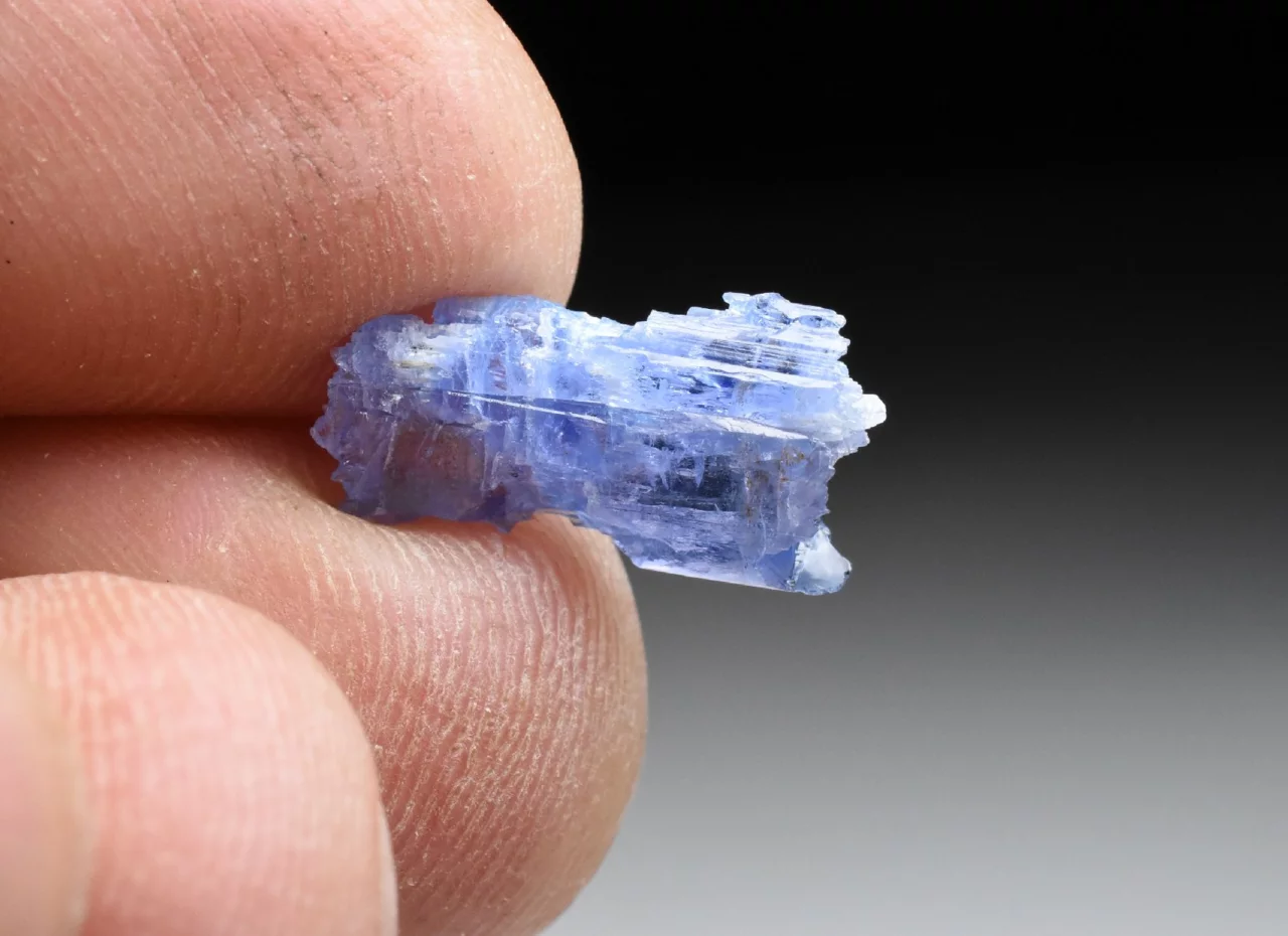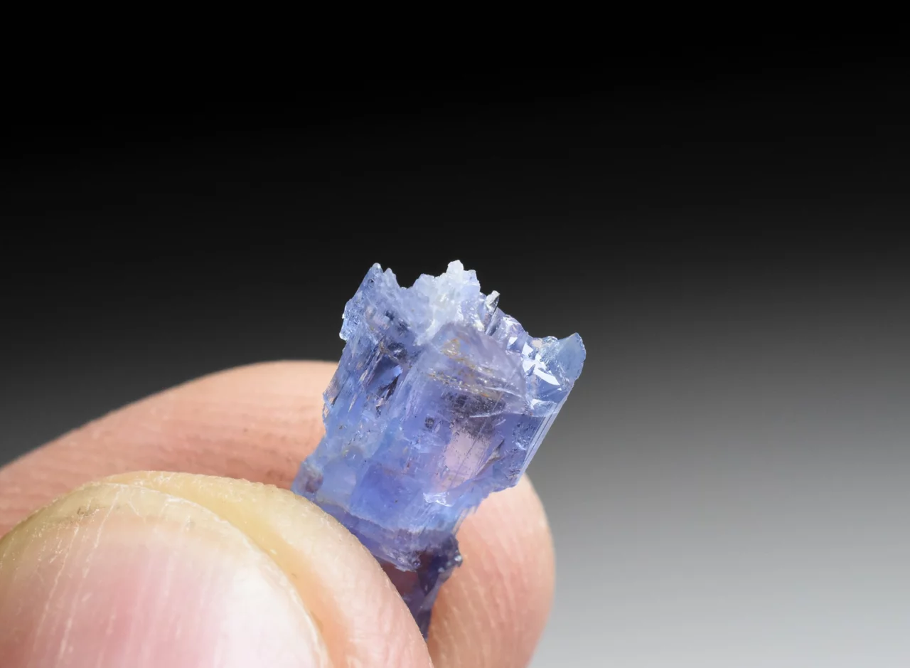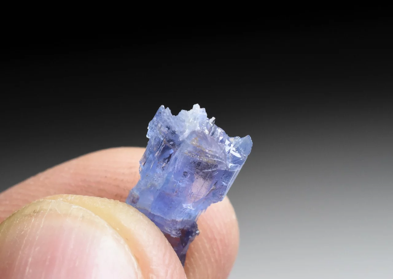 Tento krystal o velikosti 1,3 cm a váze 0,56 g má nepravidelný tvar, s výrazným rýhováním, a zakončením v podobě mnoha ostrých vrcholů (na obou koncích). Tvar krystalu i jeho skelný lesk na jakoby zaoblených ploškách dosti připomíná krystal kunzitu. Barva je safírově modrá, místy lehce nafialovělá (podobná tanzanitu), pleochroická a anizotropní (v různých směrech dopadajícího světla má krystal mírně odlišnou barvu). Krystal je místy zcela průhledný, a v jiných místech obsahuje štěpné trhlinky či neprůhledné nečistoty.