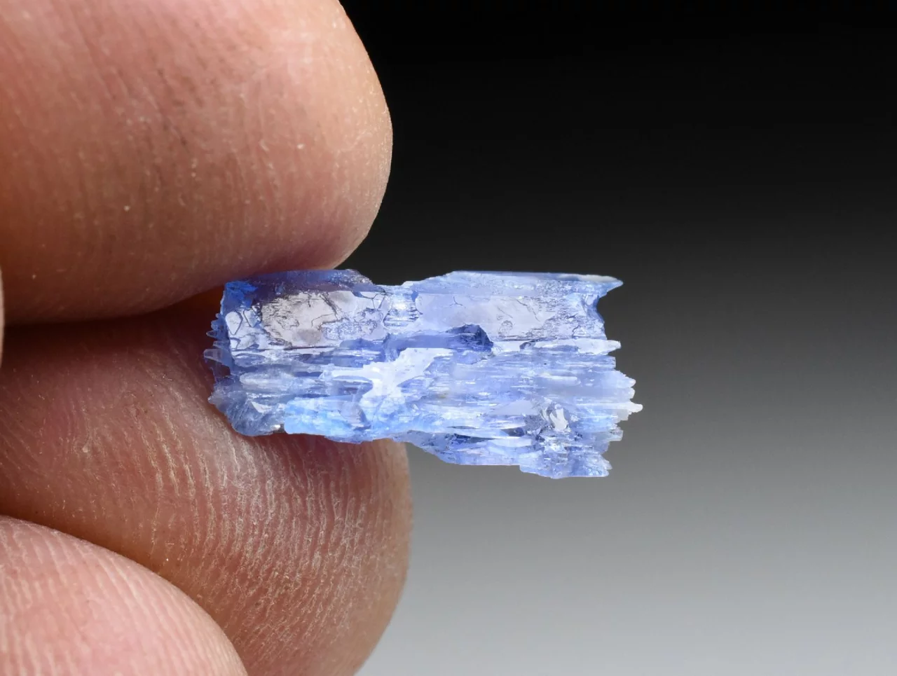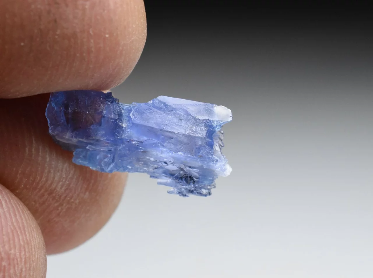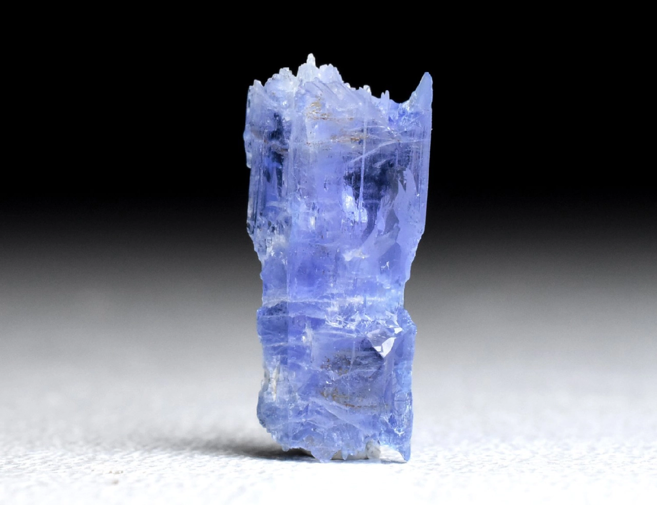 Tento krystal o velikosti 1,3 cm a váze 0,56 g má nepravidelný tvar, s výrazným rýhováním, a zakončením v podobě mnoha ostrých vrcholů (na obou koncích). Tvar krystalu i jeho skelný lesk na jakoby zaoblených ploškách dosti připomíná krystal kunzitu. Barva je safírově modrá, místy lehce nafialovělá (podobná tanzanitu), pleochroická a anizotropní (v různých směrech dopadajícího světla má krystal mírně odlišnou barvu). Krystal je místy zcela průhledný, a v jiných místech obsahuje štěpné trhlinky či neprůhledné nečistoty.