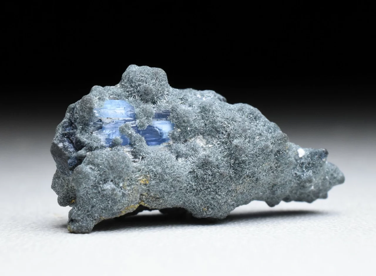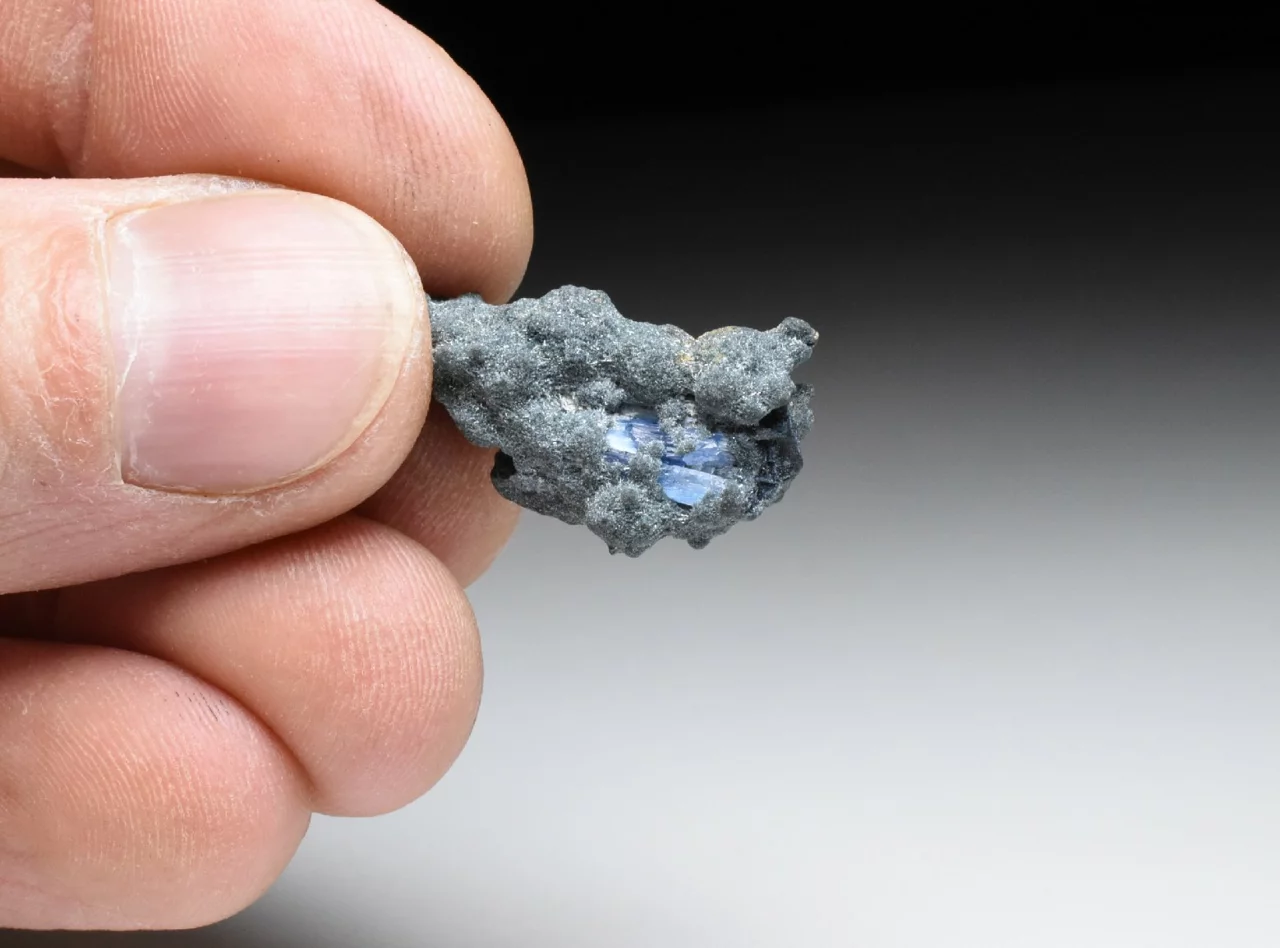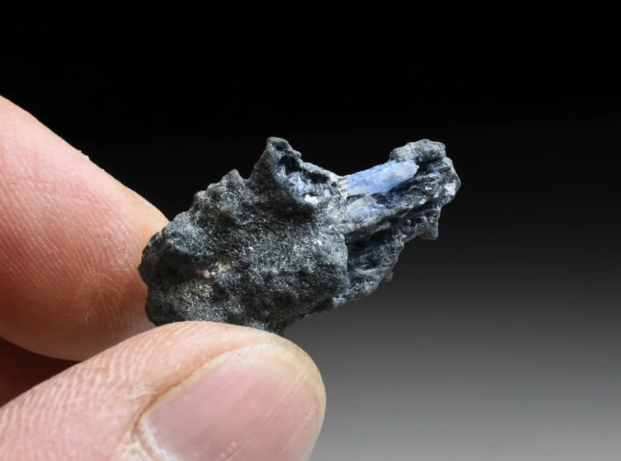 Tento malý vzoreček o velikosti 2,7 cm představuje horninu tvořenou drobnými jehlicovitými krystaly minerálu Foititu. Ten je sám o sobě vzácným minerálem (jedním z typů turmalínu). V této jemně krystalické matrici, která má grafitově šedou barvu a jemně třpytivý odlesk najedeme na několika místech zarostlé krystaly modrého Jeremejevitu. Ty dosahují maximální velikosti 6 mm. Tvary krystalů jsou velmi nepravidelné, při troše fantazie a značném zvětšení tyto tvary připomínají krystaly kunzitu. Barva je světle modrá až safírově modrá (podobná tanzanitu), pleochroická a anizotropní (v různých směrech dopadajícího světla má krystal mírně odlišnou barvu) avšak tyto efekty jsou dobře pozorovatelné jen u větších krystalů.