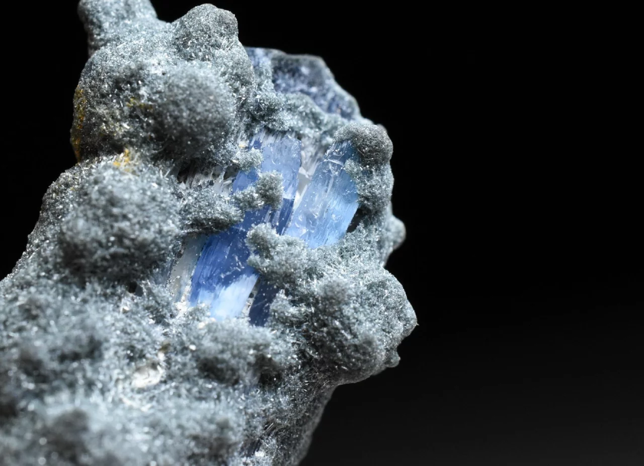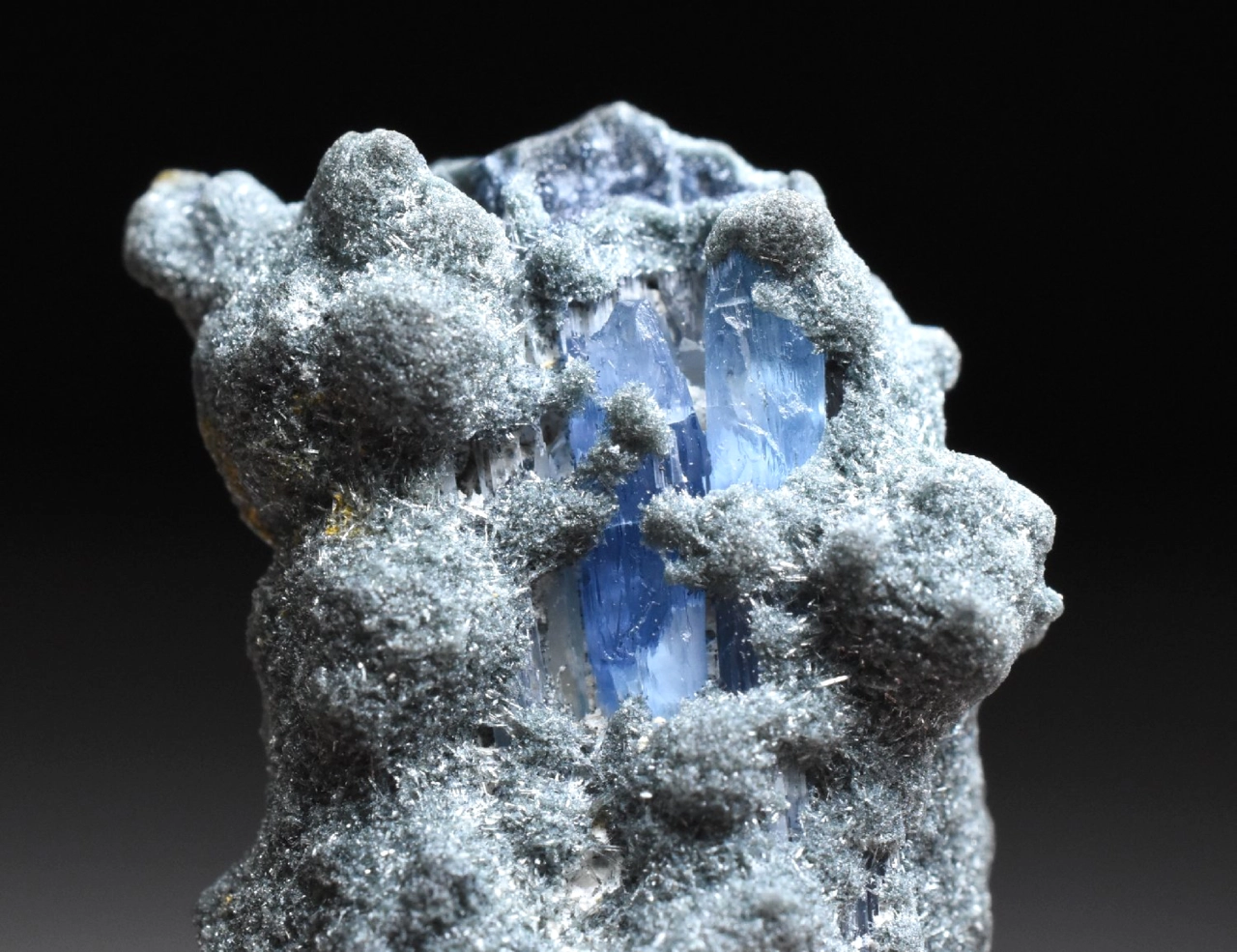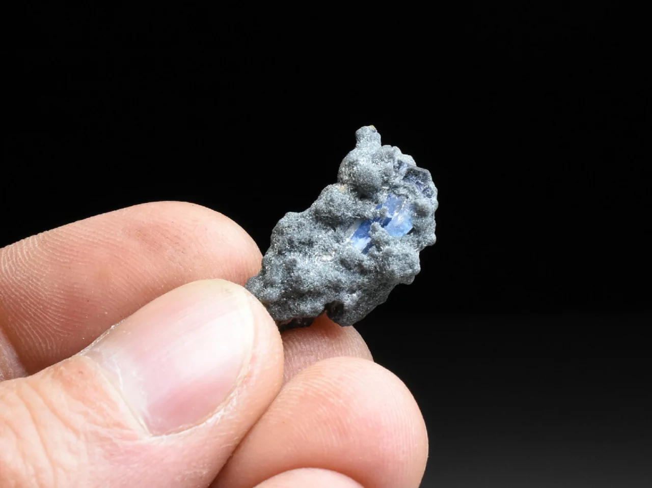 Tento malý vzoreček o velikosti 2,7 cm představuje horninu tvořenou drobnými jehlicovitými krystaly minerálu Foititu. Ten je sám o sobě vzácným minerálem (jedním z typů turmalínu). V této jemně krystalické matrici, která má grafitově šedou barvu a jemně třpytivý odlesk najedeme na několika místech zarostlé krystaly modrého Jeremejevitu. Ty dosahují maximální velikosti 6 mm. Tvary krystalů jsou velmi nepravidelné, při troše fantazie a značném zvětšení tyto tvary připomínají krystaly kunzitu. Barva je světle modrá až safírově modrá (podobná tanzanitu), pleochroická a anizotropní (v různých směrech dopadajícího světla má krystal mírně odlišnou barvu) avšak tyto efekty jsou dobře pozorovatelné jen u větších krystalů.