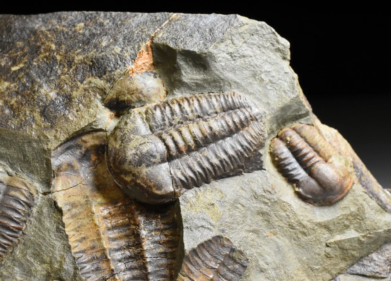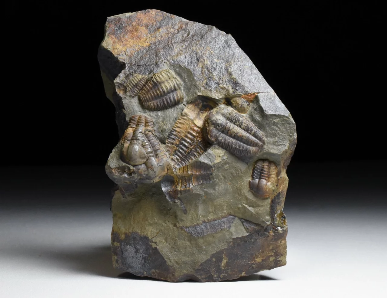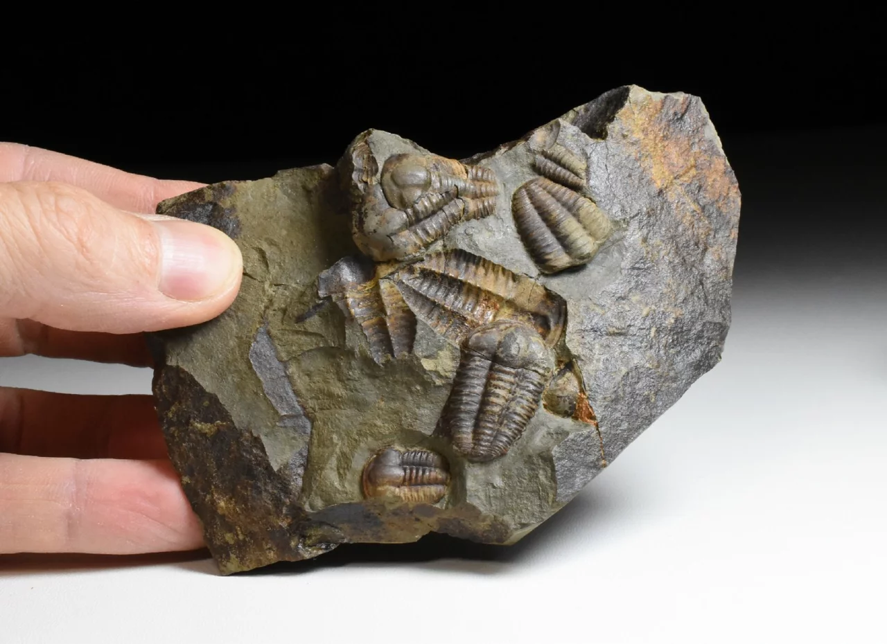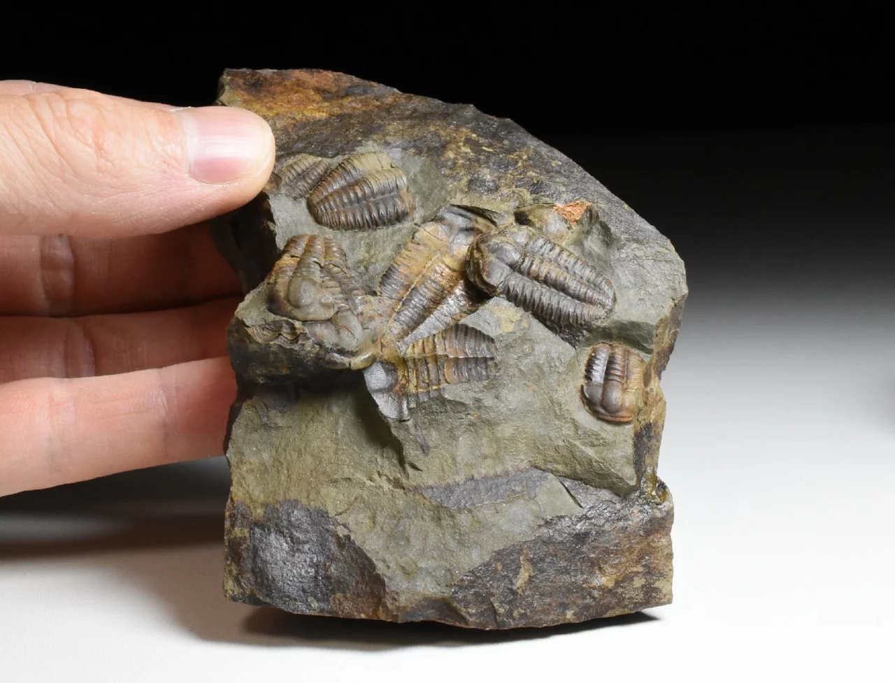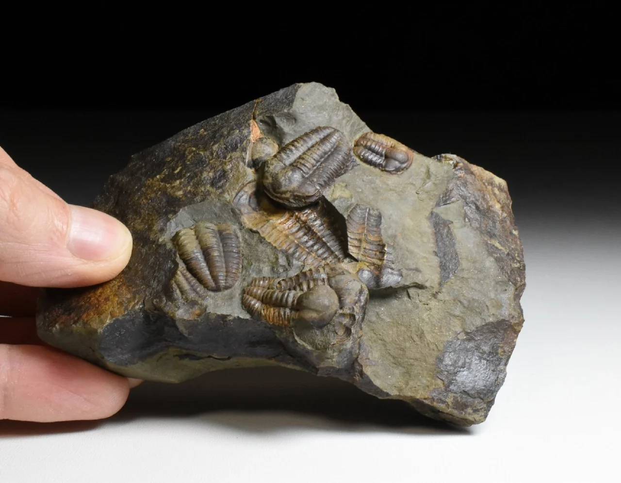 Zkamenělina trilobitů rodu Ellipsocephalus hoffi. Nález pochází z klasického naleziště v okolí města Jince na Příbramsku. Tento kus břidlice má rozměry 11 x 7,5 x 2,5 cm a najdeme na něm několik kompletních (či téměř kompletních) jedinců. Trilobiti se různě překrývají, ale nejméně 4 z nich můžeme označit jako úplně zachovalé pozitivy (největší z nich měří 2,5 cm) a mezi nimi přímo uprostřed je jeden velký negativ (otisk).