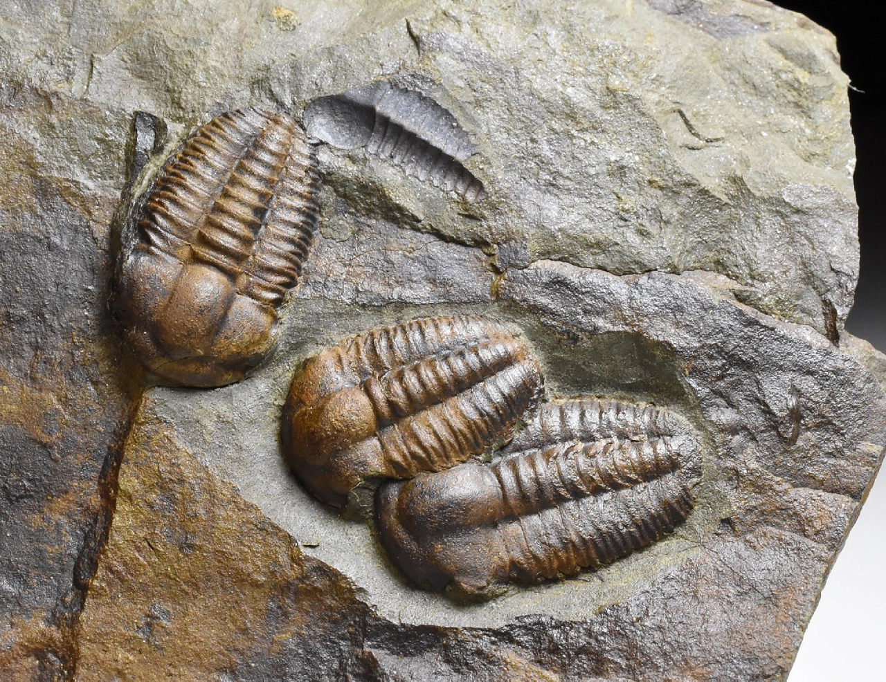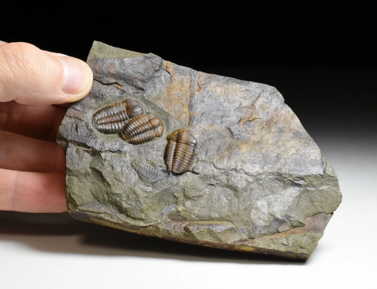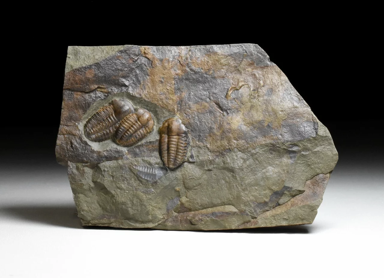 Zkamenělina trilobitů rodu Ellipsocephalus hoffi. Nález pochází z klasického nalezištěv okolí města Jince na Příbramsku. Na této destičce břidlice o rozměru 12 x 8 x 2,5 cm najdeme 3 kompletně zachovalé jedince, z nichž ten největší dosahuje velikosti 2,3 cm.