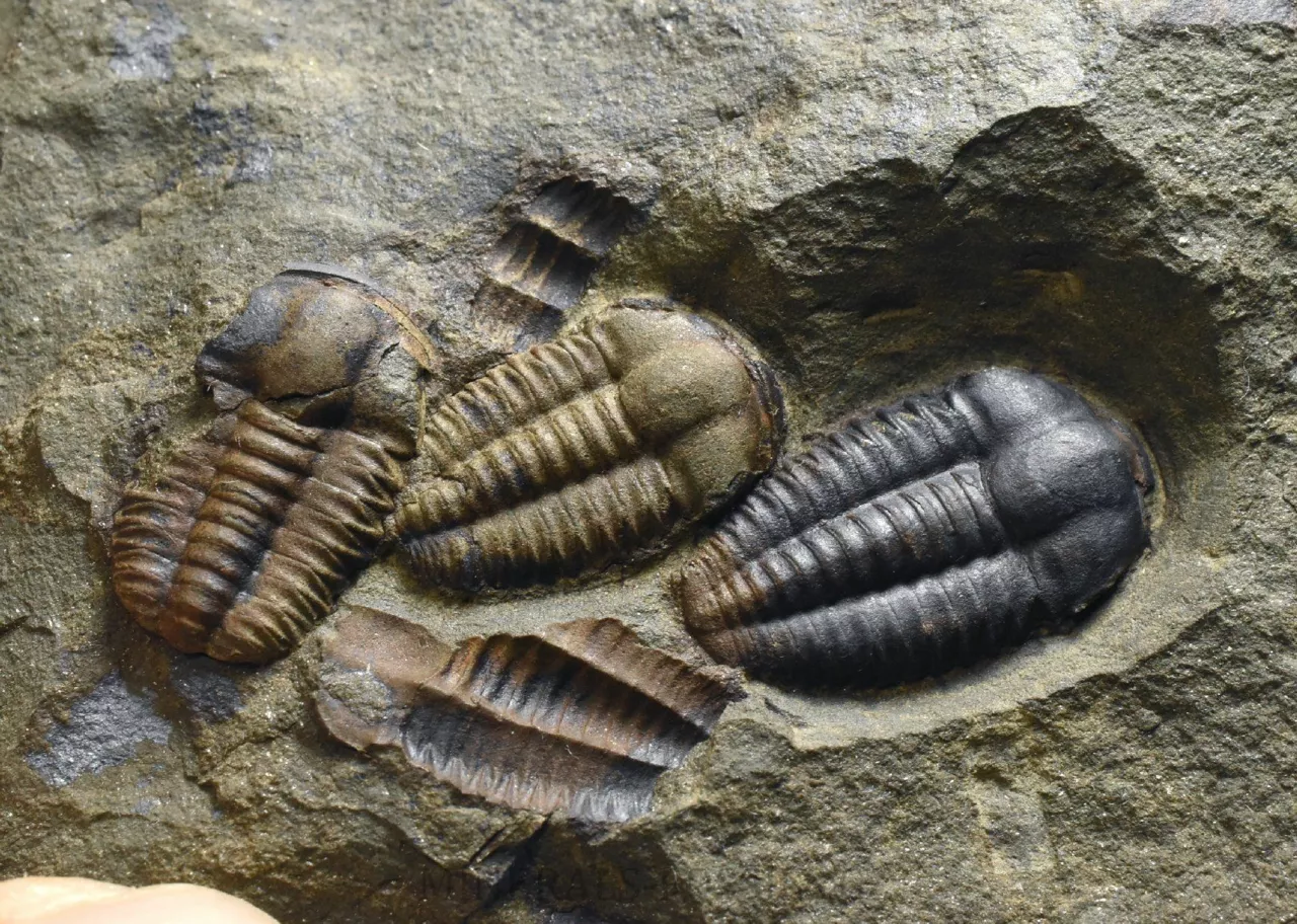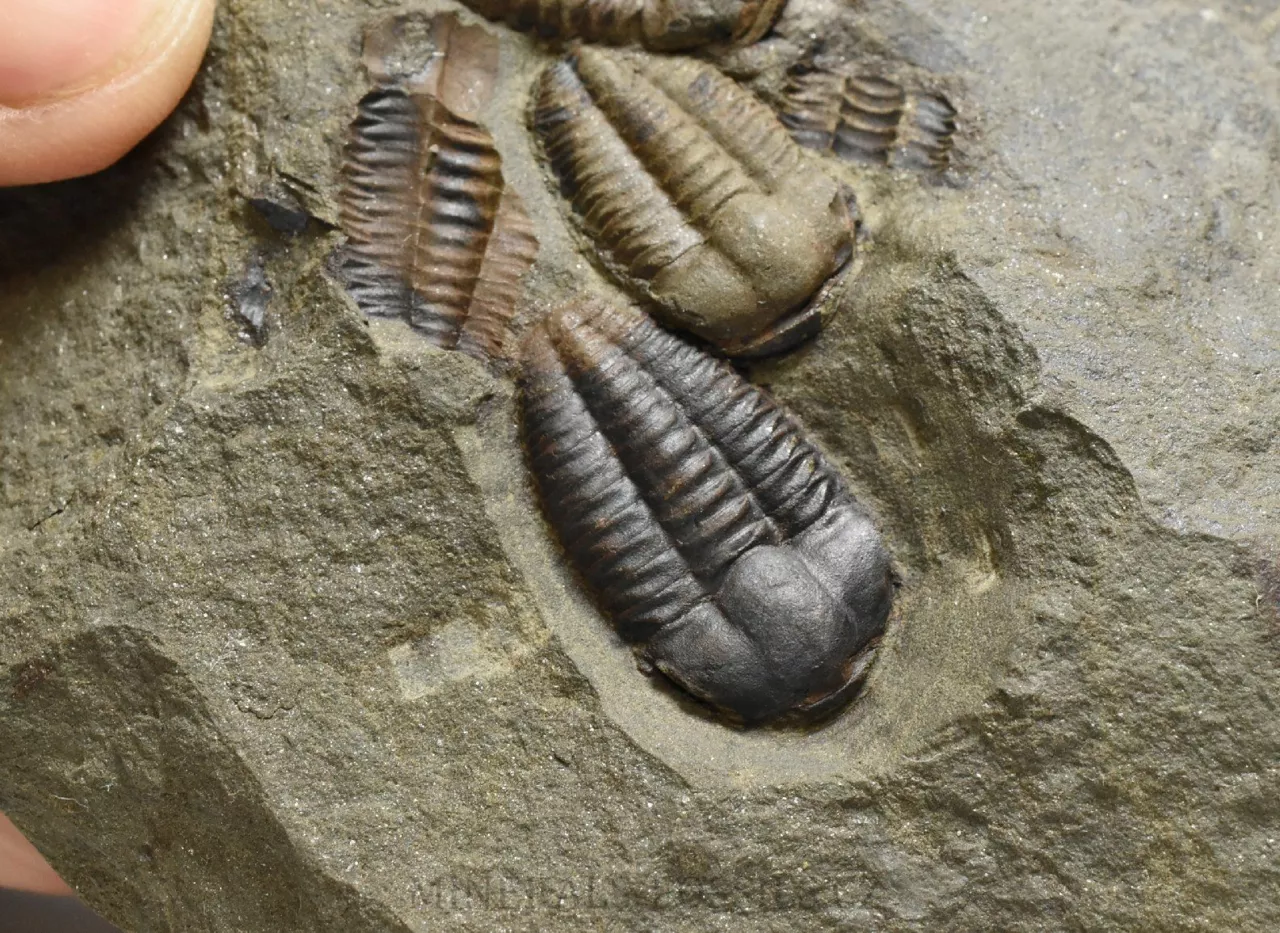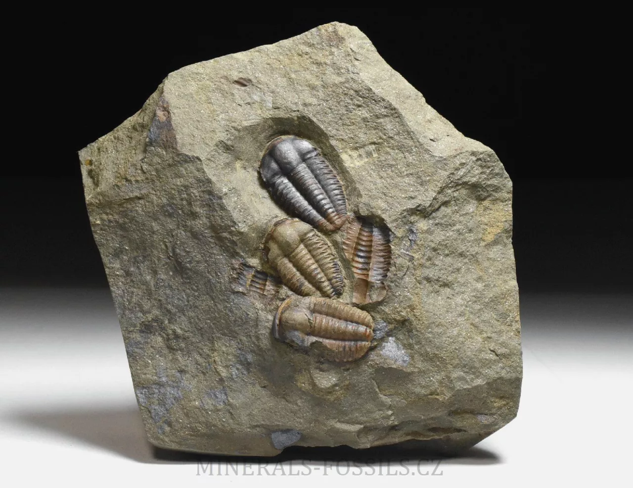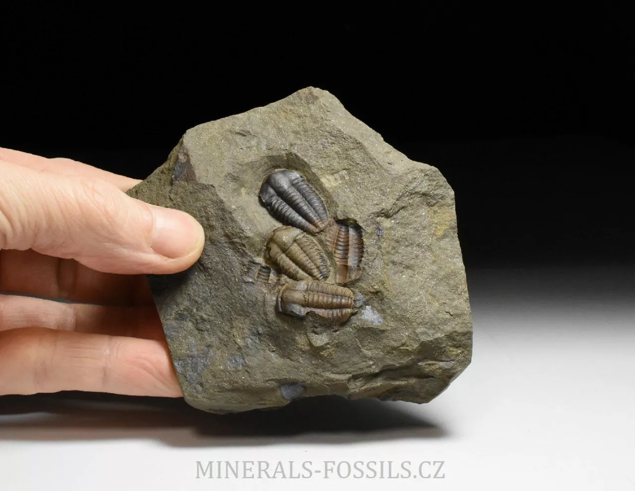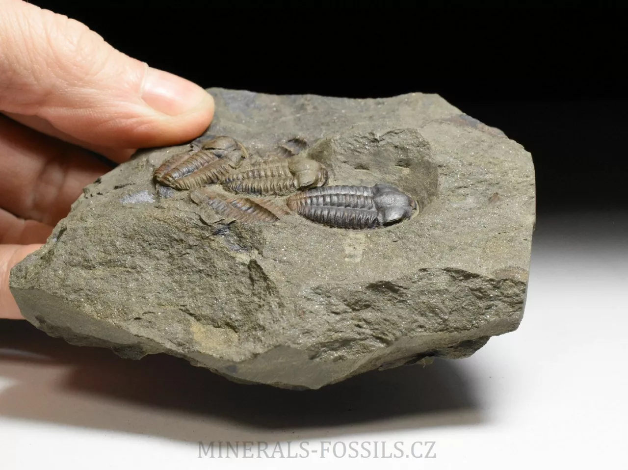 Zkamenělina trilobitů rodu Ellipsocephalus hoffi. Nález pochází z klasického nalezišťe v okolí města Jince na Příbramsku. Ta tomto kousku břidlice, který má rozměry 9,5 x 9,5 x 2 cm najdeme 3 jedince tohoto druhu trilobita, kteří jsou všichni zachovalí jako pozitiv. dva jsou zcela komletní a jeden (ten spodní) je trošku poškozený a lepený. Ten největší z trilobitů se stříbřitě černým zbarvením dosahuje velikosti 2,5 cm.
