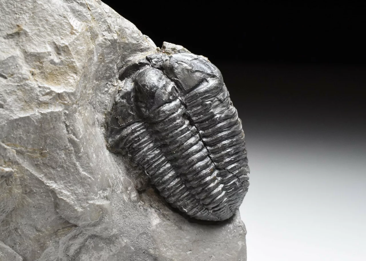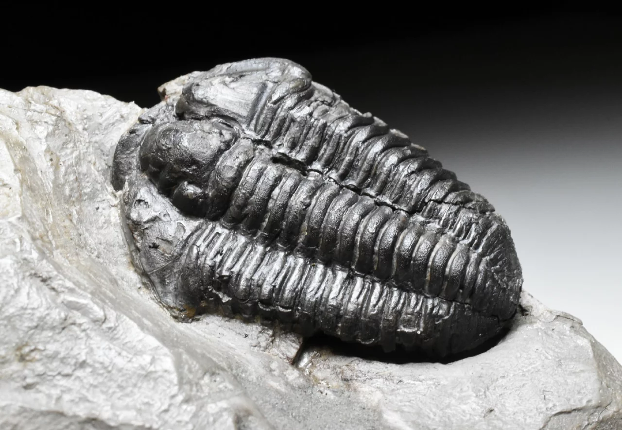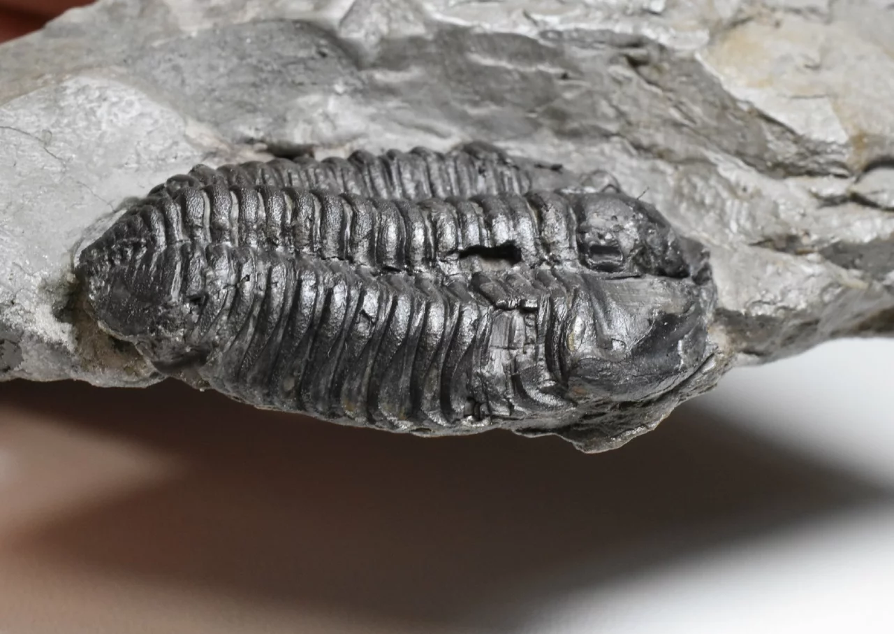 Vzácná zkamenělina trilobita rodu Flexicalymene declinata z králodvorského souvrství. Trilobit je rovné 4 cm velký, zachovalý ve světle šedé jílovité břidlici. Zachování je velmi trojrozměrné, trilobit má téměř kompletně zachovalý exoskelet (původní krunýř), který má přírodní tmavé zbarvení. Místy je viditelná jemná granulace na jeho povrchu. Hlavový štít má obě volné líce (ta levá je skrytá v hornině) a hrabavý lem. Trilobit je trošku poškozený, lepený a preparovaný z horniny, povrch vzorku je konzervovaný transparentním nátěrem, aby se zabránilo oxidaci pyritu uvnitř břidlice (bez nátěru vzorek začně oxidovat a rozpadá se). Kámen je starší sbírky, uvedená lokalita Berou-Králův Dvůr by mohla být ve skutečnou lokalitou dnes označovanou jako obec Levín. Celkové rozměry kamene 10 x 7,5 x 2,5 cm.