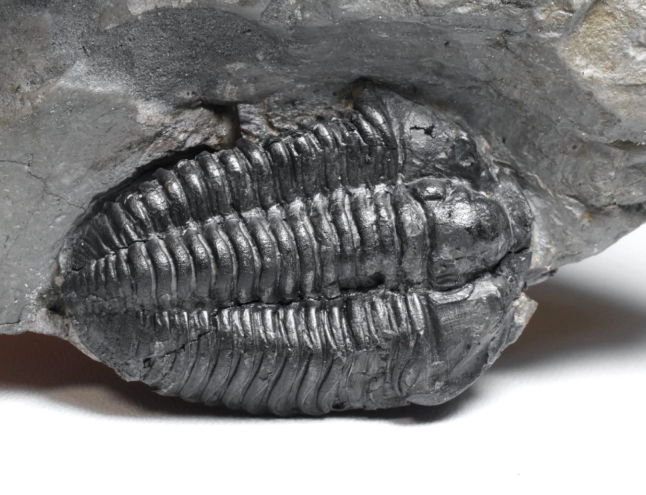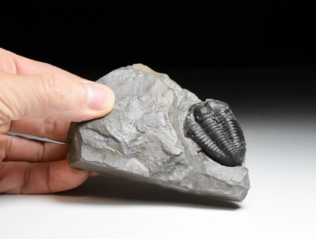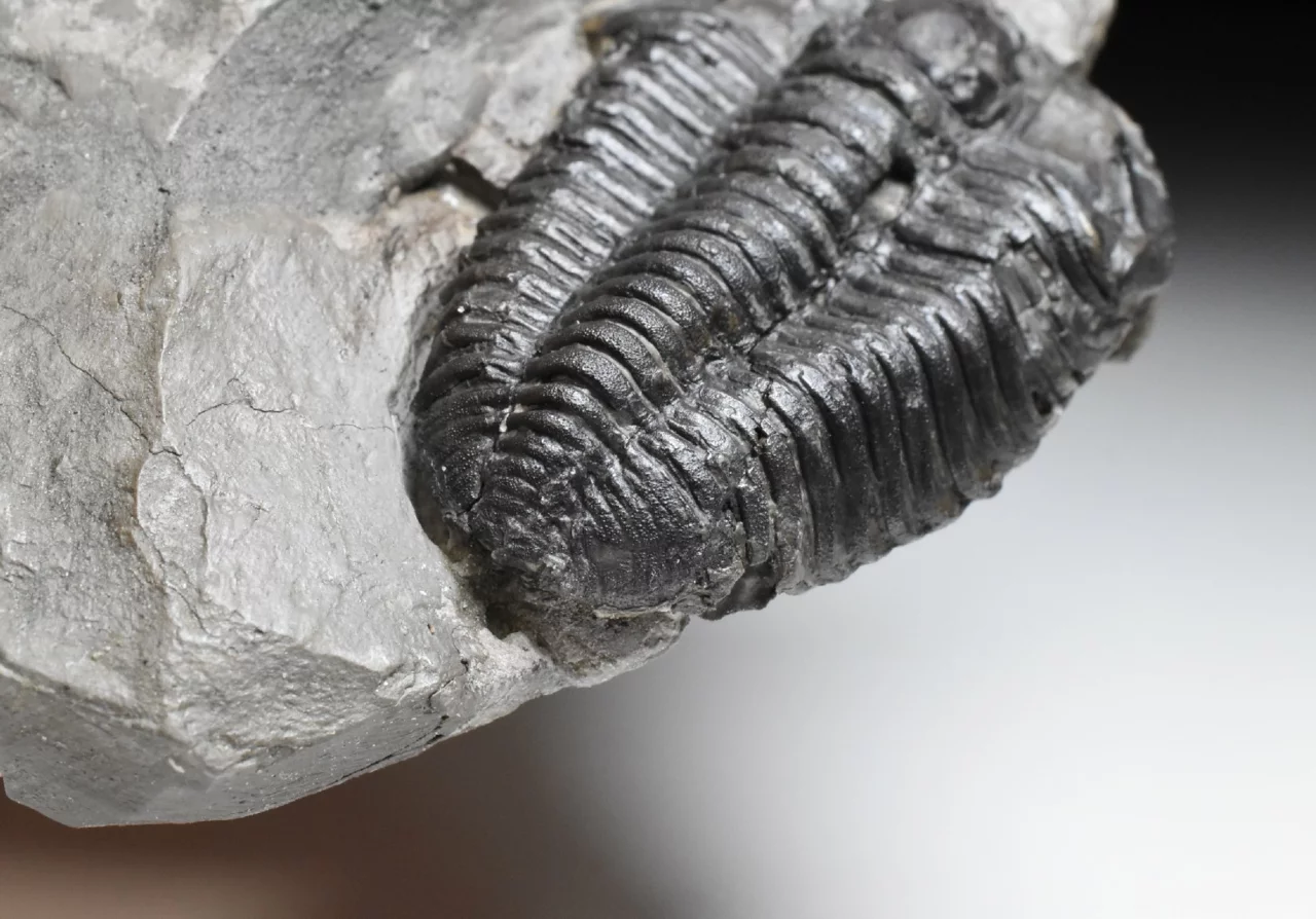 Vzácná zkamenělina trilobita rodu Flexicalymene declinata z králodvorského souvrství. Trilobit je rovné 4 cm velký, zachovalý ve světle šedé jílovité břidlici. Zachování je velmi trojrozměrné, trilobit má téměř kompletně zachovalý exoskelet (původní krunýř), který má přírodní tmavé zbarvení. Místy je viditelná jemná granulace na jeho povrchu. Hlavový štít má obě volné líce (ta levá je skrytá v hornině) a hrabavý lem. Trilobit je trošku poškozený, lepený a preparovaný z horniny, povrch vzorku je konzervovaný transparentním nátěrem, aby se zabránilo oxidaci pyritu uvnitř břidlice (bez nátěru vzorek začně oxidovat a rozpadá se). Kámen je starší sbírky, uvedená lokalita Berou-Králův Dvůr by mohla být ve skutečnou lokalitou dnes označovanou jako obec Levín. Celkové rozměry kamene 10 x 7,5 x 2,5 cm.