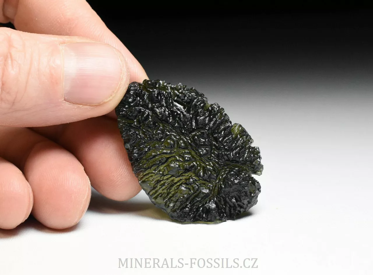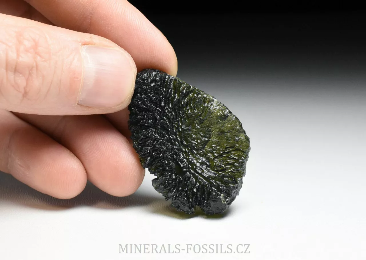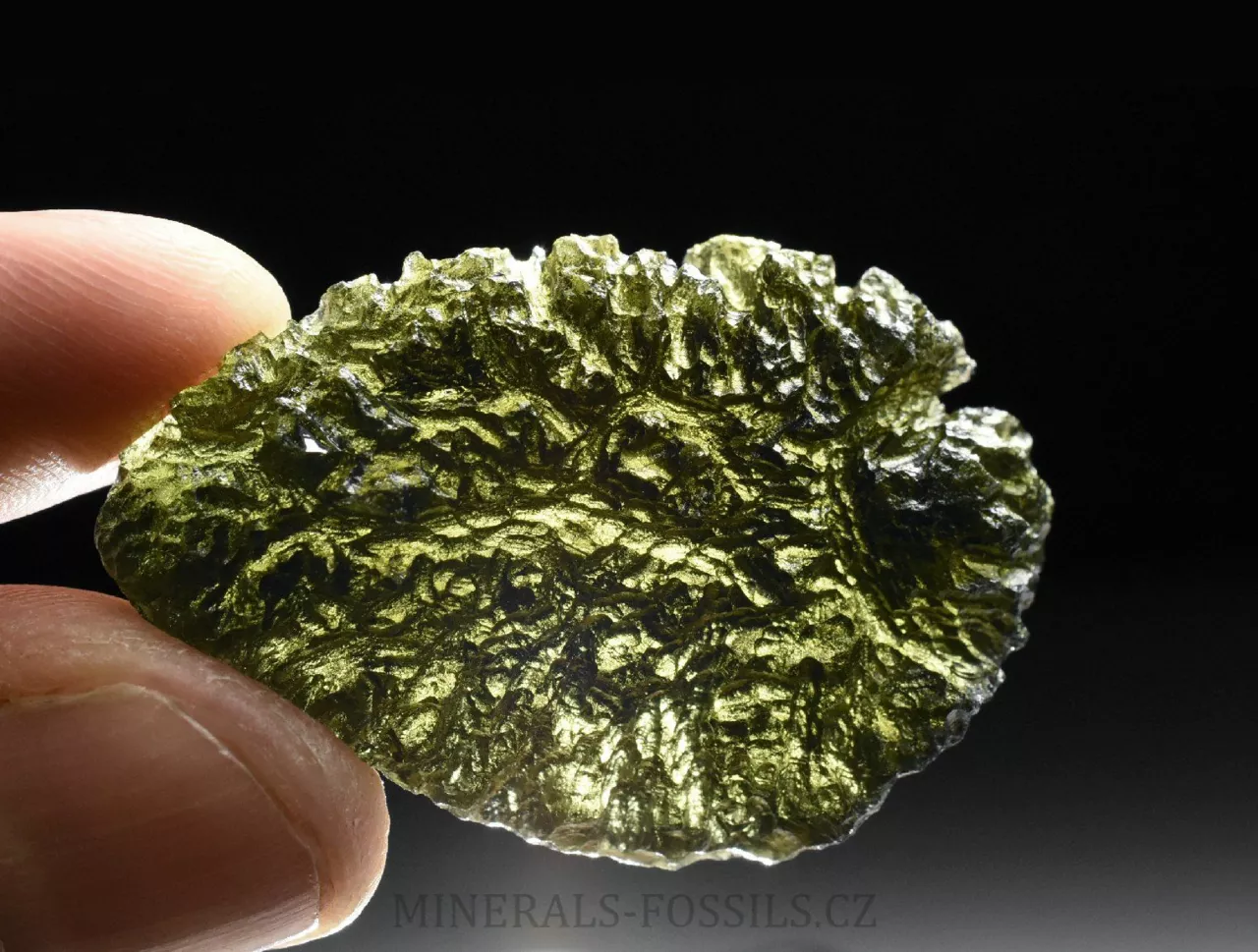 Pěkný a poměrně velký vltavín z lokality "Malý Chlum", která se nachází mezi obcemi Ločenice a Chlum nad Malší. Kámen má z pohledové strany tvar nepravidelné elipsy, jeho barva je typicky lahvově zelená, ale lehce tmavší, než je průměrné zbarvení vltavínů. Povrch je hluboce skulptovaný a povrch má lehce vyšší úroveň lesku (má již slabší takzvaný "lakový lesk"). Přesné rozměry tohoto vltavínu jsou 4,5 x 3,2 x 0,9 cm (rozměry v těch nejširších místech) a váží 14,47 g. Když si pozorně prohlédneme jeho tvar, zjistíme, že se je jedná o prastarý fragment velikého disku se ztluštěným okrajem a tento vltavín představuje možná jeho pětinu původní velikosti. Kámen má několik drobných poškození, na přední pohledové straně je nejvýznamnější odštíplá ploška asi 3x2 mm, a dále na kameni najdeme i několik dalších menších poškození. Žádné z nich však není nijak zvlášť nápadné, jelikož kámen je sám o sobě poměrně tmavý a lesklý.