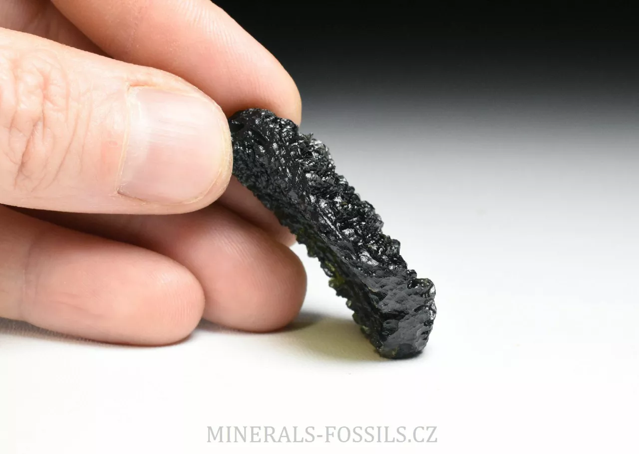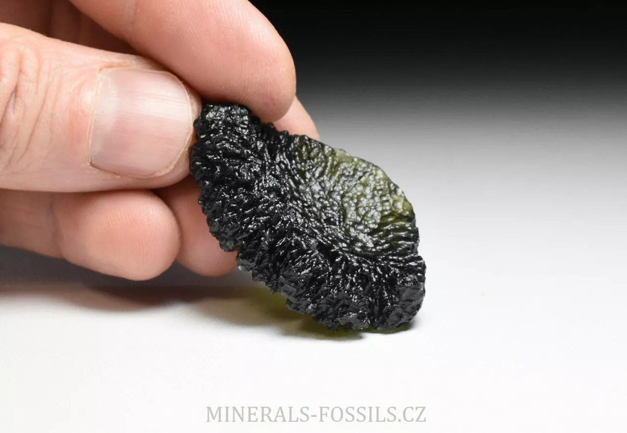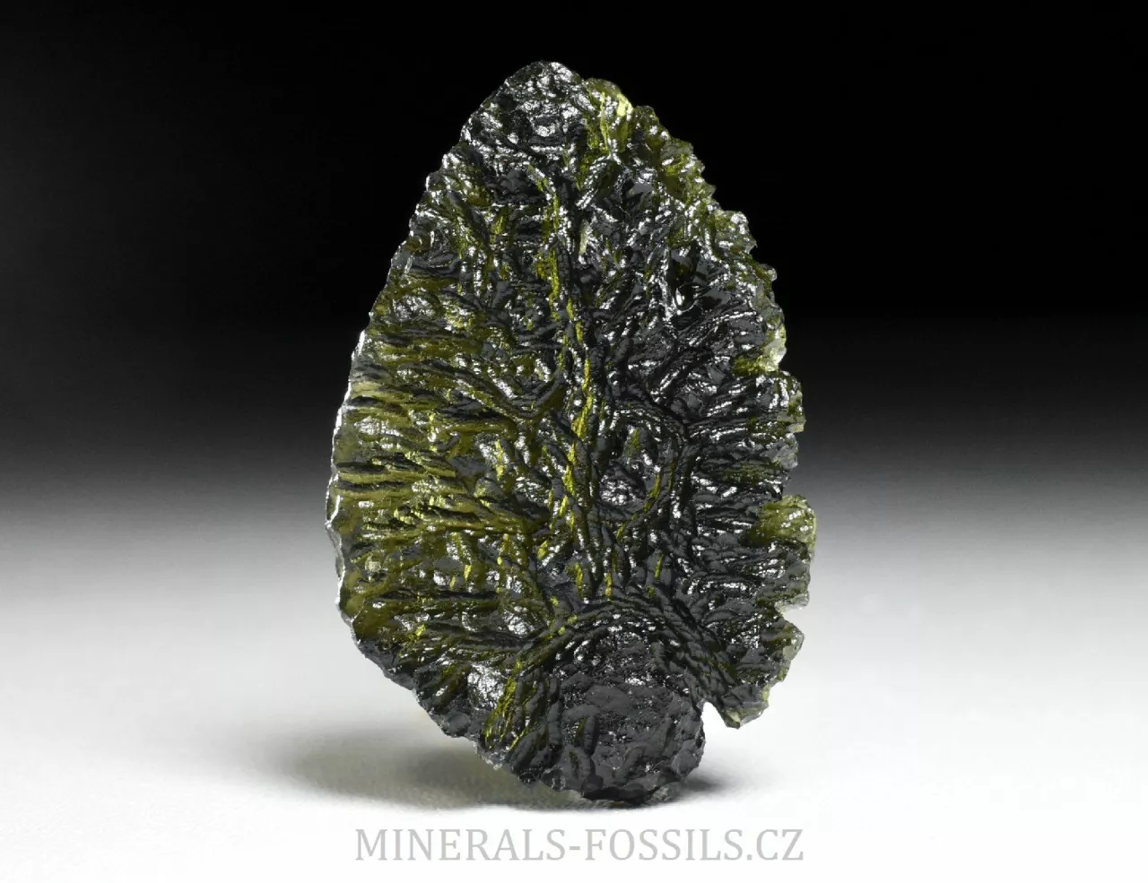 Pěkný a poměrně velký vltavín z lokality "Malý Chlum", která se nachází mezi obcemi Ločenice a Chlum nad Malší. Kámen má z pohledové strany tvar nepravidelné elipsy, jeho barva je typicky lahvově zelená, ale lehce tmavší, než je průměrné zbarvení vltavínů. Povrch je hluboce skulptovaný a povrch má lehce vyšší úroveň lesku (má již slabší takzvaný "lakový lesk"). Přesné rozměry tohoto vltavínu jsou 4,5 x 3,2 x 0,9 cm (rozměry v těch nejširších místech) a váží 14,47 g. Když si pozorně prohlédneme jeho tvar, zjistíme, že se je jedná o prastarý fragment velikého disku se ztluštěným okrajem a tento vltavín představuje možná jeho pětinu původní velikosti. Kámen má několik drobných poškození, na přední pohledové straně je nejvýznamnější odštíplá ploška asi 3x2 mm, a dále na kameni najdeme i několik dalších menších poškození. Žádné z nich však není nijak zvlášť nápadné, jelikož kámen je sám o sobě poměrně tmavý a lesklý.