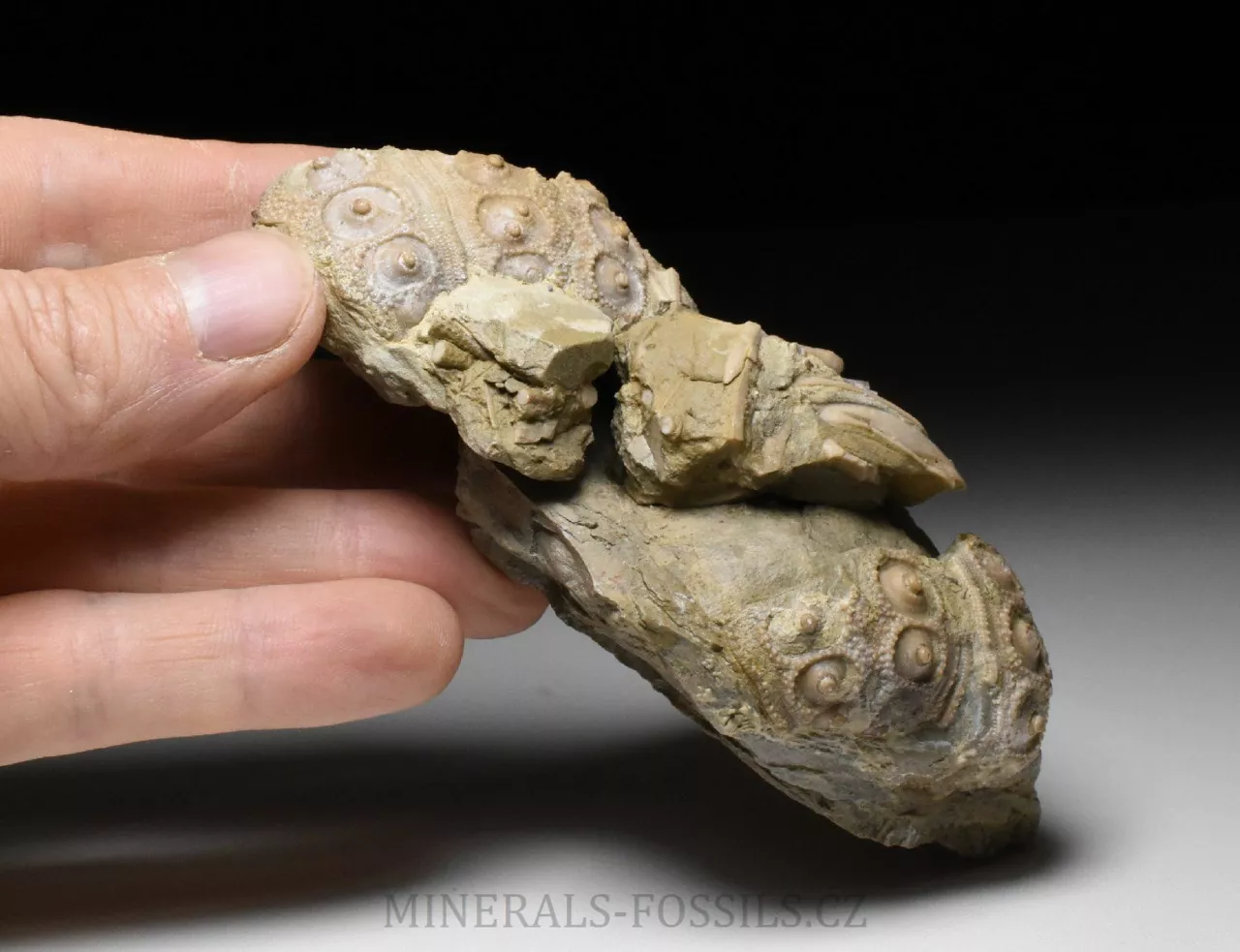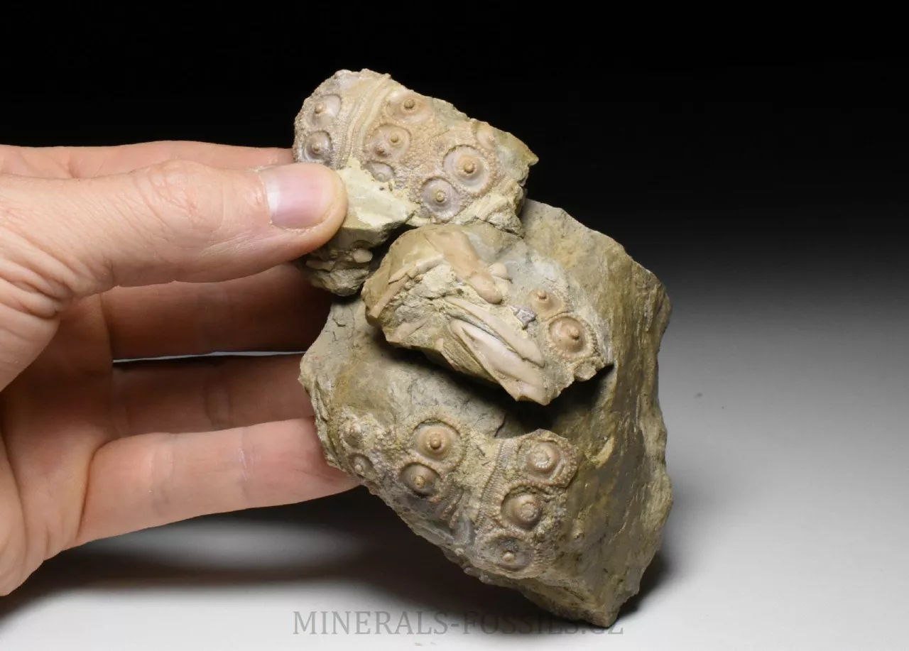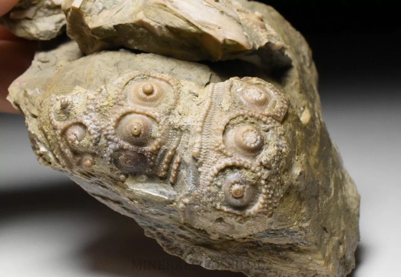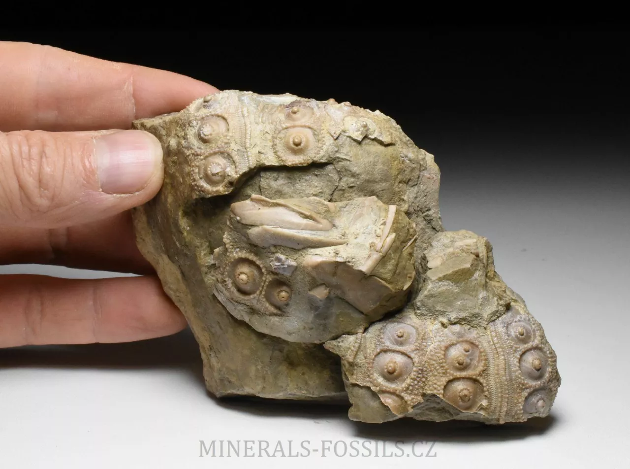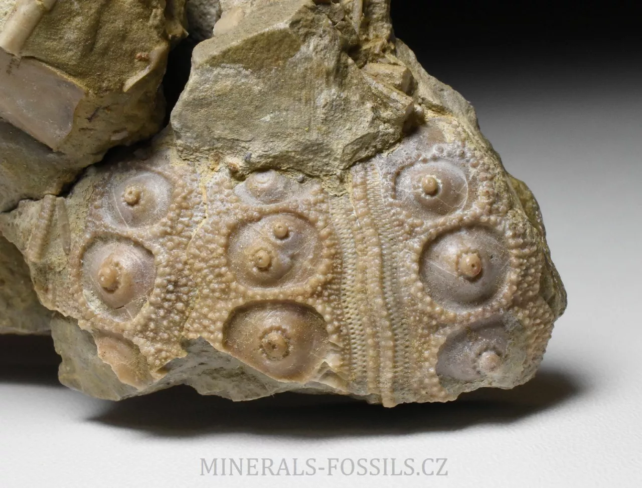 Zkamenělina druhohorní ježovky rodu Cidaris sp. ze švýcarské svrchní jury. Fosílie pochází z dnes již zaniklé lokality La Rouchenette v severozápadním Švýcarsku, odkud pocházejí překrásné nálezy druhohorních fosílií, zejména mlžů a ježovek. Zachovaní fosílií na této proslulé lokalitě je velice detailní, v podstatě dokonalé. Zkameněliny se zde nacházejí v šedých slínech a k jejich prepraci se často používaly chemické metody (rozpuštění slínů alkalickými činidly), které umožniny zcela šetrné očištění povrchu fosílie od okolní horniny. Tento exemlplář představuje pozůstatky poměrně velké ježovky rodu Cidaris sp. Tato ježovka, jejíž tělo (kostra) měla původně zhruba 5 cm v průměru se zachovala v podobě fragmentů. Zachovaní povrchu je velmi detailní, můžeme krásně pozorovat ambulatkutm a jednotlivé destičky s bradavkami. Na jedné z destiček můžeme vidět vývojovou malformaci - dvě bradavky místo jedné. Uprostřed vzorku jsou zachovalé pozůstatky tzv. aristotelovy lucerny, tedy vnitřního kousacího ústrojí. V hornině najdeme i nepatrné zbytky původních ostnů. Kámen byl rozpraskaný a je tudíž lepený. Celý vzorek má rozměry 12,5 x 8 x 5 cm. Je to sběratelsky velmi cenný kus, jedná o fosílii z dávno zaniklé unikátní lokality a to v samotném Švýcarsku, odkud jsou obecně veškeré přírodniny velmi ceněné. Vzorek pochází ze staré sbírky sbírané cca od roku 1950.