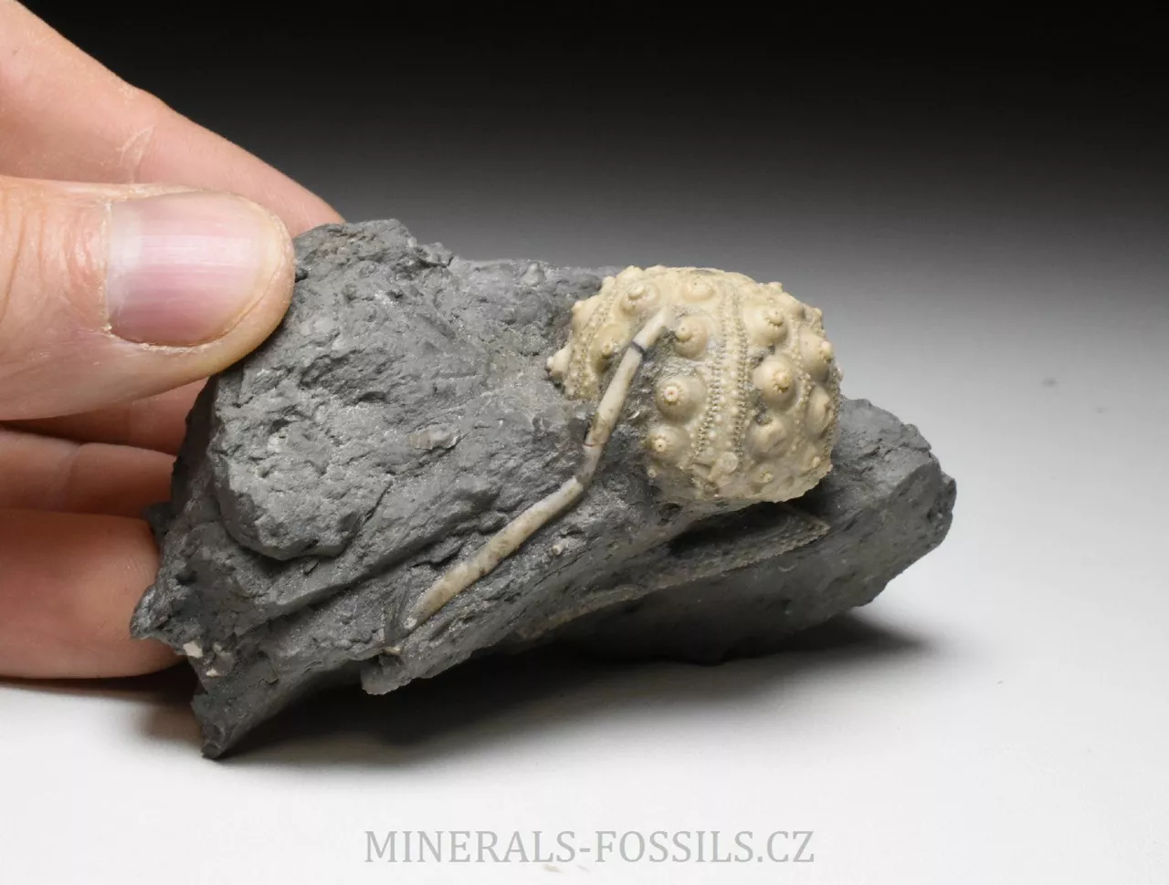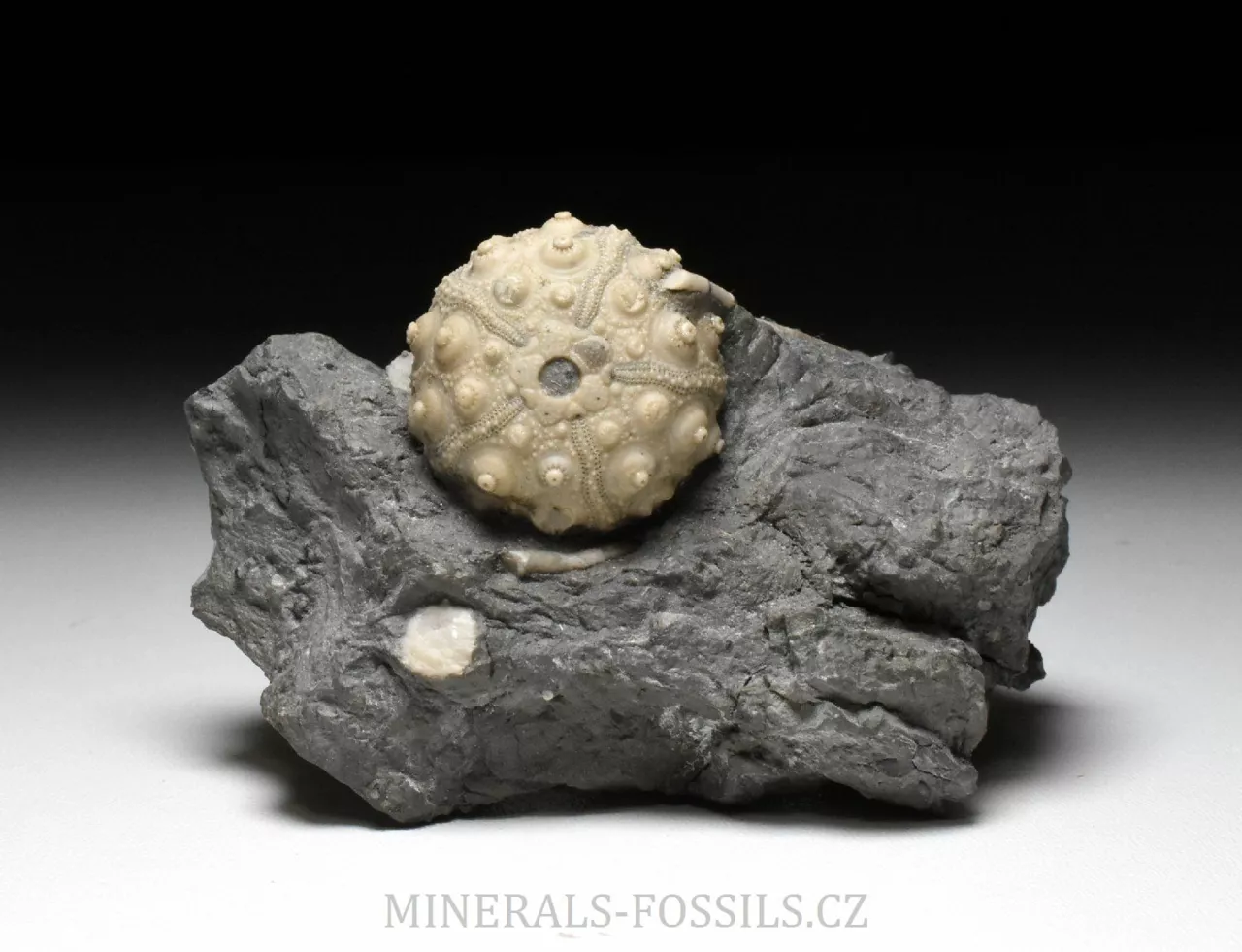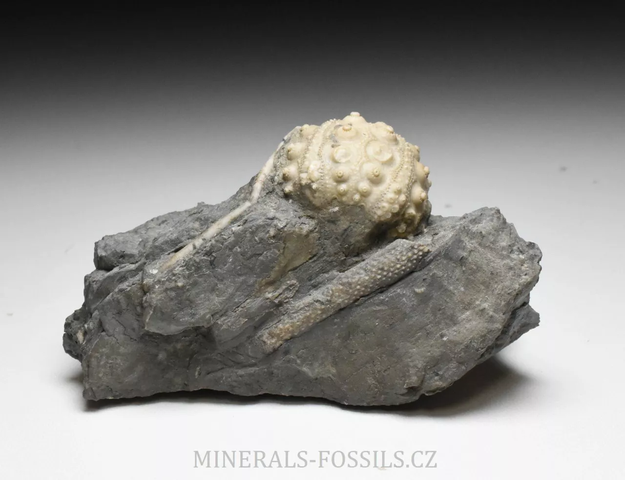 Zkamenělina druhohorní ježovky rodu Hemicidaris crenularis ze švýcarské svrchní jury. Fosílie pochází z dnes již zaniklé lokality La Rouchenette v severozápadním Švýcarsku, odkud pocházejí překrásné nálezy druhohorních fosílií, zejména mlžů a ježovek. Zachovaní fosílií na této proslulé lokalitě je velice detailní, v podstatě dokonalé. Zkameněliny se zde nacházejí v šedých slínech a k jejich prepraci se často používaly chemické metody (rozpuštění slínů alkalickými činidly), které umožniny zcela šetrné očištění povrchu fosílie od okolní horniny. Tento exemlplář představuje samotnou ježovku (respektive její kompletní kostru) zachovalou přímo v matečné hornině. V okolí ježovky můžeme najít i pozůstatky jejích vlastních ostnů (zejména ten jeden, který leží příma na ježovce). V hornině se pak nachází i další silnější ostny s tečkovanou texturou povrchu, ty však náleží jinému rodu ježovky (Cidaris sp.). velikost samotné ježovky jsou necelé 3 cm, celý vzorek má rozměry 9 x 5 x 4 cm. Je to sběratelsky velmi cenný kus, jedná o fosílii z dávno zaniklé unikátní lokality a to v samotném Švýcarsku, odkud jsou obecně veškeré přírodniny velmi ceněné. Vzorek pochází ze staré sbírky sbírané cca od roku 1950.