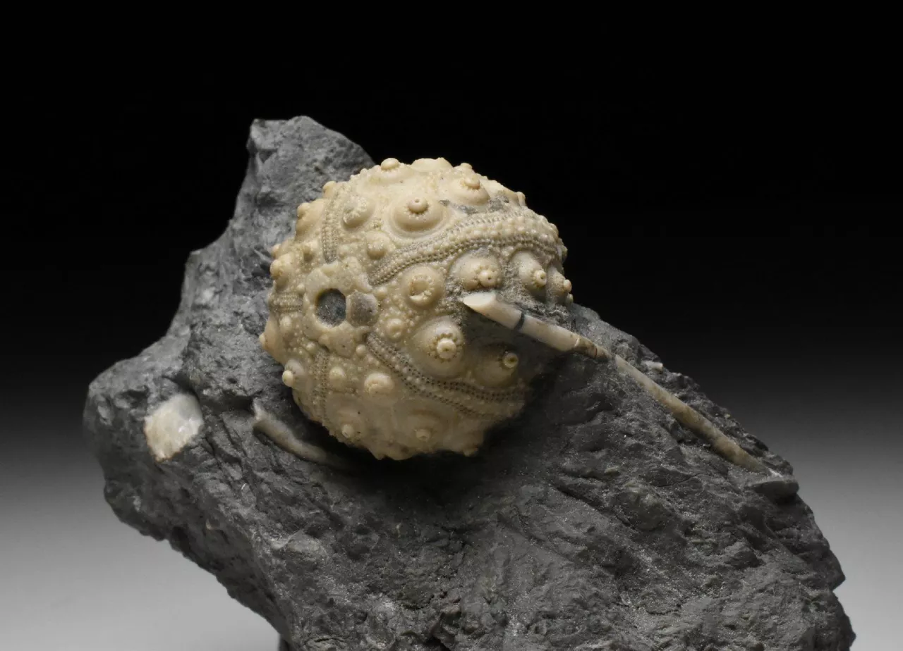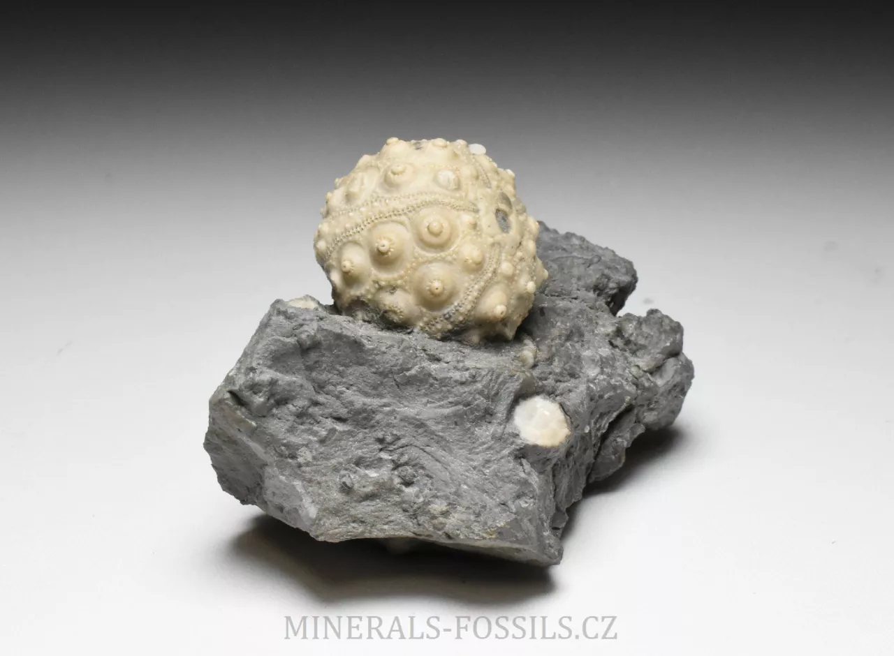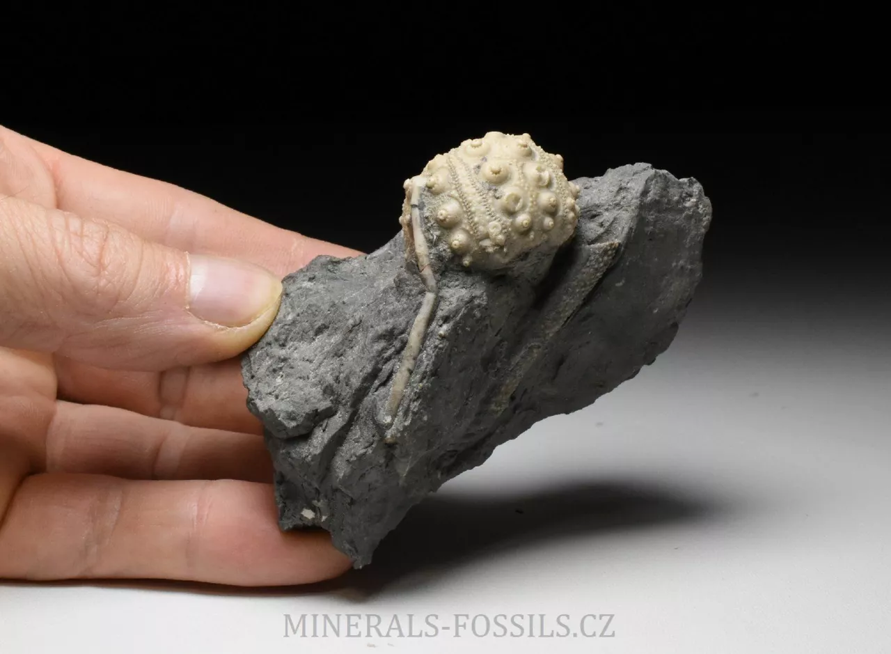 Zkamenělina druhohorní ježovky rodu Hemicidaris crenularis ze švýcarské svrchní jury. Fosílie pochází z dnes již zaniklé lokality La Rouchenette v severozápadním Švýcarsku, odkud pocházejí překrásné nálezy druhohorních fosílií, zejména mlžů a ježovek. Zachovaní fosílií na této proslulé lokalitě je velice detailní, v podstatě dokonalé. Zkameněliny se zde nacházejí v šedých slínech a k jejich prepraci se často používaly chemické metody (rozpuštění slínů alkalickými činidly), které umožniny zcela šetrné očištění povrchu fosílie od okolní horniny. Tento exemlplář představuje samotnou ježovku (respektive její kompletní kostru) zachovalou přímo v matečné hornině. V okolí ježovky můžeme najít i pozůstatky jejích vlastních ostnů (zejména ten jeden, který leží příma na ježovce). V hornině se pak nachází i další silnější ostny s tečkovanou texturou povrchu, ty však náleží jinému rodu ježovky (Cidaris sp.). velikost samotné ježovky jsou necelé 3 cm, celý vzorek má rozměry 9 x 5 x 4 cm. Je to sběratelsky velmi cenný kus, jedná o fosílii z dávno zaniklé unikátní lokality a to v samotném Švýcarsku, odkud jsou obecně veškeré přírodniny velmi ceněné. Vzorek pochází ze staré sbírky sbírané cca od roku 1950.