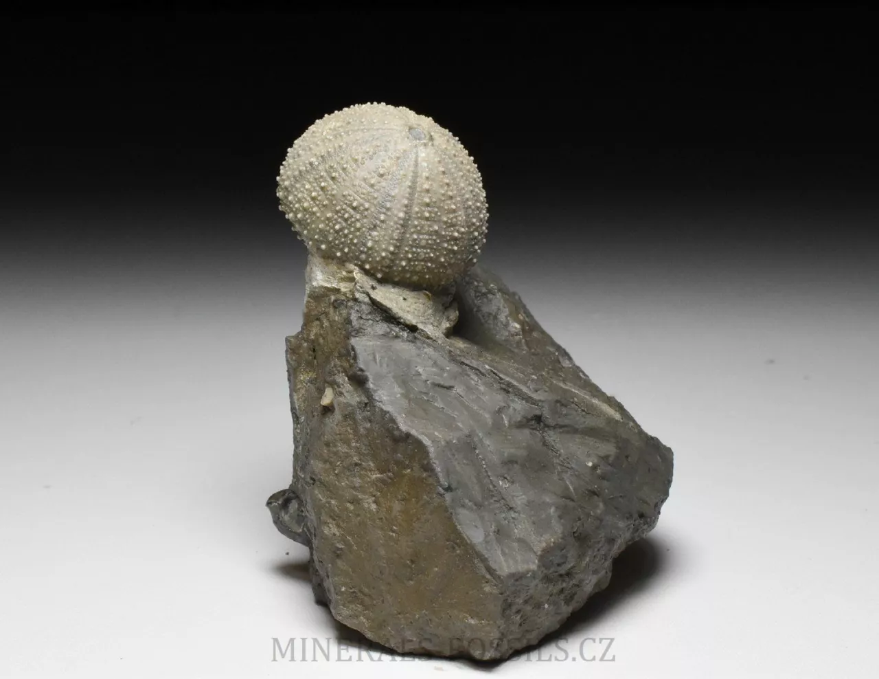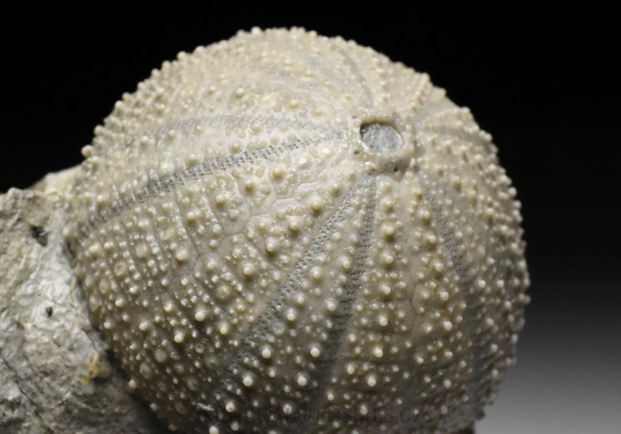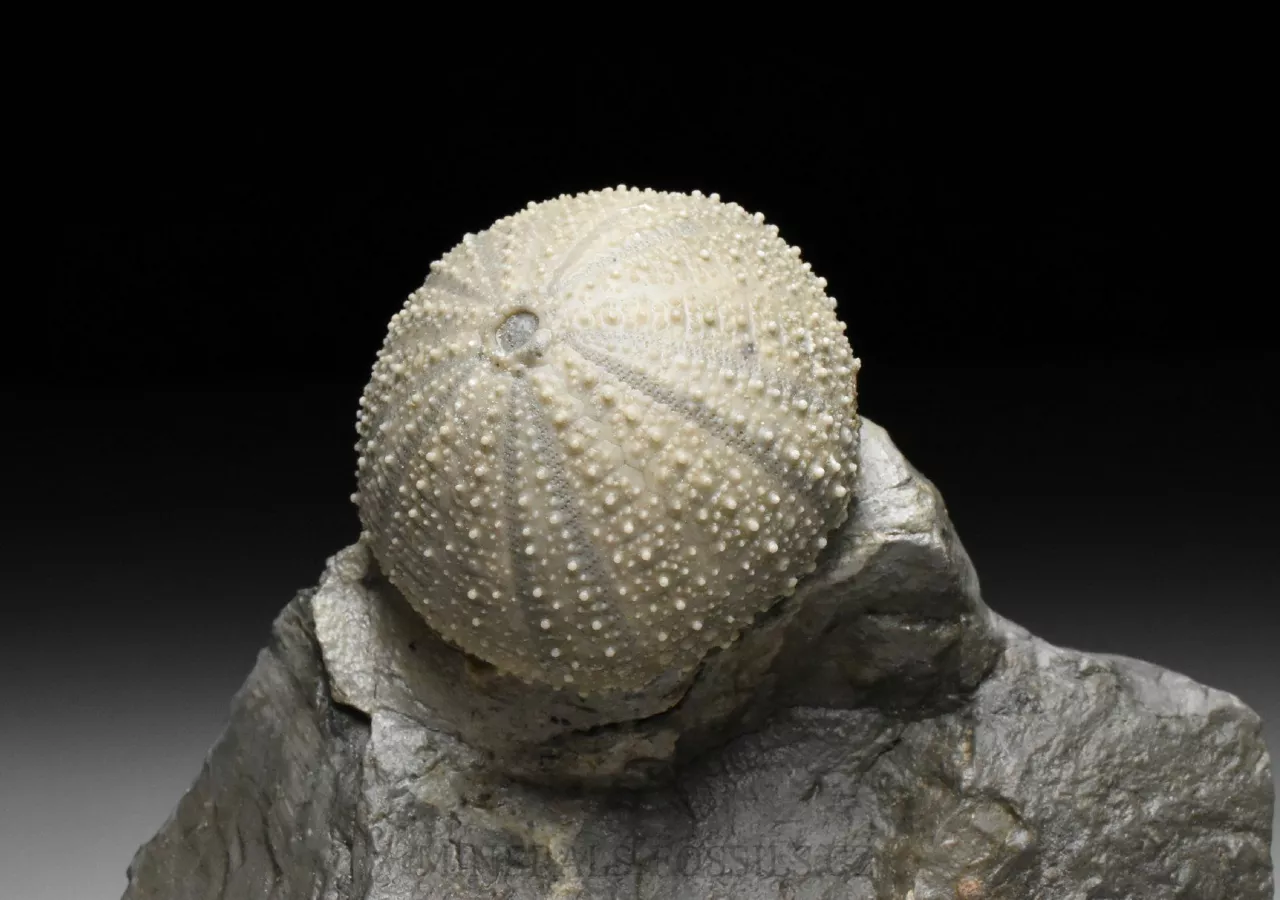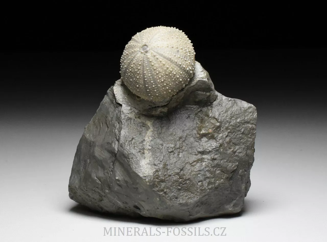 Zkamenělina druhohorní ježovky rodu Stomechinus ze švýcarské svrchní jury. Fosílie pochází z dnes již zaniklé lokality La Rouchenette v severozápadním Švýcarsku, odkud pocházejí překrásné nálezy druhohorních fosílií, zejména mlžů a ježovek. Zachovaní fosílií na této proslulé lokalitě je velice detailní, v podstatě dokonalé. Zkameněliny se zde nacházejí v šedých slínech a k jejich prepraci se často používaly chemické metody (rozpuštění slínů alkalickými činidly), které umožniny zcela šetrné očištění povrchu fosílie od okolní horniny. Tento exemlplář představuje samotnou ježovku (respektive její kompletní kostru o velikost rovných 3 cm) zachovalou přímo v matečné hornině. Kámen je ze spodu zbroušený tak, aby vzorek stál bez stojánku. Světlejší zbarvení horniny kolem ježovky je způsobené chemickou preparací. Celý vzorek má rozměry 8 x 6,5 x 6 cm. Je to sběratelsky velmi cenný kus, jedná o fosílii z dávno zaniklé unikátní lokality a to v samotném Švýcarsku, odkud jsou obecně veškeré přírodniny velmi ceněné. Vzorek pochází ze staré sbírky sbírané cca od roku 1950.