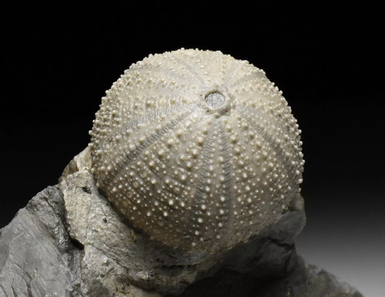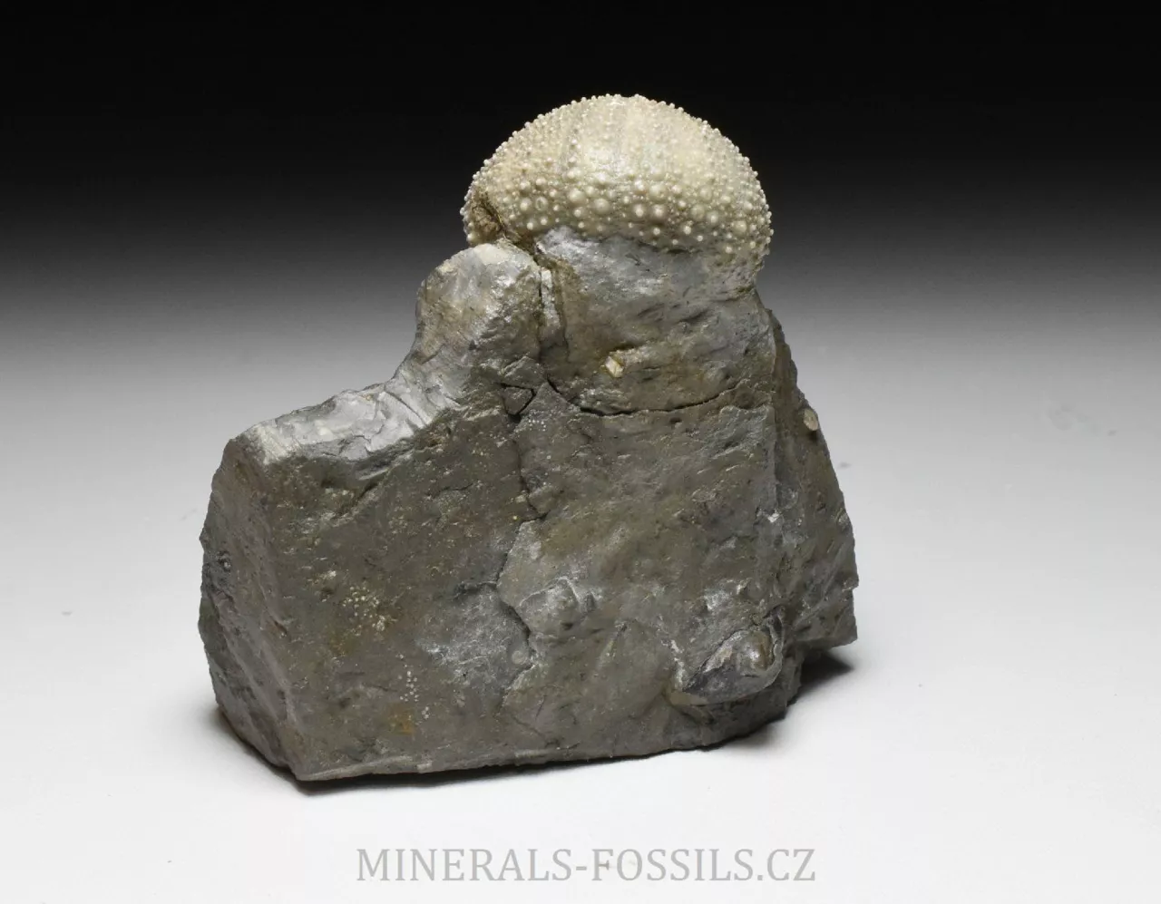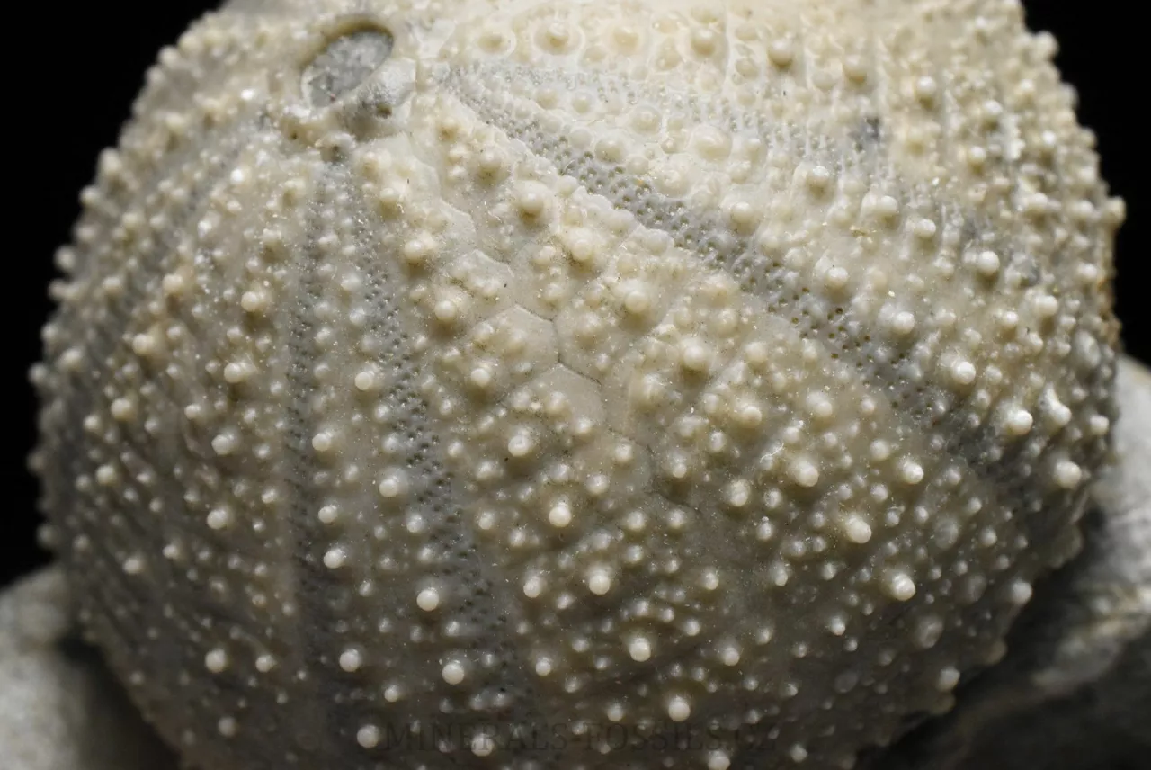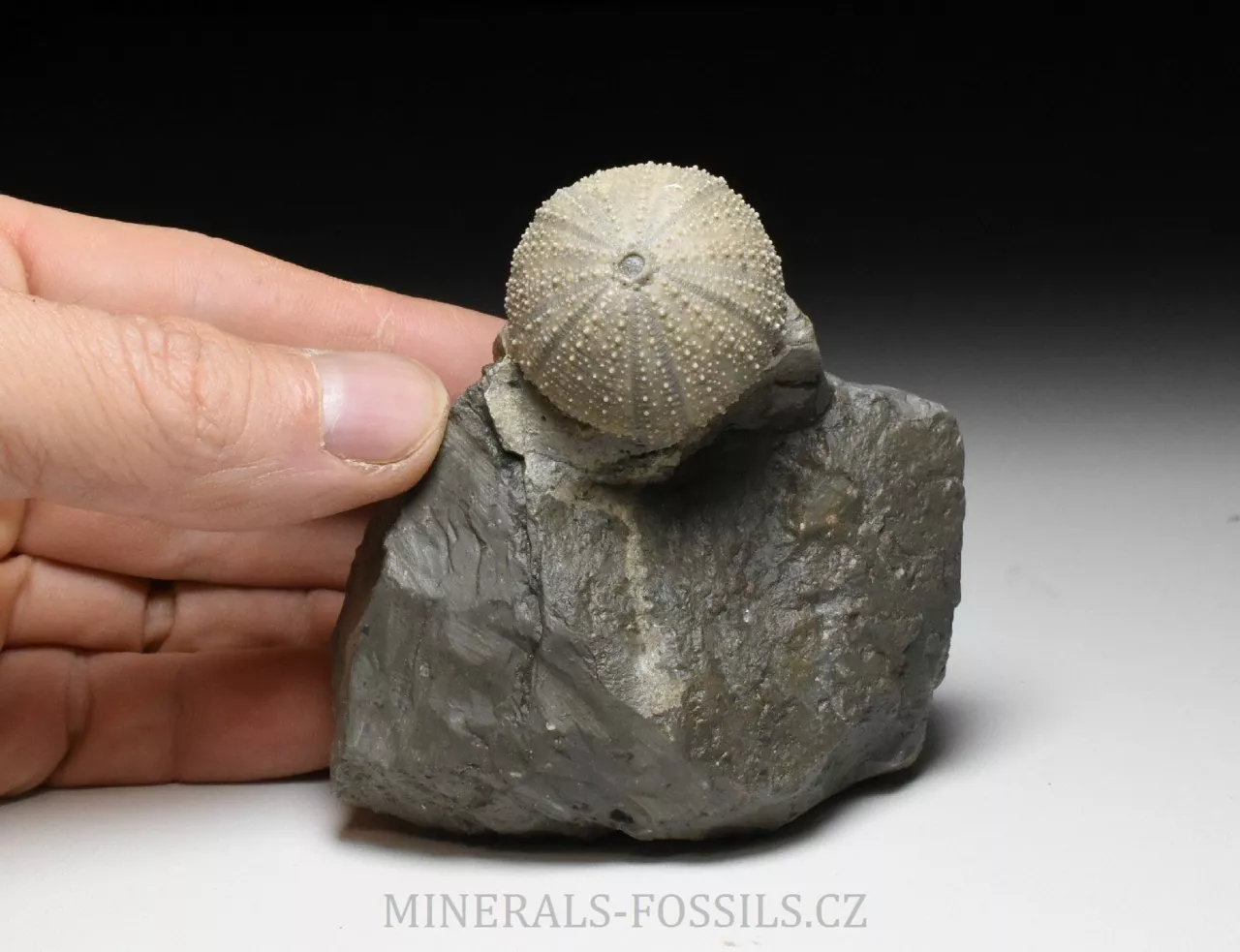 Zkamenělina druhohorní ježovky rodu Stomechinus ze švýcarské svrchní jury. Fosílie pochází z dnes již zaniklé lokality La Rouchenette v severozápadním Švýcarsku, odkud pocházejí překrásné nálezy druhohorních fosílií, zejména mlžů a ježovek. Zachovaní fosílií na této proslulé lokalitě je velice detailní, v podstatě dokonalé. Zkameněliny se zde nacházejí v šedých slínech a k jejich prepraci se často používaly chemické metody (rozpuštění slínů alkalickými činidly), které umožniny zcela šetrné očištění povrchu fosílie od okolní horniny. Tento exemlplář představuje samotnou ježovku (respektive její kompletní kostru o velikost rovných 3 cm) zachovalou přímo v matečné hornině. Kámen je ze spodu zbroušený tak, aby vzorek stál bez stojánku. Světlejší zbarvení horniny kolem ježovky je způsobené chemickou preparací. Celý vzorek má rozměry 8 x 6,5 x 6 cm. Je to sběratelsky velmi cenný kus, jedná o fosílii z dávno zaniklé unikátní lokality a to v samotném Švýcarsku, odkud jsou obecně veškeré přírodniny velmi ceněné. Vzorek pochází ze staré sbírky sbírané cca od roku 1950.