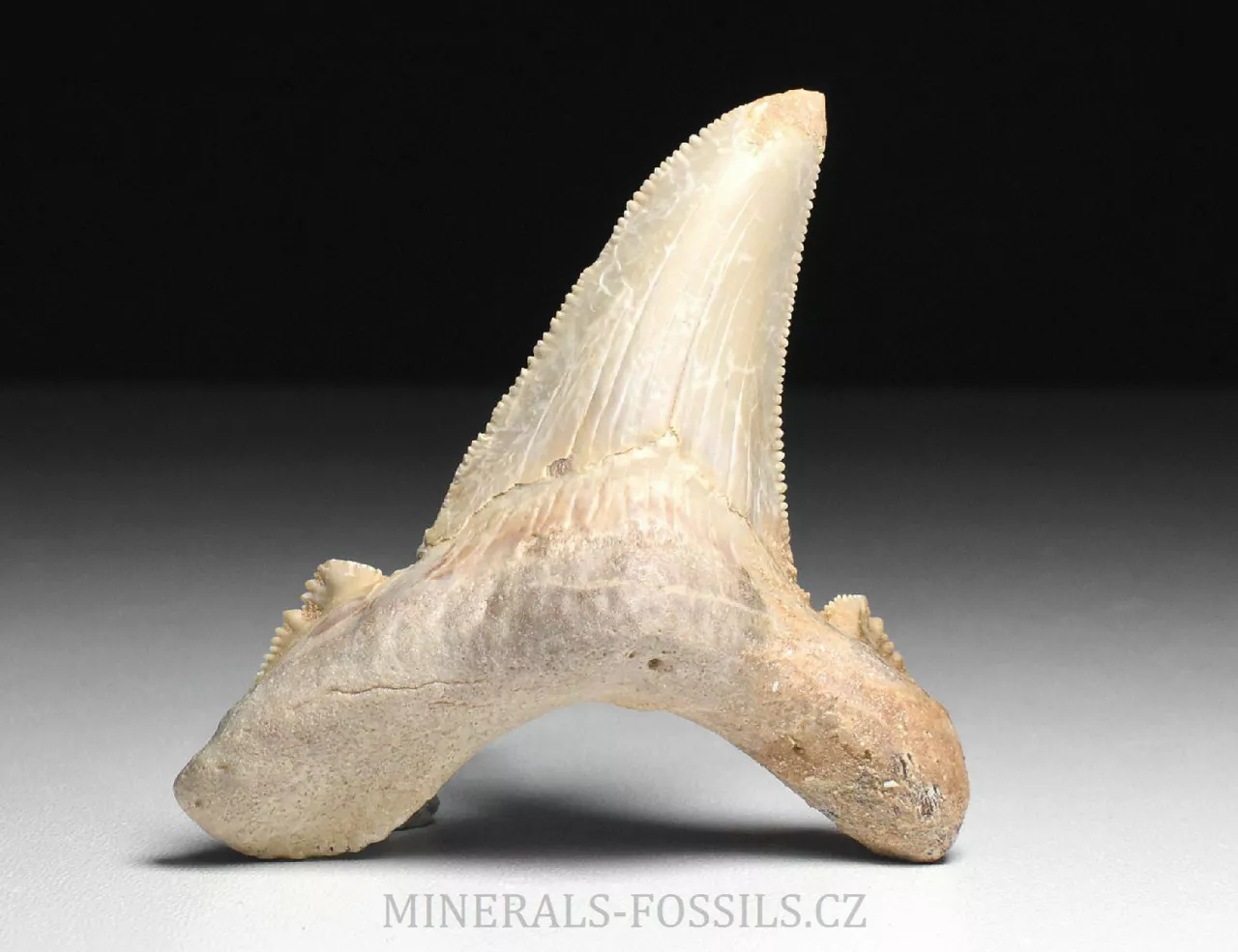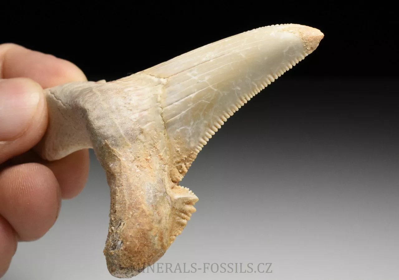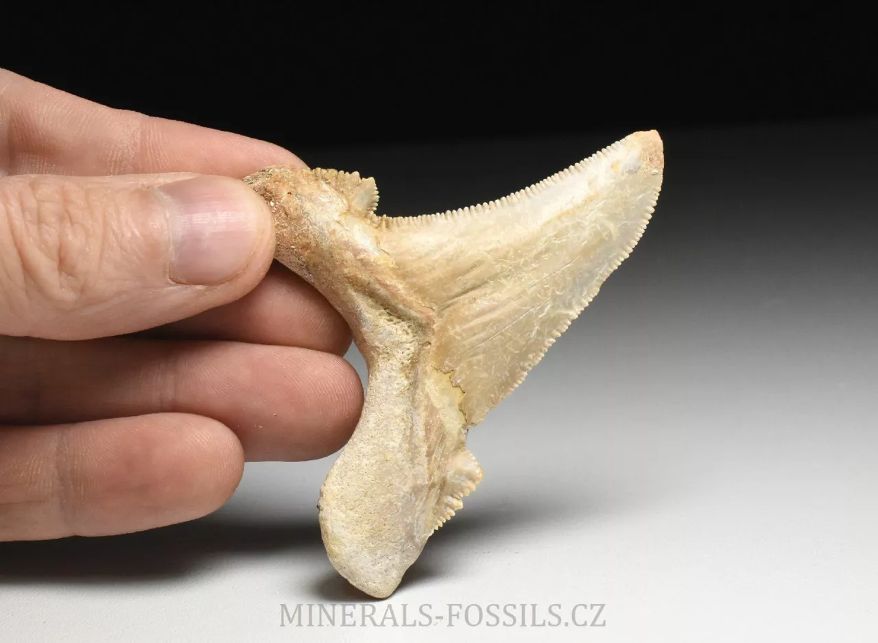 Zkamenělina zubu velikého žraloka z řádu obrounů Otodus sokolovi. Tento vyhynulý rod velkých žraloků obýval moře ve starších třetihorách a podle vědeckých poznatků se jedná o přechodný evoluční článek mezi starším žralokem Otodus obliquus a pozdějším žralokem rodu Carcharochles megalodon. Postupná přeměna v megalodona a zároveň rozdíl oproti druhu O.obliquus je na tomto zubu patrná zejména v podobě pilovitého zakončení hrany zubu. Otodus sokolovi je navíc oproti zubu Otodus obliquus o poznání větší, vyskytuje se později až v mladším eocénu. V Maroku tento zub zcela běžně nazývají jako "Megalodon" a odtud se patrně uchytil i obchodní název "Otodus megalodon", obojí je samozřejmě označení nesprávné. Nález pochází z oblasti Dachla, která se nachází ve vzdálenější oblasti okrajové Sahary (Sahara occidental). Narozdíl od zubů z Khouribgy, tento kus je v ruce nápadně těžší (je tvořen hutnějším a méně porézním materiálem). Tento exemplář je zhruba 6 cm vysoký (tj. jeho výška když je postaven na podložku, jinak nejdelší rozměr na něm naměříme 8 cm). Zub je bez poškození či lepených prasklin, má výborně zachovalý pilovitý okraj, avšak má trošku zvětralý povrch. Zkameněliny z této oblasti jsou mnohem dražší než fosílie z Khouribgy, což je dáno větší vzdáleností od civilizace a absencí průmyslové těžby, která by dostupnost fosílií usnadnila. Zkameněliny se zde sbírají v blízkosti zemského povrchu, proto mají často zvětralý povrch a obsahují četné praskliny, často mohou být v poškozených místech rekonstruované.