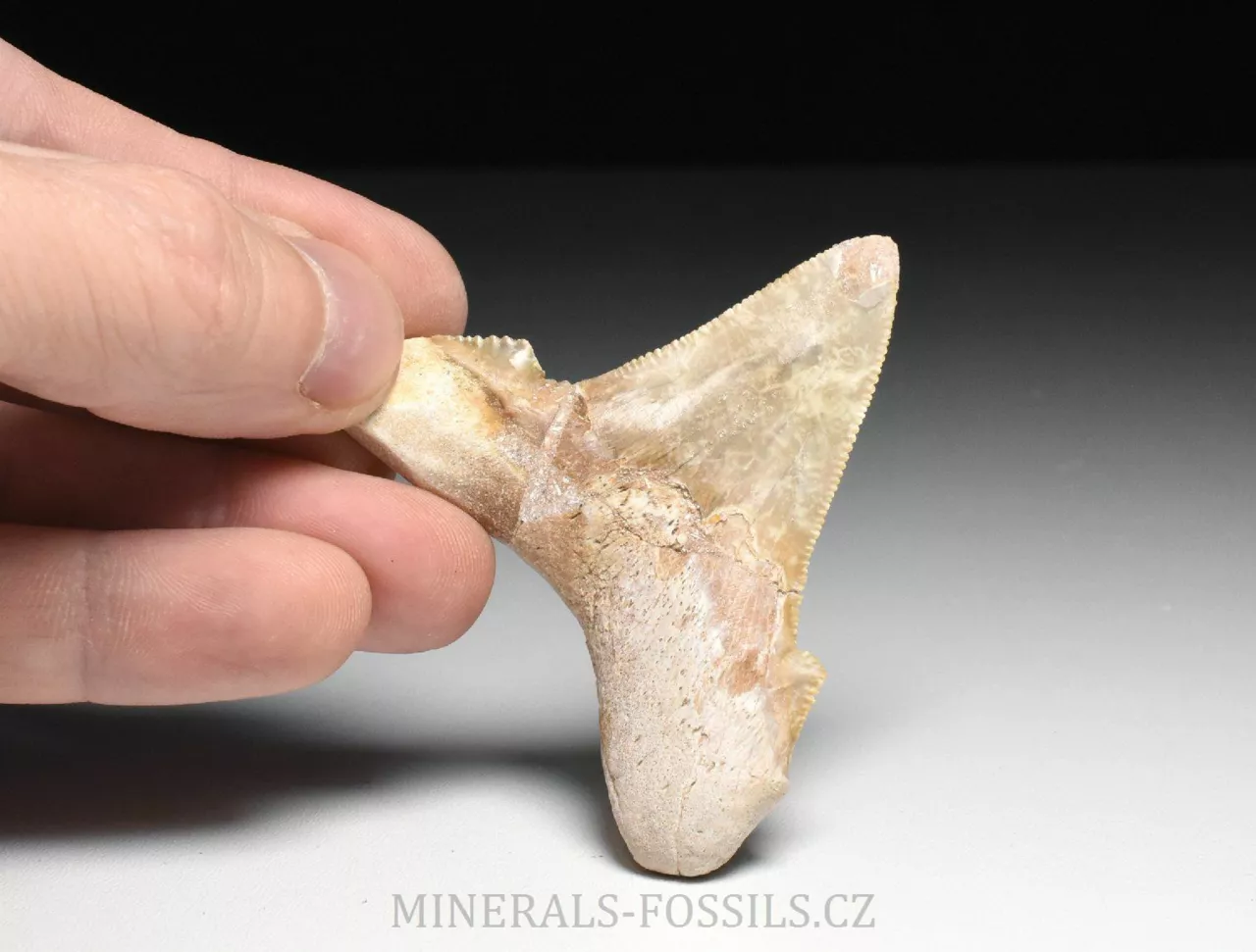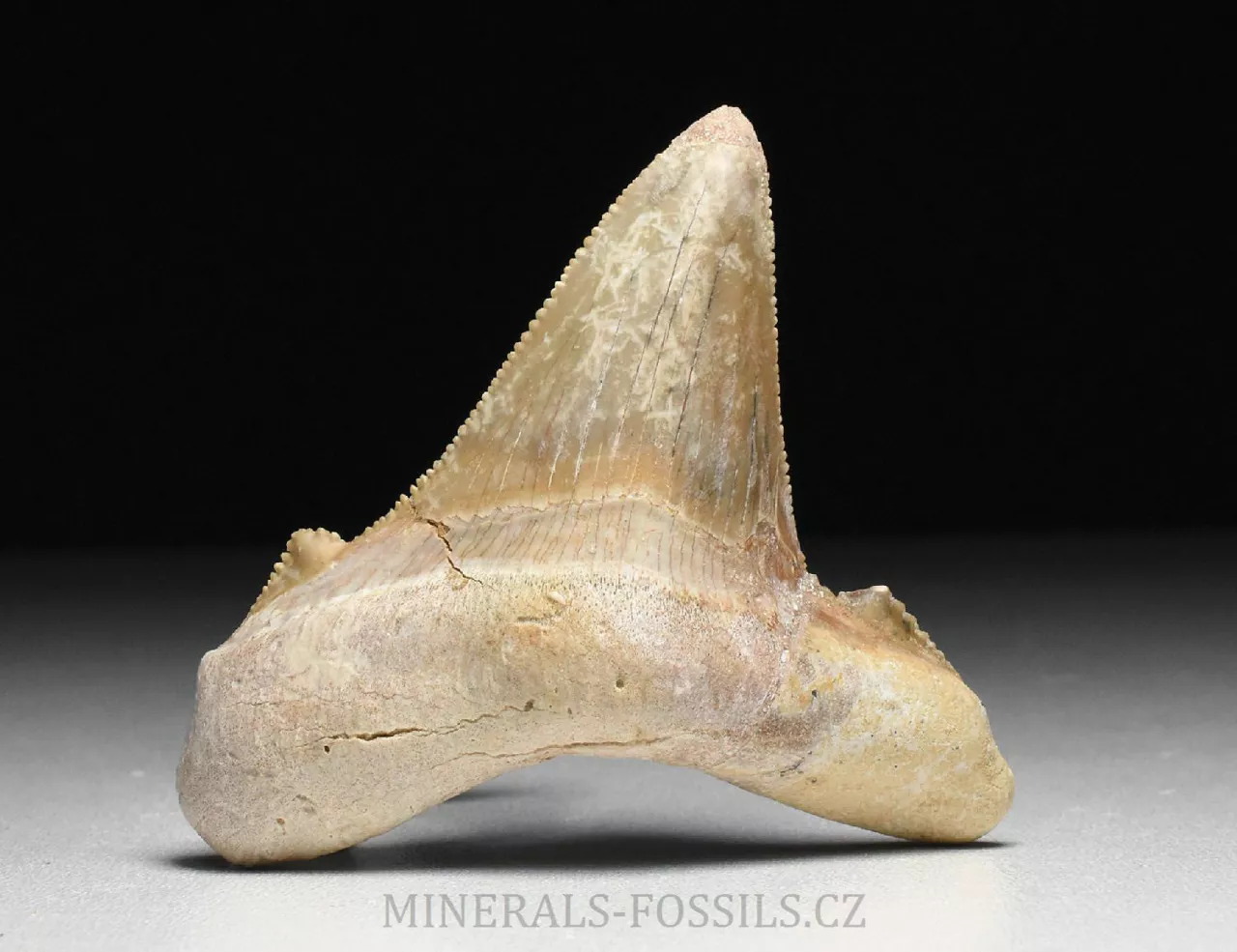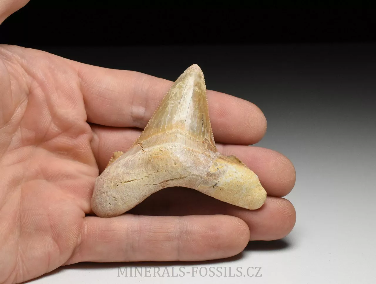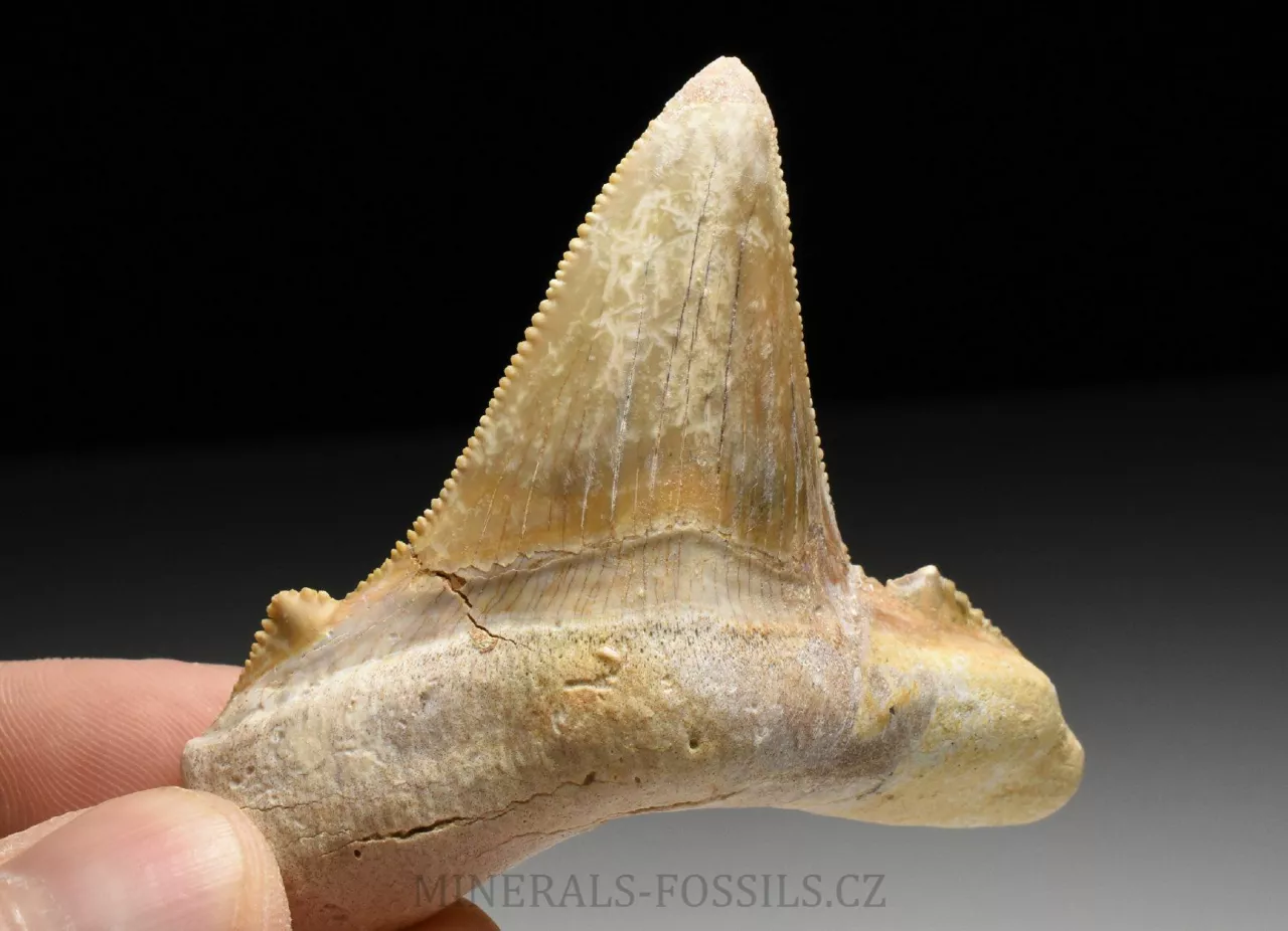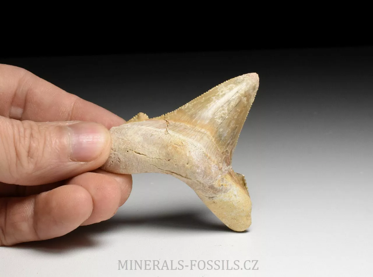 Zkamenělina zubu velikého žraloka z řádu obrounů Otodus sokolovi. Tento vyhynulý rod velkých žraloků obýval moře ve starších třetihorách a podle vědeckých poznatků se jedná o přechodný evoluční článek mezi starším žralokem Otodus obliquus a pozdějším žralokem rodu Carcharochles megalodon. Postupná přeměna v megalodona a zároveň rozdíl oproti druhu O.obliquus je na tomto zubu patrná zejména v podobě pilovitého zakončení hrany zubu. Otodus sokolovi je navíc oproti zubu Otodus obliquus o poznání větší, vyskytuje se později až v mladším eocénu. V Maroku tento zub zcela běžně nazývají jako "Megalodon" a odtud se patrně uchytil i obchodní název "Otodus megalodon", obojí je samozřejmě označení nesprávné. Nález pochází z oblasti Dachla, která se nachází ve vzdálenější oblasti okrajové Sahary (Sahara occidental). Narozdíl od zubů z Khouribgy, tento kus je v ruce nápadně těžší (je tvořen hutnějším a méně porézním materiálem). Tento exemplář je přes 5 cm vysoký, ale jeho šířka je větší, zhruba 6,5cm. Zub je velmi dobře zachovalý včetně ostrého pilovitého okraje, v kořenové části se nachází opravená prasklinka, kterou však sotva rozoznáme. Zkameněliny z této oblasti jsou mnohem dražší než fosílie z Khouribgy, což je dáno větší vzdáleností od civilizace a absencí průmyslové těžby, která by dostupnost fosílií usnadnila. Zkameněliny se zde sbírají v blízkosti zemského povrchu, proto mají často zvětralý povrch a obsahují četné praskliny, často mohou být v poškozených místech rekonstruované.
