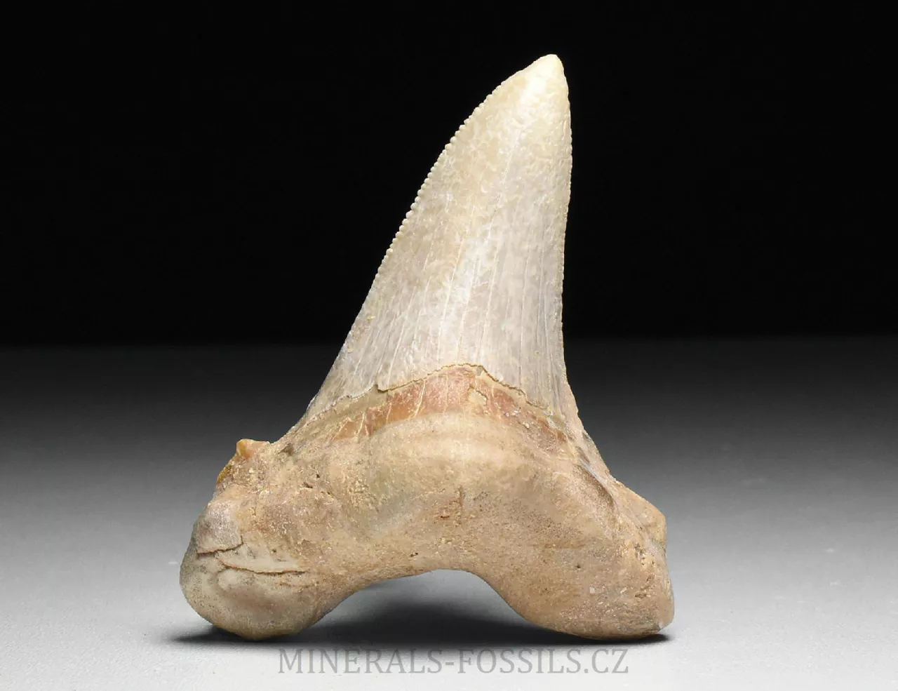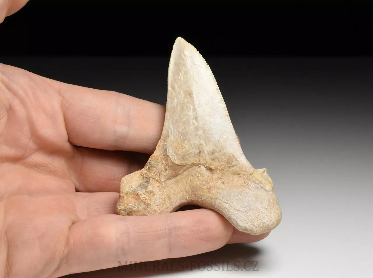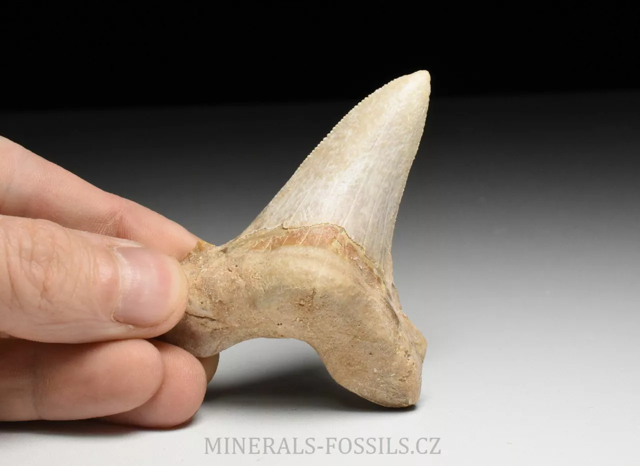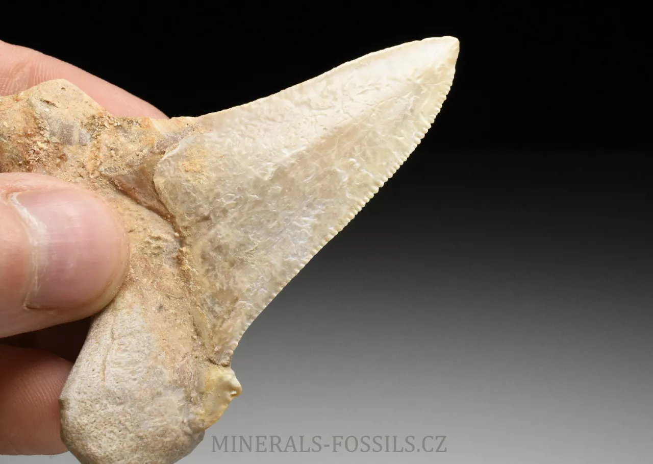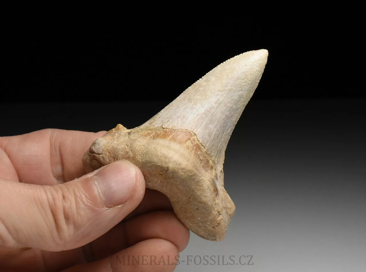 Zkamenělina zubu velikého žraloka z řádu obrounů Otodus sokolovi. Tento vyhynulý rod velkých žraloků obýval moře ve starších třetihorách a podle vědeckých poznatků se jedná o přechodný evoluční článek mezi starším žralokem Otodus obliquus a pozdějším žralokem rodu Carcharochles megalodon. Postupná přeměna v megalodona a zároveň rozdíl oproti druhu O.obliquus je na tomto zubu patrná zejména v podobě pilovitého zakončení hrany zubu. Otodus sokolovi je navíc oproti zubu Otodus obliquus o poznání větší, vyskytuje se později až v mladším eocénu. V Maroku tento zub zcela běžně nazývají jako "Megalodon" a odtud se patrně uchytil i obchodní název "Otodus megalodon", obojí je samozřejmě označení nesprávné. Nález pochází z oblasti Dachla, která se nachází ve vzdálenější oblasti okrajové Sahary (Sahara occidental). Narozdíl od zubů z Khouribgy, tento kus je v ruce nápadně těžší (je tvořen hutnějším a méně porézním materiálem). Tento exemplář je už poměrně velký, jeho výška je téměř 7 cm a šířka činí 6 cm. Zub je na poměry dané lokality relativně dobře zachovalý, ale jeho povrch je mírně zvětralý. Pilovitý okraj je částečně zachovalý, ale stále velmi zřetelný. V dolní (kořenové části) se je zub maličko opravovaný (na dvou místech), ale na první pohled tyto opravy jen stěží rozeznáme od původního materiálu. Zkameněliny z této oblasti jsou mnohem dražší než fosílie z Khouribgy, což je dáno větší vzdáleností od civilizace a absencí průmyslové těžby, která by dostupnost fosílií usnadnila. Zkameněliny se zde sbírají v blízkosti zemského povrchu, proto mají často zvětralý povrch a obsahují četné praskliny, často mohou být v poškozených místech rekonstruované.