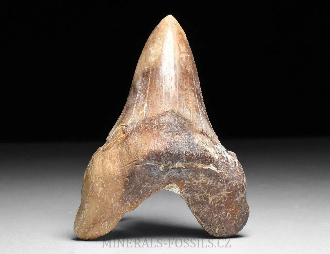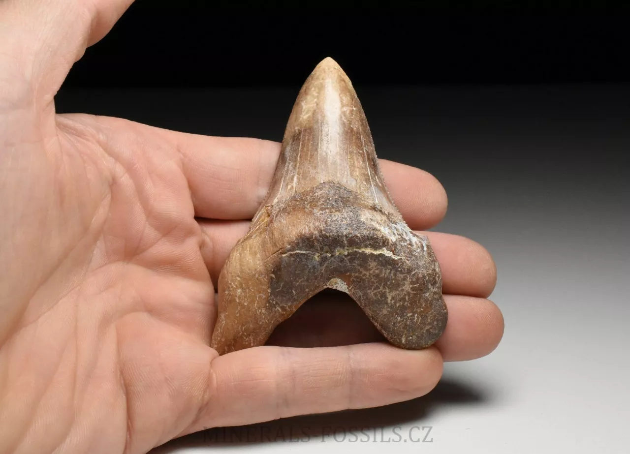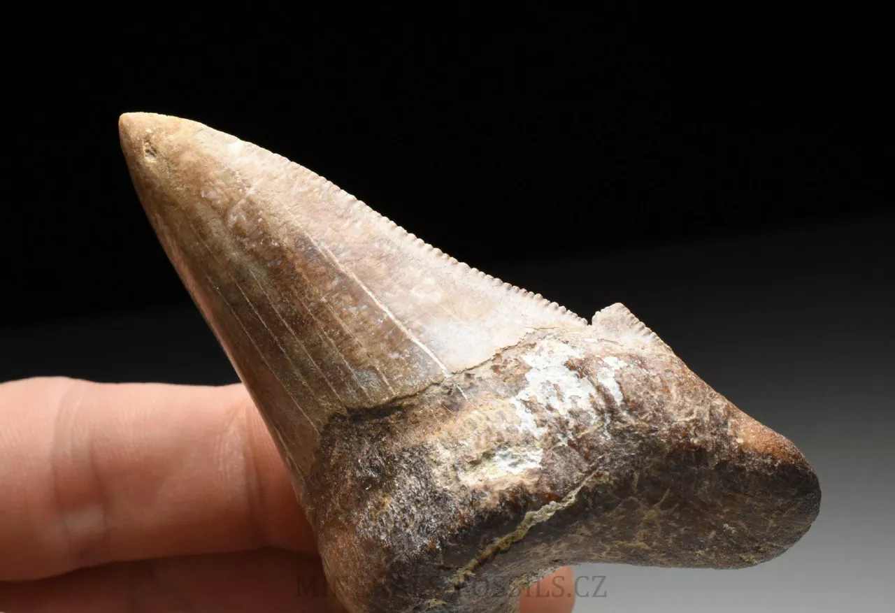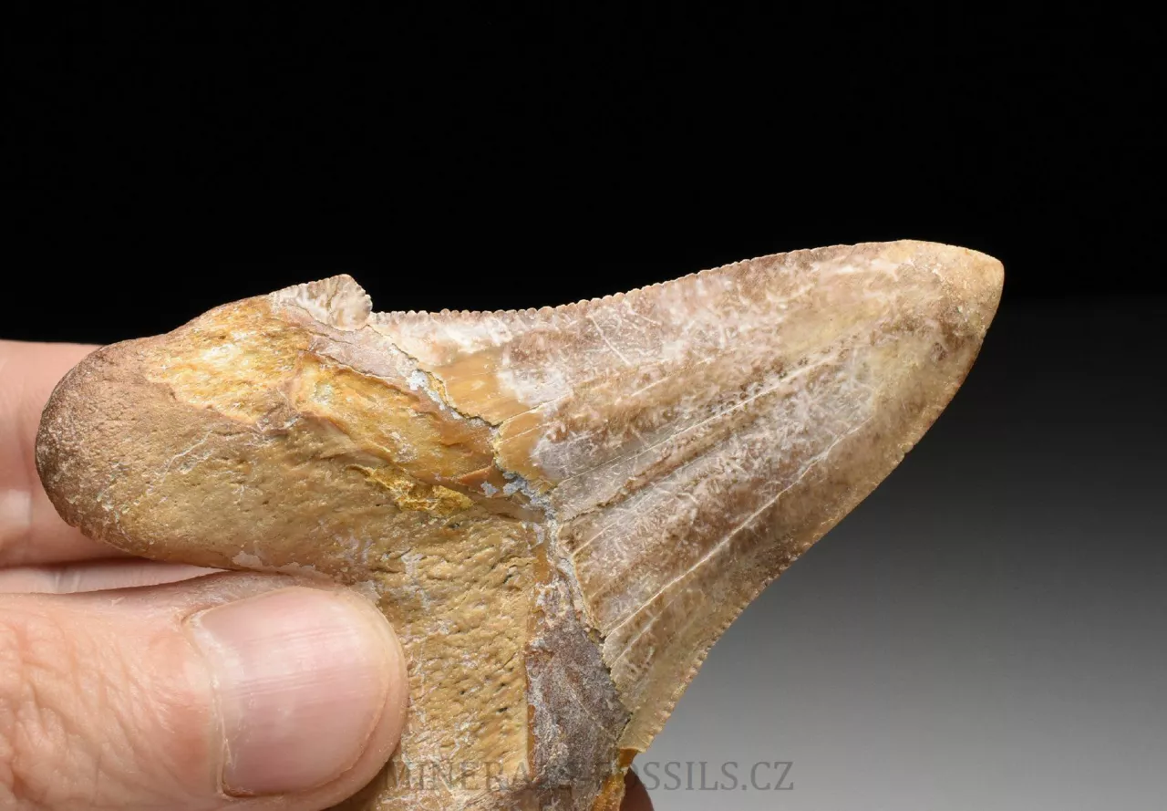 Zkamenělina zubu velikého žraloka z řádu obrounů Otodus sokolovi. Tento vyhynulý rod velkých žraloků obýval moře ve starších třetihorách a podle vědeckých poznatků se jedná o přechodný evoluční článek mezi starším žralokem Otodus obliquus a pozdějším žralokem rodu Carcharochles megalodon. Postupná přeměna v megalodona a zároveň rozdíl oproti druhu O.obliquus je na tomto zubu patrná zejména v podobě pilovitého zakončení hrany zubu. Otodus sokolovi je navíc oproti zubu Otodus obliquus o poznání větší, vyskytuje se později až v mladším eocénu. V Maroku tento zub zcela běžně nazývají jako "Megalodon" a odtud se patrně uchytil i obchodní název "Otodus megalodon", obojí je samozřejmě označení nesprávné. Nález pochází z oblasti Dachla, která se nachází ve vzdálenější oblasti okrajové Sahary (Sahara occidental). Narozdíl od zubů z Khouribgy, tento kus je v ruce nápadně těžší (je tvořen hutnějším a méně porézním materiálem). Tento exemplář je poměrně veliký, jeho výška je 7,5 cm. Zub je masivní a těžký, dosti připomíná zmíněného Megalodona. Exemplář je na poměry dané lokality dobře zachovalý včetně pilovitého okraje po obou stranách, povrch je nepatrně postižen zvtrávacími procesy, přesto je přirozeně slabě lesklý. Zub nemá žádné zřetelně viditelné opravované praskliny. Zkameněliny z této oblasti jsou mnohem dražší než fosílie z Khouribgy, což je dáno větší vzdáleností od civilizace a absencí průmyslové těžby, která by dostupnost fosílií usnadnila. Zkameněliny se zde sbírají v blízkosti zemského povrchu, proto mají často zvětralý povrch a obsahují četné praskliny, často mohou být v poškozených místech rekonstruované.
