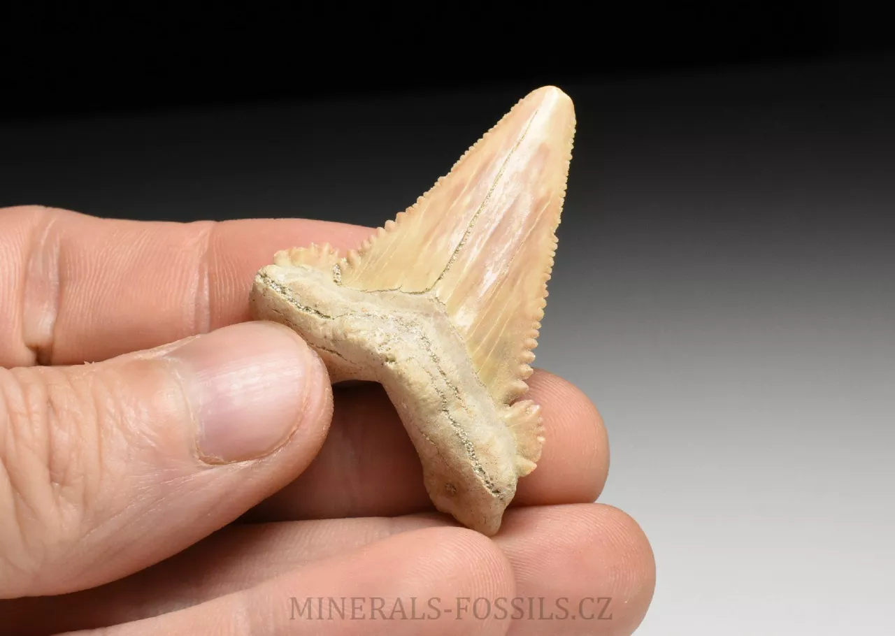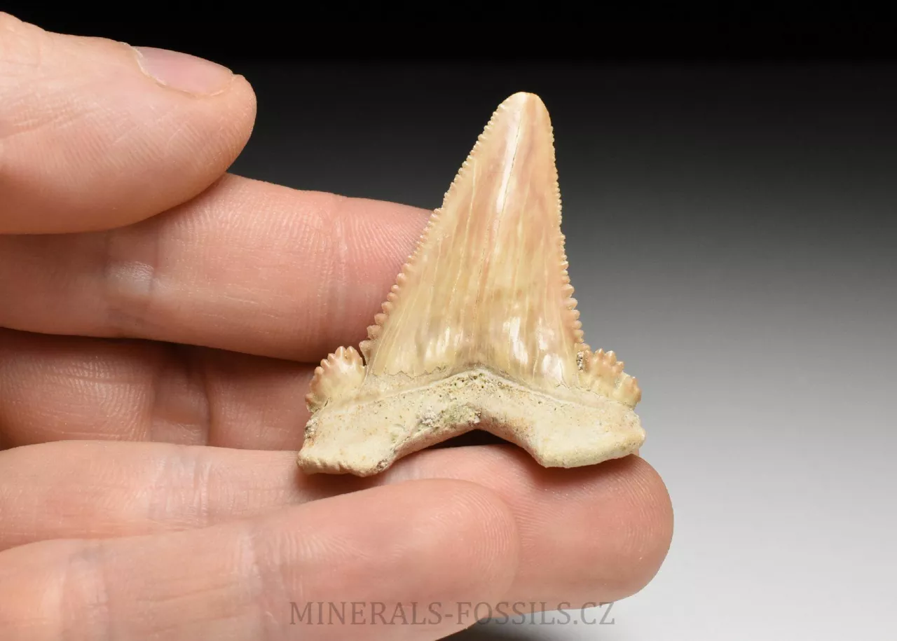 Zkamenělina zubu vyhynulého druhu žraloka rodu Palaeocarcharia orientalis. Tento druh žraloka z čeledi obrounů je označován názvem Trpasličí bílý žralok a je podle všeho přímým předchůdcem dnešního žraloka bílého. Zkamenělina pochází z dolů v okolí města Khouribga v Maroku, kde se těží fosfátové sedimenty uložené na přelomu druhohor a třetihor. Jedinými fosilními pozůstatky žraloků jsou jejich fosilní zuby, případně obratle, jiné části těla však byly příliš měkké na to, aby se mohli uchovat v horninách. Tento druh fosilních zubů patří mezi vzácnější fosílie z tohoto naleziště. Zuby těchto žraloků mají tvar vysokého trojúhelníku se zřetelně pilovitým okrajem (někdy je zub šavlovitě zahnutý - záleží na tom, o který zub ze žraločí čelisti se jedná) se dvěma méně výraznými pazoubky po stranách. Tento exemplář je poměrně velký, jeho rozměry jsou zhruba 4,2 x 3,7 cm. zachovaní je naprosto výborné, bez jediného poškození. Špička tohoto zubu je přírodně ztupená (zřejmě vitální opotřebení během života žraloka), pilovitý okraj je zcela nepoškozený a ostrý.